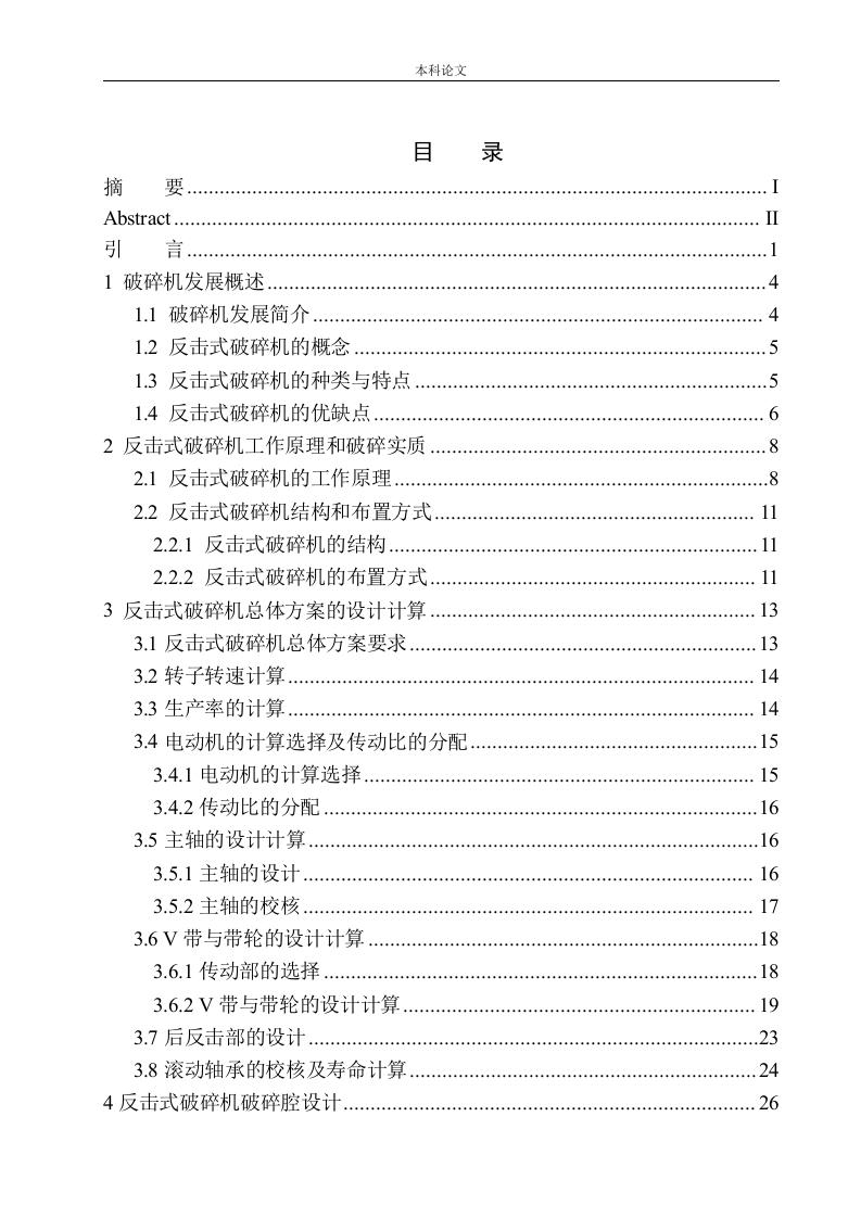 本科论文目录摘要........Abstract.…引言1破碎机发展概述41.】破碎机发展简介…1.2反击式破碎机的概念1.3反击式破碎机的种类与特点…1.4反击式破碎机的优缺点..62反击式破碎机工作原理和破碎实质.82.1反击式破碎机的工作原理82.2反击式破碎机结构和布置方式.…112.2.1反击式破碎机的结构2.2.2反击式破碎机的布置方式113反击式破碎机总体方案的设计计算...133.1反击式破碎机总体方案要求133.2转子转速计算.…143.3生产率的计算143.4电动机的计算选择及传动比的分配3.4.1电动机的计算选择153.4.2传动比的分配…3.5主轴的设计计算.163.5.1主轴的设计.…163.5.2主轴的校核173.6V带与带轮的设计计算183.6.1传动部的选择.3.6.2V带与带轮的设计计算193.7后反击部的设计233.8滚动轴承的校核及寿命计算244反击式破碎机破碎腔设计.26本科论文4.1破碎腔结构参数.264.2反击板设计…294.3反击板悬挂装置305其他零件选择335.1电机的选择335.2键的选择335.3密封与防尘设计33335.5润滑336部分零部件上的公差和配合346.1配合的选择6.2一般公差的选取346.3形位公差.34结论36参考文献.37致谢本科论文摘要在一个现代化的经济国家建设中,水泥等原材料和基础型水泥原材料在其基础产业中一直占据着至关重要的作用和位置。当前,由于我国经济正迈入经济繁荣发展的新时代,新型基建类设施的建设仍是国内经济各类投资份额中最主要的投资方式之一。因此,每年都生产出大量的基建原材料和需要回收利用的工业废料,例如水泥,花岗岩等,需要进行工业粉碎和处理。因此需要按照其需求进行选择合适的破碎材料和设备,破碎机的种类主要将破碎机分为七种:圆锥式破碎机,冲击式破碎机,锤式破碎机,颚式破碎机,反击式破碎机,复合式破碎机,回式水泥破碎机等,综合了分析与设计的考量,选用了反击式水泥破碎机作为本次破碎机设计的目标,其特点是可对于不同破碎粒度的各种基础性水泥原材料方便地进行破碎。本次的设计基于如何节省所用材料,功能性好,机身整洁,外观简约等几大设计重点方面。在本次设计的过程中,通过最高限度要求转子给料粒度的方法来设计该转子的径长以及其长度,进而将破碎机的转子轴进行设计,并通过其转子的工作旋转速度大小和其给料直径长度等弯扭强度参数进行校验。其次我们初步进行了反击式破碎腔的设计,主要是设计一、二级的反击板。本次设计实验优先考虑了反击式破碎机各个反击板截面尽量达到接近其转子的外圆渐开线的方程,同时考虑是否符合破碎机反击板的设计和制造工艺要求。然后在设计好破碎机反击板的位置后,进而初步确定反击式破碎腔里其它机械机械零件的弯扭强度参数和其尺寸。再通过反击式破碎腔的整体结构和根据转子旋转速度的要求来计算如何减轻反击式破碎机的重量提高生产利用效率并合理地选择,最终设计完成新型反击式破碎机的内部整体结构设计。关键词:新型反击式破碎机;转子;反击式破碎腔:反击板