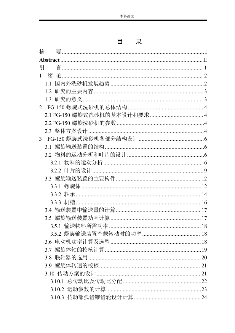 本科论文目录摘要.............Abstract...........引言11绪论1.1国内外洗砂机发展趋势1.2研究的主要内容1.3研究的意义32FG-150螺旋式洗砂机的总体结构42.1FG-150螺旋式洗砂机的基本设计和要求2.2FG-150螺旋洗砂机的参数2.3整体方案设计..3FG-150螺旋式洗砂机各部分结构设计3.1螺旋输送装置的结构63.2物料的运动分析和叶片的设计63.2.1物料的运动分析63.2.2叶片的设计…3.3螺旋输送装置的主要构件123.3.1螺旋体3.3.2轴承143.3.3机槽…163.4输送装置中输送量的计算.…173.5螺旋输送装置功率计算173.51输送物料所需功率…83.5.2螺旋输送装置空载转动时的功率183.6电动机功率计算及选型183.7螺旋体轴的校核计算444444444444444444444444193.8联轴器的选用203.9螺旋体转速的校核213.10传动方案的设计.213.10.1总传动比及传动比分配223.10.2运动参数的计算233.10.3传动部弧齿锥齿轮设计计算..…24本科论文3.10.4中速级斜齿圆柱齿轮设计计算293.10.5圆环链链轮的设计计算35结论…38致谢39参考文献…本科论文摘要螺旋式洗砂机是一种用来将泥沙里面的人们所需要的砂石筛选出来的机械。筛选出来的砂石再进行清洗,最后可以得到人们想要的砂。螺旋洗砂机给人们带来很大的方便,它的洗砂能力强,本身的螺旋体长,这样洗砂的行程长,密封性好,简单操作,处理简单,维修方便,洗刷效率比人工效率高等特点。螺旋洗砂机在工作时主要通过电机驱动主轴,主轴上安装螺旋叶片进行洗砂。螺旋叶片是旋转螺旋式的,所以又称为螺旋洗沙。它的内部结构有驱动电机,中心轴,螺旋叶片和支架组成;支架可以直接焊接在中心轴的外形架上。目前国内外螺旋洗砂机的发展非常迅速,尤其是各种大型洗砂机层出不穷,螺旋洗砂机本身是一种结合国内外技术进行改良的产品,与传统洗砂机相比具有很大的优势。但目前的螺旋洗砂机存在着以下缺点,比如说螺旋洗砂机的运转噪音比较大、效率不够高、产量不够大、在洗刷过程中洗出来的沙子,砂石质量标准有待提高。本次设计此基础上进行筛料口调整,排料开口调整等工艺改进外,还加大了螺旋洗砂机的行程,使砂石在高速旋转中形成更细小的砂石,能够达到更大产量的目的。确定螺旋洗砂机基本结构后,确定它的设计路线,驱动系统,传动系统,主轴计算,叶片合理计算,齿轮齿条,链轮链条设计计算。确定工作运行路线,查阅资料从而得到合适的参数来进行初步设计。详细地说明了该螺旋洗砂机的结构特点和整个洗砂过程中的原理,并对该螺旋洗砂机中各部件进行设计、并对各个结构进行计算和校核,己达到满足需求的目的。关键词:洗砂机;螺旋叶片;齿轮传动:PLC控制