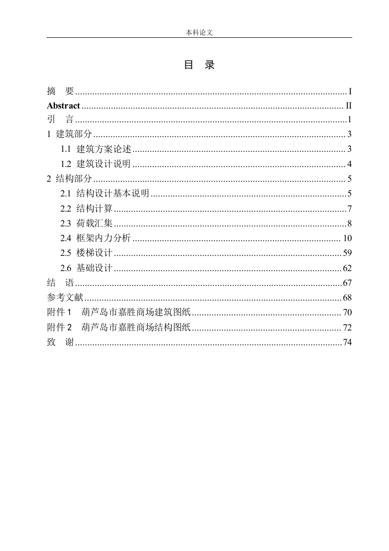 本科论文目录摘要Abstract..引言1建筑部分.…31.1建筑方案论述1.2建筑设计说明2结构部分2.1结构设计基本说明2.2结构计算72.3荷载汇集82.4框架内力分析102.5楼梯设计592.6基础设计6267参考文献.…68附件1葫芦岛市嘉胜商场建筑图纸70附件2葫芦岛市嘉胜商场结构图纸72本科论文摘要本设计为葫芦岛市嘉胜商场建筑结构设计。建筑总面积4584.9m2。本设计主要对葫芦岛市嘉胜商场进行建筑和结构设计。本课题采用四层框架结构,抗震设防为6度,场地类别为Ⅱ类场地,基本的风压0.55kW/M。建筑规划主要依据与建筑使用功能、消防疏散和人性化相关的任务描述要求进行设计,主要任务是:功能分区、空间组合和设计图。设计内容以建筑设计规范为基础,设计包括两部分:第一部分为建筑设计,主要是商场的形状设计,即总平面的布局,建筑平、立和剖设计。在平面设计中,考虑到抗震和防火的要求,采用矩形。在进行立面的设计时,商场建筑物的属性主要是使装饰简单典雅。第二部分是结构设计,即结构语言,它表达了结构的内容,是对结构元素的细化和简化,依据弹性理论,采用分层工程的竖向荷载计算方法,对框架柱、结构楼梯进行设计。关键词:土木工程:商场:框架结构;建筑设计:结构设计本科论文AbstractThis design is the architectural structure design of Jiasheng Mall in HuludaoCity.It covers an area of 1106m2 and a construction area of 4584m2.Mainly carryout architectural design,structural design and construction organization design.Theframe structure is adopted,the main body is four floors,and the roof of the roof ofthe roof is one floor.Class VI seismic fortification area,class II site,basic windpressure0.55knM。Architectural planning is mainly designed according to the task descriptionrequirements related to building use function,fire evacuation andhumanization,The main tasks are:functional partition,space combination anddesign drawing.The design content is Based on the architectural design code,the designconsists of architectural design,architectural design,architectural design,graphicdesign and facade.In the graphic design,considering the fire and seismic designrequirements of the building facade,considering the characteristics of the mall,thedecoration is simple and generous.The second part is structural design,that is,language expression.It is the design of frame column,stair structure andfoundation in the art design Including the elastic theory of frame column structure.Keywords:Architectural Design;Structural Design;Construction Organization