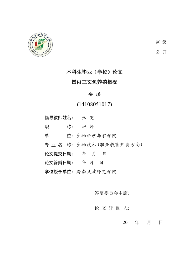 密级公开本科生毕业(学位)论文国内三文鱼养殖概况安琪(14108051017)指导教师姓名:张雯职称:讲师单位:生物科学与农学院专业名称:生物技术(职业教育师资方向)论文提交日期:年月日论文答辩日期:年月日学位授予单位:黔南民族师范学院答辩委员会主席:论文评阅人:20年月日目录1.1三文鱼的概况1.1.1三文鱼的简介1.1.2三文鱼生活习性及属性…41.1.3三文鱼繁殖方式…1.2国内主要的三文鱼养殖企业41.3我国三文鱼养殖品种简述…2国内三文鱼的常规养殖技术…52.1常规养殖技术…52.1.1三文鱼的苗种繁育…53国内三文鱼市场销售分析.…4国内三文鱼养殖与国外存在的差距64.1专业化生产的问题64.2养殖数量的问题4.3饲料使用的问题…74.4科学管理的问题.74.5谨慎用药.85结语…85.1水质及水温85.2鱼种.85.3饲料…85.4着色.85.5密度与网箱85.6生物安全管理…85.7冬季饲养…95.8屠宰及初加工.9国内三文鱼的养殖概况安琪(14108051017)(黔南民族师范学院生命科学与农学院,贵州都匀558000)摘要:伴随世界经济的进步与民众生活质量的提升,三文鱼世界市场需求持续增加,促使政府与渔民的经济效益得到提高,生产规模也持续护张,产量与产值提高的时候,也存在一些严重的环境问题。因此,加强三文鱼的渔业管理,探索新的更健康的养殖模式成为当下三文鱼养殖业发展的关键一步。本文基于对国内外三文鱼养殖产业的调研调查,提出国内三文鱼养殖模式存在的不足,为建立健康高效三文鱼养殖产业提供一定的理论基础。关键词:三文鱼:渔业管理:养殖模式Analysis of Breeding of domestic salmonAnQi(14108051017)(College of Biological Science and Agriculture,QianNan Normal University for Nationalities,Duyun558000,Guizhou)Abstract:With the development of global economy and the improvement of people's living standards,salmon,increasinglyintense international market demand,increasing the government's economic interests and fishermen,the production scaleexpands unceasingly,also along with the increase of the yield and output value,there are some serious environmentalproblems.Therefore,to strengthen the fishery management of salmon and explore new and healthier breeding mode becomesa key step in the development of salmon breeding industry.In this paper,based on the research survey of salmon farmingindustry at home and abroad,put forward the deficiency existing in domestic salmon farming pattern,to establish a healthyand efficient salmon farming industry provide certain theoretical basisKey words:Salmon;fisheries;management;model
