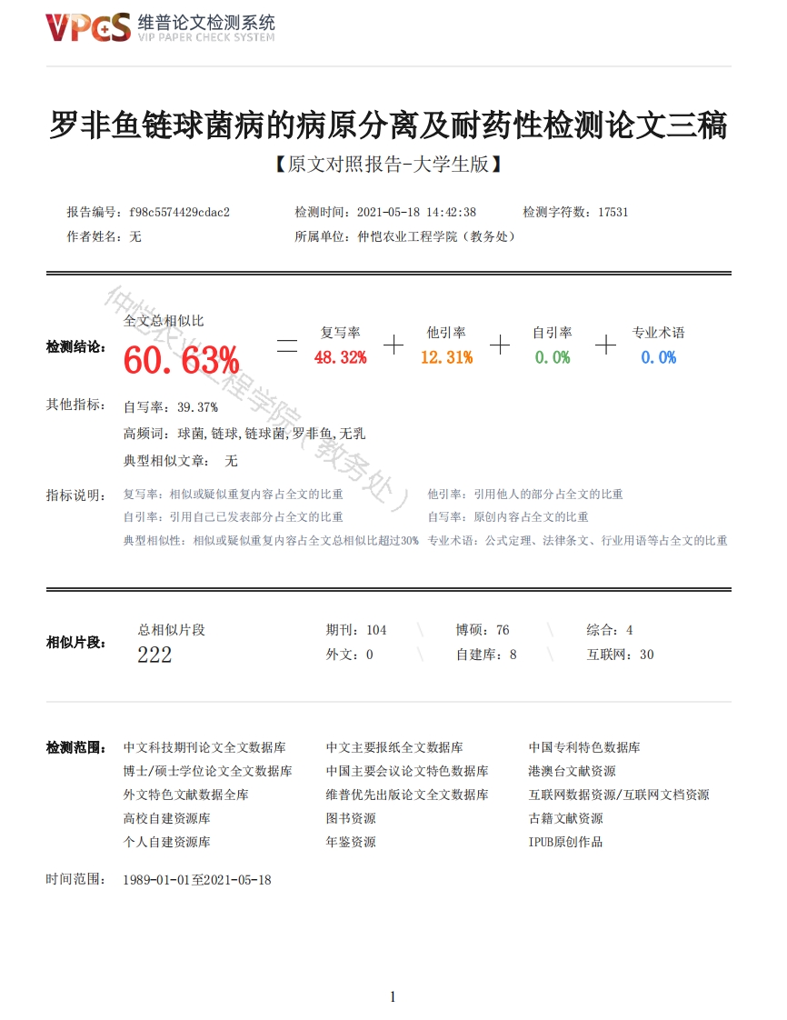 维普论文检测系统/IP PAPER CHECK SYSTEM罗非鱼链球菌病的病原分离及耐药性检测论文三稿【原文对照报告-大学生版】报告编号:f98c5574429cdac2检测时间:2021-05-1814:42:38检测字符数:17531作者姓名:无所属单位:仲恺农业工程学院(教务处)全文总相似比复写率他引率自引率专业术语检测结论:60.63%48.32%12.31%0.0%0.0%其他指标:自写率:39.37%高频词:球菌,链球,链球菌,罗非鱼,无乳典型相似文章:无指标说明:复写率:相似或疑似重复内容占全文的比重他引率:引用他人的部分占全文的比重自引率:引用自己已发表部分占全文的比重自写率:原创内容占全文的比重典型相似性:相似或疑似重复内容占全文总相似比超过30%专业术语:公式定理、法律条文、行业用语等占全文的比重总相似片段期刊:104博硕:76综合:4相似片段:222外文:0自建库:8互联网:30检测范围:中文科技期刊论文全文数据库中文主要报纸全文数据库中国专利特色数据库博士/硕士学位论文全文数据库中国主要会议论文特色数据库港澳台文献资源外文特色文献数据全库维普优先出版论文全文数据库互联网数据资源/互联网文档资源高校自建资源库图书资源古籍文献资源个人自建资源库年鉴资源IPUB原创作品时间范围:1989-01-01至2021-05-18维普论文检测系统VIP PAPER CHECK SYSTEM原文对照颜色标注说明:■自写片段■复写片段(相似或疑似重复)口引用片段(引用)■专业术语(公式定理、法律条文、行业用语等)仲恺农业工程学院本科生毕业论文(设计)仲恺农业工程学院毕业论文姓名张杨婉院(系)动物科技学院专业班级水产171学号201721824131指导教师苏友禄职称/职务教授论文答辩日期仲恺农业工程学院教务处制Isolation of tilapia streptococcus strains and detection of drug resistanceZhangYangwanCollege of Animal Science and Technology Zhongkai University of Agriculture and EngineeringGuangzhou,ChinaSupervisor:Prof.Su Youlu学生承诺书“本人郑重承诺:所呈交的毕业论文(设计)是本人在导师的指导下独立进行研究所取得的成果。除了文中已用特别标志加以标记的引述内容之外,本论文(设计)不含有任何其他个人或集体已经发表或撰写的研究成果。对本文研究做出过重要贡献的个人或集体,均已在文中以明确的方式标明。若在毕业论文(设计)的各项检查、评比中被发现有抄袭、剽窃或其他的违规行为,本人愿按学校有关规定接受处理,并承担相应的法律责任”。学生(签名):2021年3月19日摘要链球菌病严重影响着罗非鱼养殖业的持续健康发展,造成巨大的经济损失。本实验主要通过对采集的罗非鱼样品进行菌株分离、鉴定及耐药性检测,旨在为罗非鱼链球菌病的防控提供科学依据。研究内容如下:1.罗非鱼链球菌病的病原分离及鉴定对分离菌株进行16 SrRNA基因扩增,基因序列分析表明,所分离的菌株中有20株为无乳链球菌(Streptococcusagalactiae),8株为海豚链球菌(Streptococcus iniae)。同源性分析发现,有些无乳链球菌属于不同株型。此外,将分离的无乳链球菌、海豚链球菌进行革兰氏染色,结果显示,所有菌株呈紫色,球状,单个、短或长链状排列的球形菌。对所分离的菌株进行溶血性测试,所有菌株均无溶血性。2维普论文检测系统VIP PAPER CHECK SYSTEM2.罗非鱼链球菌病的耐药性检测利用药敏分析试剂板对28株无乳链球菌、海豚链球菌进行耐药性检测。结果显示,这28株链球菌对8种抗生素的耐药性各有差异。大部分无乳链球菌对盐酸多西环素、磺胺间甲氧嘧啶钠和磺胺甲噁唑十甲氧苄啶最敏感,对硫酸新霉素、氟甲喹呈中度敏感,只有少部分无乳链球菌对盐酸多西环素、磺胺间甲氧嘧啶钠、磺胺甲噁唑十甲氧苄啶、硫酸新霉素和氟甲喹不敏感:相反,海豚链球菌都对恩诺沙星、盐酸多西环素、磺胺间甲氧嘧啶钠和磺胺甲噁唑十甲氧苄啶最敏感;对硫酸新霉素、甲砜霉素、氟苯尼考和氟甲喹呈现中度敏感,这也说明了海豚链球菌暂不具有抗药性。综上所述,本研究在发病罗非鱼上分离到了无乳链球菌和海豚链球菌。这两种病原在形态和导致的临床症状上无明显差异。在耐药性检测方面,我们发现无乳链球菌、海豚链球菌都对盐酸多西环素、磺胺间甲氧嘧啶钠和磺胺甲愿唑十甲氧苄啶最敏感,而对其他抗生素的敏感性各有差异。关键词罗非鱼无乳链球菌海豚链球菌病原分离耐药性检测AbstractStreptococcal disease seriously affects the sustainable and healthy development of tilapiaaquaculture,causing huge economic losses.This experiment is mainly based on the isolation,identification and drug resistance detection of the collected tilapia samples,aiming to provide ascientific basis for the prevention and control of tilapia milk-free and dolphin streptococcusdisease.The main studies are as follows:1.The eogenescation and identification of erythra streptococcus disease.The gene amplification of 16SrRNA genes was carried out on the isolated strains,and genesequence analysis showed that 20 of the isolated strains were Streptococcus agalactiae and 8 werestreptoccus iniae.Homology analysis revealed that some Streptococcus agalactiae belong to differentstrains.In addition,the isolated agalactia,Streptococcus iniae were Gram-stained,and the resultsshowed that all the strains were purple,spherical,single,short or long chain spherical bacteriaarranged.The isolated strains were tested for hemolysis,and all the strains were non-hemolytic.2.Detection of drug resistance of tilapia streptococcus disease.28 strains of Streptococcus agalactiae and Streptococcus dolphinus were tested for drugres