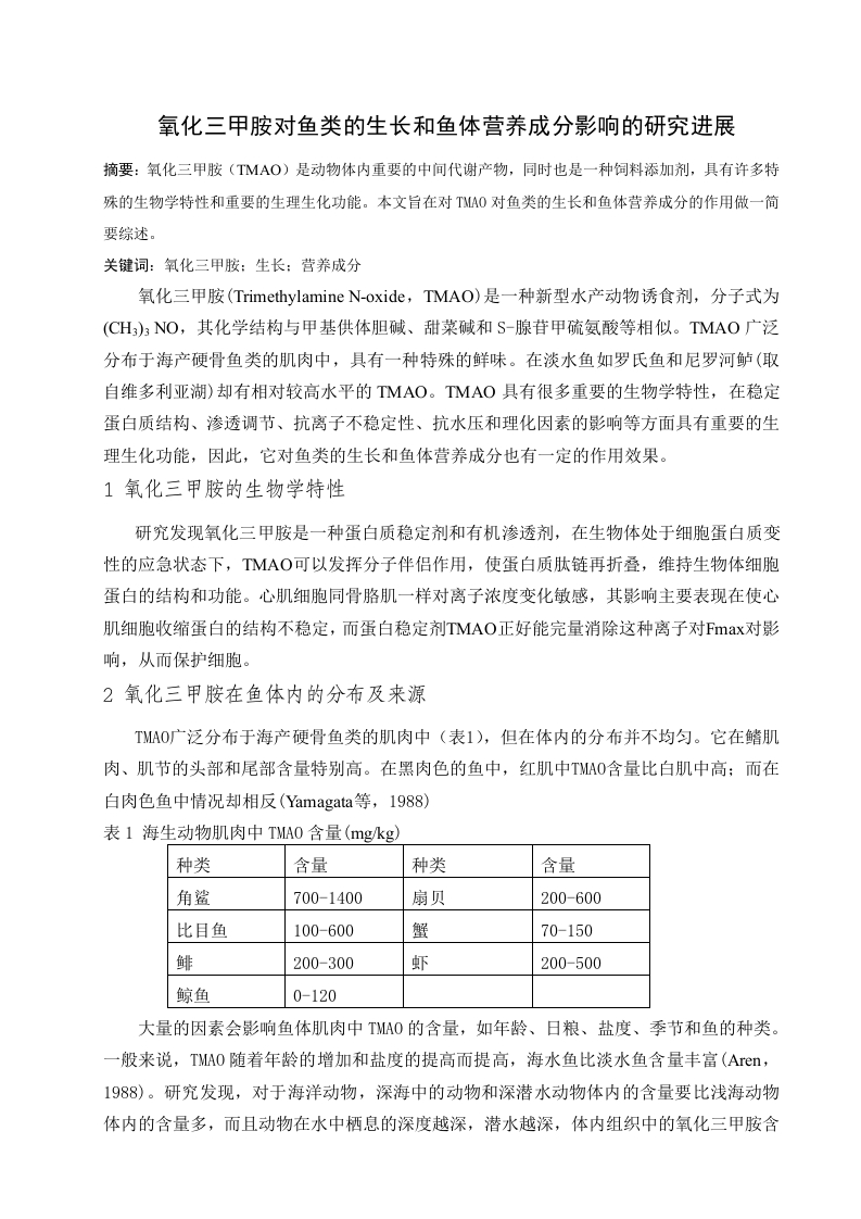 氧化三甲胺对鱼类的生长和鱼体营养成分影响的研究进展摘要:氧化三甲胺(TMAO)是动物体内重要的中间代谢产物,同时也是一种饲料添加剂,具有许多特殊的生物学特性和重要的生理生化功能。本文旨在对TA0对鱼类的生长和鱼体营养成分的作用做一简要综述。关键词:氧化三甲胺:生长:营养成分氧化三甲胺(Trimethylamine N-oxide,TMAO)是一种新型水产动物诱食剂,分子式为(CH)3NO,其化学结构与甲基供体胆碱、甜菜碱和S-腺苷甲硫氨酸等相似。TMAO广泛分布于海产硬骨鱼类的肌肉中,具有一种特殊的鲜味。在淡水鱼如罗氏鱼和尼罗河鲈(取自维多利亚湖)却有相对较高水平的TMAO。TMAO具有很多重要的生物学特性,在稳定蛋白质结构、渗透调节、抗离子不稳定性、抗水压和理化因素的影响等方面具有重要的生理生化功能,因此,它对鱼类的生长和鱼体营养成分也有一定的作用效果。1氧化三甲胺的生物学特性研究发现氧化三甲胺是一种蛋白质稳定剂和有机渗透剂,在生物体处于细胞蛋白质变性的应急状态下,TMAO可以发挥分子伴侣作用,使蛋白质肽链再折叠,维持生物体细胞蛋白的结构和功能。心肌细胞同骨胳肌一样对离子浓度变化敏感,其影响主要表现在使心肌细胞收缩蛋白的结构不稳定,而蛋白稳定剂TMAO正好能完量消除这种离子对Fmax对影响,从而保护细胞。2氧化三甲胺在鱼体内的分布及来源TMA0广泛分布于海产硬骨鱼类的肌肉中(表1),但在体内的分布并不均匀。它在鳍肌肉、肌节的头部和尾部含量特别高。在黑肉色的鱼中,红肌中TMA0含量比白肌中高:而在白肉色鱼中情况却相反(Yamagata等,1988)表1海生动物肌肉中TMA0含量(mgkg)种类含量种类含量角鲨700-1400扇贝200-600比目鱼100-600蟹70-150鲱200-300虾200-500鲸鱼0-120大量的因素会影响鱼体肌肉中TMA0的含量,如年龄、日粮、盐度、季节和鱼的种类。一般来说,TMAO随着年龄的增加和盐度的提高而提高,海水鱼比淡水鱼含量丰富(Aren,1988)。研究发现,对于海洋动物,深海中的动物和深潜水动物体内的含量要比浅海动物体内的含量多,而且动物在水中栖息的深度越深,潜水越深,体内组织中的氧化三甲胺含量越高。养殖鱼类中TMA0要有两种来源:(1)其摄取的食物(如浮游植物):(2)自身生物合成。淡水浮游动物和甲壳纲动物含有极少量的TMA0,淡水鱼如罗氏鱼和尼罗河鲈(取自维多利亚湖)却有相对较高水平的TMA0,这一系列证据表明部分淡水鱼类具有从日粮中前体物合成TMA0的能力。在多数情况下,TMA0来源于日粮,当金鱼饲喂无TMA0日粮时,其肌肉中无TMAO:当饲喂含TMAO日粮时,肌肉中TMAO显著升高:反之,肌肉中TMAO消失。3氧化三甲胺在水产动物中的作用3.1TMAO对水产动物的诱食作用孙海香等人用行为观察法和电生理法研究TMAO溶液对罗非鱼的诱食作用。结果发现,氧化三甲胺对罗非鱼有强烈的神经兴奋作用,罗非鱼对氧化三甲胺的反应图形为典型的EOG图像,罗非鱼对不同浓度的刺激液的EOG反应波形均相似,仅振幅值随刺激液浓度的增加而上升。迷宫实验进一步表明氧化三甲胺对罗非鱼的兴奋作用表现为诱食效应,试验组与对照组集鱼数差异显著,诱食最佳剂量为0.2%。张红梅等应用摄食行为观察法,研究了TMA0对南美白对虾的诱食活性。结果表明,TMAO对南美白对虾具有强烈的引诱和促摄食作用,与甘氨酸、丙氨酸、蛋氨酸、赖氨酸、苯丙氨酸、甜菜碱和2-甲基-B-丙噻啶(DMPT)相比,其表现出了最短的第一反应时间和最多的吞食颗粒数;TMA0添加量为0.5-3.0gkg时,南美白对虾对饵料的第一反应时间随添加量的增加而缩短,30mi内吞食饲料的颗粒数随TAO添加量的增加而提高。3.2氧化三甲胺对鱼类生长的影响黄峰等人采用单因素梯度设计,在饲料中添加50、100、200和1000mgkg氧化三甲胺,饲养体重3.5g左右的罗非鱼8周。结果显示,在配合饲料中添加50-200mg/kg氧化三甲胺对罗非鱼具有明显的促生长作用,其增重量、增重率显著高于对照组四。孙海香等人在对罗非鱼生长和鱼体营养成分组成的研究中发现,在饲料中添加0.2%、0.4%和0.8%的氧化三甲胺饲养罗非鱼,经过60的生长试验,观察不同添加量的氧化三甲胺对罗非鱼的生长、机体营养成分组成的影响。养殖试验结果表明,添加氧化三甲胺可以促进罗非鱼生长)。吕民主等(2004)在饲料中添加0.1%-0.15%的TMA0饲养红鲫鱼、三角鲂、稚甲鱼、南美白对虾,试验发现TMAO具有极显著的促生长效果。3.3氧化三甲胺对鱼体营养成分组成的影响TMA0作为动物体内重要的无毒中间代谢物,对鱼体的成分也有一定的影响。孙海香在试验中发现在饲料中添加氧化三甲胺对于改善罗非鱼的体形以及内脏器官的相对重量是有作用的。添加氧化三甲胺的试验组与对照组相比,肥满度增加,脏体比下降,肠系膜脂肪占体重百分比也下降,相对应的表示可食部分增加。添加了0.2%和0.8%氧化三甲胺的实验组中含量肝体比与对照组相比差异显著(P<0.05),0.4%组的氧化三甲胺添加量的去内脏比与对照组之间差异显著(P<0.05)。另外,氧化三甲胺可以降低罗非鱼肌肉和肝胰脏中的粗脂肪含量,试验组与对照组差异显著(P<0.05)。氧化三甲胺对罗非鱼肌肉中的水分、粗蛋白、灰分并没有显著影响(P>0.05)。Rorvik等报道,虹鳟鱼日粮中添加TMAO显著降低了腹脂率,显著增加了胆汁体积,同时也发现了大西洋鲑鱼日粮中添加4000mg/kgTMAO,显著降低了腹脂率,而添加1000 ng/kgTMAO提高了腹脂率,这表明TMAO对胴体脂