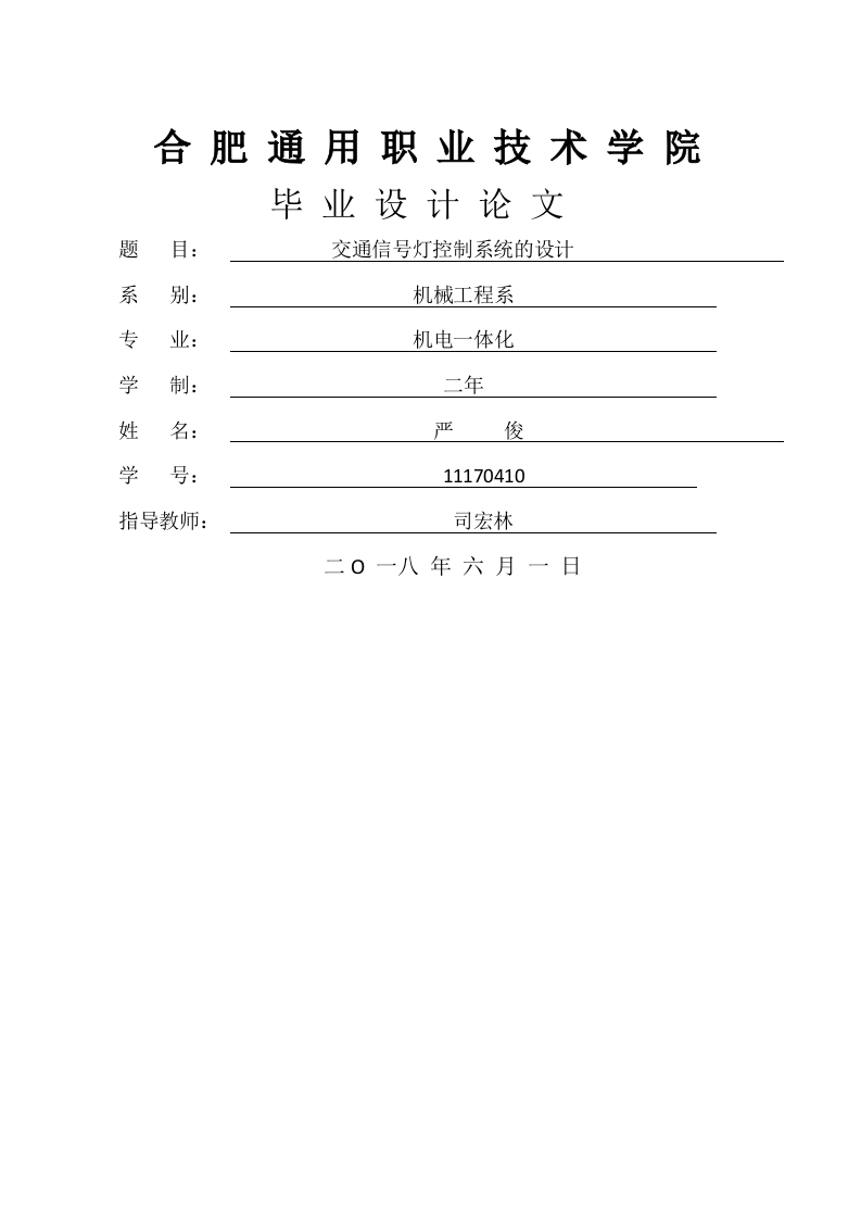 合肥通用职业技术学院毕业设计论文题目:交通信号灯控制系统的设计系机械工程系专业:机电一体化学制:二年姓名:严俊学号:11170410指导教师:司宏林二0一八年六月一日指导教师评语及成绩:指导教师:年月日摘要智能控制的交通指挥中心系统缓解了城市道路的拥堵的,使道路的通行能力得到了提高。同时减少了许多交通事故,车辆的尾气排放也得到了很大的改善,降低了对环境的污染。论文采用PLC实现对交通信号灯控制,编程简单明了,易于维护。利用组态软件MCGS对于交通灯控制系统进行相关的控制,便于机器和使用者进行有效的数据的交流。关键字:交通控制:交通灯;PLC控制:MCGS