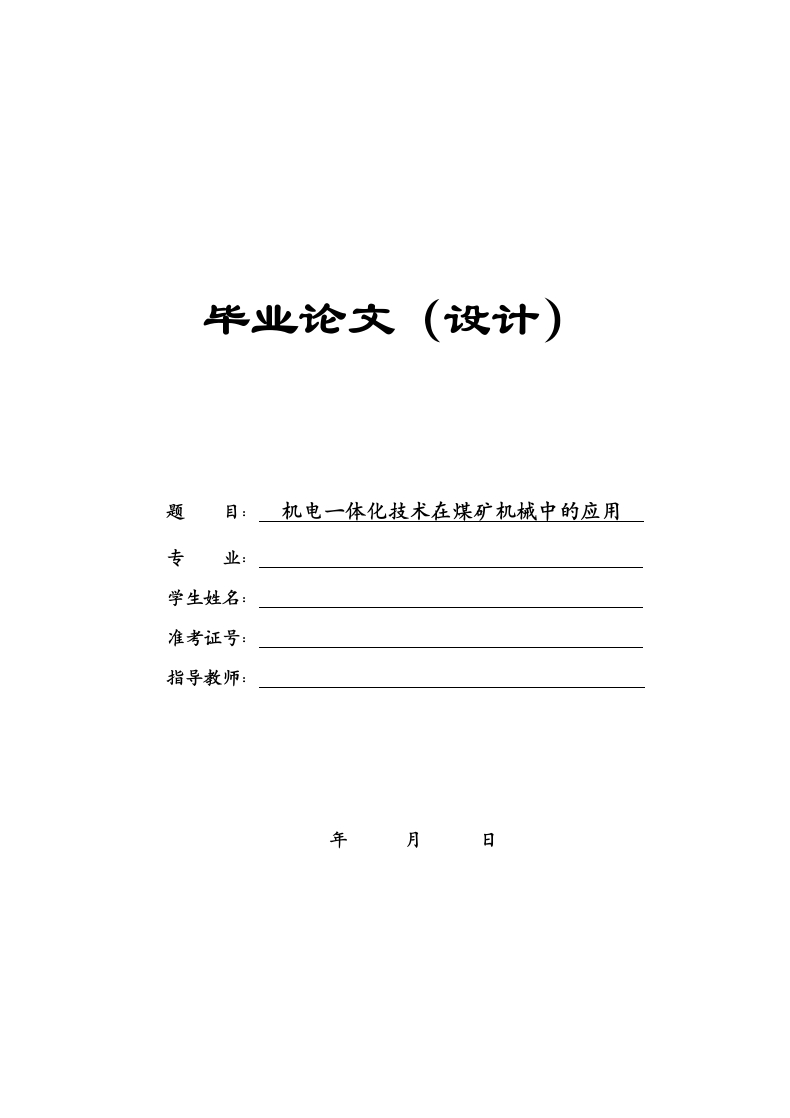 题目:机电一体化技术在煤矿机械中的应用专业:学生姓名:准考证号:指导教师:年月日机电一体化技术在煤矿机械中的应用摘要随着社会与技术的快速发展,机电一体化技术得到迅猛提升,从而机电一体化技术广泛应用到了各行各业中。在煤矿机械中应用机电一体化技术一直是煤矿企业关注的热点问题,机电一体化技术不仅显著的降低了工人的劳动强度、改善了工作环境,而且重点的是大大的提高了工作安全系数、提高了生产效率,。伴随着国家对采煤安全的不断重视,相关设备也应运而生,机电一体化技术必将会更为广泛的应用在煤矿机械中。因此机电一体化技术逐渐成为学者们所研究的热门课题之一,本文首先介绍了国内外煤矿机械技术的发展现状,然后重点就机电一体化技术在煤矿机械中的应用进行了一些分析,最后总结了机电一体化技术在煤矿机械中的发展趋势。关镀词:机电一体化煤矿机械应用目录一、绪论1.1课题背景...2.1机电一体化技术的简介22.2机电一体化技术在煤矿机械应用中的重要性2三、机电一体化技术在煤矿机械中的应用23.1采煤机上机电一体化的应用.....33.2煤矿掘进机上机电一体化的应用33.3提升机上机电一体化的应用..3.4输送机上机电一体化的应用.·33.5其他煤矿机械中机电一体化的应用4四、机电一体化技术在煤矿机械中的应用前景44.1战略意义44.2发展前景4五、结论4