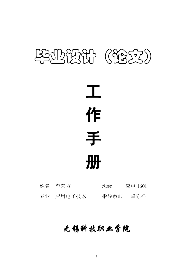作手册姓名李东方班级应电1601专业应用电子技术指导教师卓陈祥无锡科枝职业学院1目录1、毕业设计(论文)教学管理规定2、毕业设计(论文)学生管理规定3、江苏省普通高等学校专科优秀毕业设计(论文)评选标准4、毕业设计(论文)撰写规范5、毕业设计(论文)开题报告6、毕业设计(论文)中期汇报表7、毕业设计(论文)答辩资格审查表8、毕业设计(论文)指导教师评阅评分表9、毕业设计(论文)评阅教师评分表10、毕业设计(论文)成绩评分表11、毕业设计(论文)答辩小组意见表毕业设计(论文)教学管理规定一、毕业设计(论文)教学工作的程序1、毕业设计(论文)动员各二级学院毕业设计(论文)由二级学院院长负责进行动员,教研室主任、班主任、全体指导教师及学生都参加,组织学习条例,明确职责及要求。2、毕业设计(论文)检查检查分前、中、后三个阶段进行,由各二级学院组织并落实。学院成立由教研处及有关部门组成的学院毕业设计(论文)督查组进行监控和抽查。(1)前期:着重检查指导教师到岗情况,课题进行所必需的条件是否具备,课题安排是否合理,毕业设计(论文)任务书是否下达到每一个学生,有无开题报告等。(2)中期:着重检查学风、工作进度、工作量饱满程度、教师指导情况及毕业设计(论文)工作中存在的困难和问题,并采取有效的措施予以解决。各二级学院应有书面检查记录,并将检查情况及处理意见向院督查组汇报。指导教师可通过中期检查对学生进行阶段考核,填写《毕业设计(论文)中期检查表》,写出考核评语。考核结束后,将优秀学生及表现较差的学生名单报二级学院,作为毕业设计(论文)成绩评定的参考以及重点质量审查对象。院督查组将根据抽查情况,将表现较差的学生名单报各级学院,作为重点答辩对象。(3)后期:答辩前,一方面要着重对学生进行答辩资格审查,根据任务书及毕业设计(论文)规范化要求,检查学生完成工作任务的情况,组织对毕业设计(论文)文字材料的检查及软、硬件成果的验收:另一方面要检查指导教师及评阅教师对毕业设计(论文)评语的填写情况。答辩结束后,由各二级学院审查成绩评定情况,并在规定时间内报教研处。教研处将随机抽查学生的毕业设计(论文)。二、毕业设计(论文)资料的填写及有关资料的装订毕业设计(论文)统一使用学校下发的毕业设计(论文)任务书、毕业设计(论文)封面(使用A4打印纸)。毕业设计(论文)资料按要求认真填写,字体要工整,卷面要整洁,手写一律用黑或蓝黑墨水:任务书由指导教师填写并签字,经教研室审查,系主任审核签字后发出。毕业论设计(论文)要按顺序装订:封面、中外文摘要(含关键词)、目录、前言、正文、谢辞、参考文献、附录装订在一起。1毕业设计(论文)。2毕业设计(论文)任务书。3毕业设计(论文)工作手册。4译文及原文复印件(订在一起)。(与课题内容相关的外文资料翻译不少于3000字,参考文献不少于3种)。5答辩记录一起放入资料袋内交指导教师查收,经审阅评定后归档。毕业设计(论文)的归档资料,由各二级学院保管,保存期三年。3