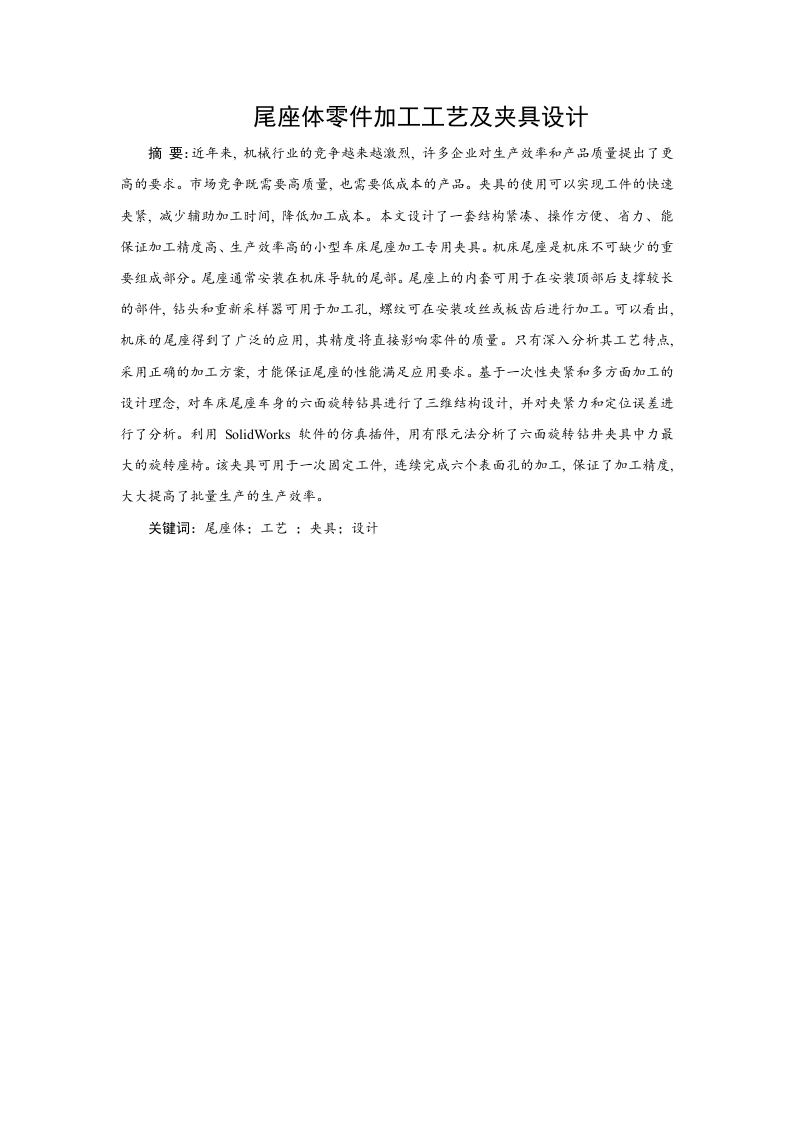 尾座体零件加工工艺及夹具设计摘要:近年来,机械行业的竞争越来越激烈,许多企业对生产效率和产品质量提出了更高的要求。市场竞争既需要高质量,也需要低成本的产品。央具的使用可以实现工件的快速夹紧,减少辅助加工时间,降低加工成本。本文设计了一套结构紧凑、操作方便、省力、能保证加工精度高、生产效率高的小型车床尾座加工专用夹具。机床尾座是机床不可缺少的重要组成部分。尾座通常安装在机床导轨的尾部。尾座上的内套可用于在安装顶部后支撩较长的部件,钻头和重新采样器可用于加工孔,螺纹可在安装攻丝或板齿后进行加工。可以看出,机床的尾座得到了广泛的应用,其精度将直接影响零件的质量。只有深入分析其工艺特点,采用正确的加工方案,才能保证尾座的性能满足应用要求。基于一次性夹紧和多方面加工的设计理念,对车床尾座车身的六面旋转钻具进行了三维结枸设计,并对央紧力和定位误差进行了分析。利用SolidWorks软件的仿真插件,用有限元法分析了六面旋转钻井夹具中力最大的旋转座椅。该夹具可用于一次固定工件,连续完成六个表面孔的加工,保证了加工精度,大大提高了批量生产的生产效率。目录第一章绪论…21.2国内外研究现状1.21组合夹具管理系统的发展及研究…41.2.2CAFD的发展及研究.…41.3夹具设计规划51.4夹具性能评价…....................m6第二章零件的工艺分析…2.1零件分析.…2.1.1加工面确定…82.1.2位置度要求.82.2工艺规程设计.…82.3确定毛坯制造形式2.4机械加工余量及毛坯尺寸的确定…2.4.1机械加工余量的确定2.4.2毛坯尺寸的确定.…102.5基面的选择…2.5.1粗基准的选择2.5.2精基准的选择…2.6制定工艺路线…122.6.1工艺路线方案一122.6.2工艺路线方案二…132.6.3工艺方案的分析与比较2.6.4量具的选择13第三章夹具设计及其分析….143.1夹具设计分析…3.2定位机构设计3.3夹紧机构的设计163.4钻模板设计3.5回转机构设计…193.6夹紧力的计算及定位误差分析193.6.1夹紧力分析计算…193.6.2定位误差分析203.6.3有限元分析3.7夹具使用效果…..20第四章结论.2121参考文献.23第一章绪论1.1引言尾座是车床的重要组成部分。尾座的主要部分是尾座。尾座的六个表面有需要加工的孔。使用传统的加工方法时,需要许多夹具来加工各方面的孔。在批量生产中,效率低,精度差,互换性差。为了保证产品加工的质量,当生产批次大的时候,需要特殊的夹具来保证尾体每个表面孔加工的准确性。夹具是一种用于准确确定工件位置并在切割过程中牢固夹紧的技术设备。它是现代机械加工行业不可缺少的重要技术设备之一。夹具的使用可以提高工件加工的精度,确保零件的互换性,提高劳动生产率,降低劳动强度,改善工人的工作条件。夹具的使用还可以扩大现有机床的应用范围,充分利用现有的设备资源。小型车床的尾座是精密仪器和仪表车床的匹配装置。在加工长车床时,后座顶针可用于防止零件因长度而被夹紧或在吃刀的侧向力后掉落。另一个功能是安装各种钻具钻孔或击中车床的中心角度。传统的钻孔夹具设计方法是定位工件的底部、凹槽或侧面,以限制工件的总自由度,然后使用联动夹紧机构拧紧夹紧螺丝,使压力板压下工件底板和夹具。