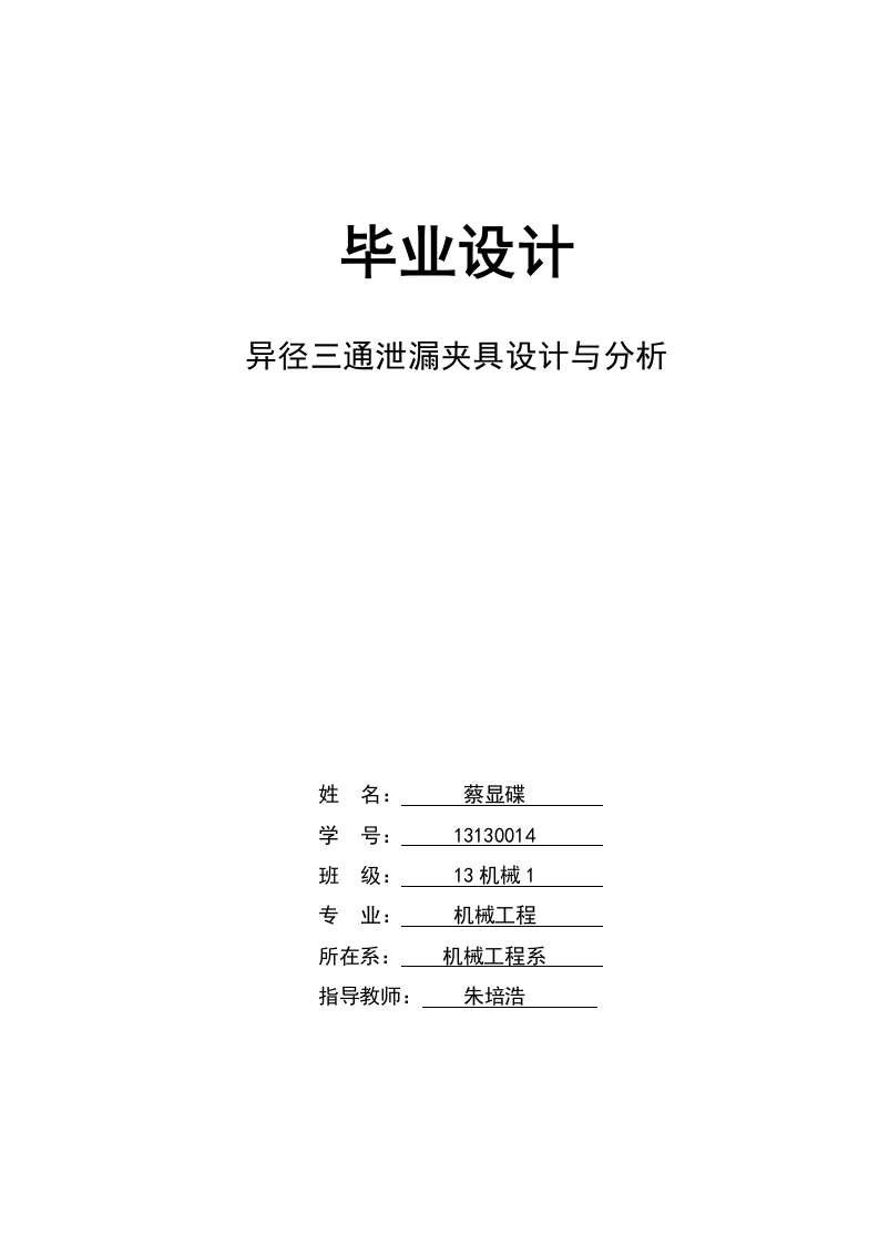 毕业设计异径三通泄漏夹具设计与分析姓名:蔡显碟学号:13130014班级:13机械1专业:机械工程所在系:机械工程系指导教师:朱培浩异径三通泄漏夹具设计与分析摘要据调查发现,目前我国每年都会发生由于螺栓腐蚀堵漏所产生的人员伤亡事故。当管道内有较高的内压时,如果直接调换腐蚀螺栓易造成管道结构爆裂,要是管道内是有毒有害气体、液体,或者管道是在高温高压的环境下,那么管道爆裂产生的后果将不堪设想。我所研究的项目是使用一种专门用于螺栓腐蚀与线密封的夹具,可以在不更换管道和不影响设备的正常运转的情况下安全有效的解决问题。所以这种密封技术最主要的问题就是夹具的设计。我这次研究的主要项目是异径三通的泄漏夹具,它是由本夹具体和两边的耳板组成的。先根据事实工况,了解基本要求,运用理论力学、材料力学、机械工程材料、机械设计等机械课程专业知识,并考虑温度、压力等现实因素的影响,从而对异径三通泄漏夹具进行理论设计,然后利用UG根据计算出来的数据绘制出异径三通泄漏夹具的模型。最后通过有限元分析软件对其强度和刚度的分析,得出夹具的可行性并确定异径三通泄漏夹具的最后确定结构,这里用的是ABAQUS。关键词:密封;异径三通管道泄漏夹具;UG:ABAQUSDesign and Analysis of Three-Way Pipe With DifferentDiameter Leakage FixtureAbstractAccording to the survey found that,due to the bolt corrosion leakage of the personnelcasualty our country at present every year.When pipeline with high internal pressure,if directbolt corrosion of the pipeline structure burst switch,if the pipe is poisonous and harmful gases,liquids,or is under the environment of high temperature and high pressure pipe,the pipe burstthe consequence will be unimaginable.My research project is to use a dedicated line boltcorrosion and sealing clamp,can not replace the pipeline and does not affect the normaloperation of equipment under the condition of safe and effective to solve the problem.So themain problem is the sealing technology of jig design.My main project is the study of reducingtee leak clamp,it is made of the concrete and the ears on both sides of the plate.Thereforeaccording to the working condition of the facts first,and understand the basic requirements,using the theory of mechanics,material mechanics,mechanical engineering,mechanical design,such as mechanical professional knowledge,and consider the effect of practical factors such astemperature,pressure,and thus to theoretical design of reducing tee leak clamp,then using UGaccording to the calculated data to map the reducing tee leak clamp model,Finally through thefinite element analysis software on the analysis of the strength and stiffness,it is concluded thatthe feasibility of the fixture and determine leakage reducing tee finally determine the structureof the fixture,here with ABAQUS.Key Words:Clamp;Three-way pipe with different diameter leakage fixture;UG;ABAQUS