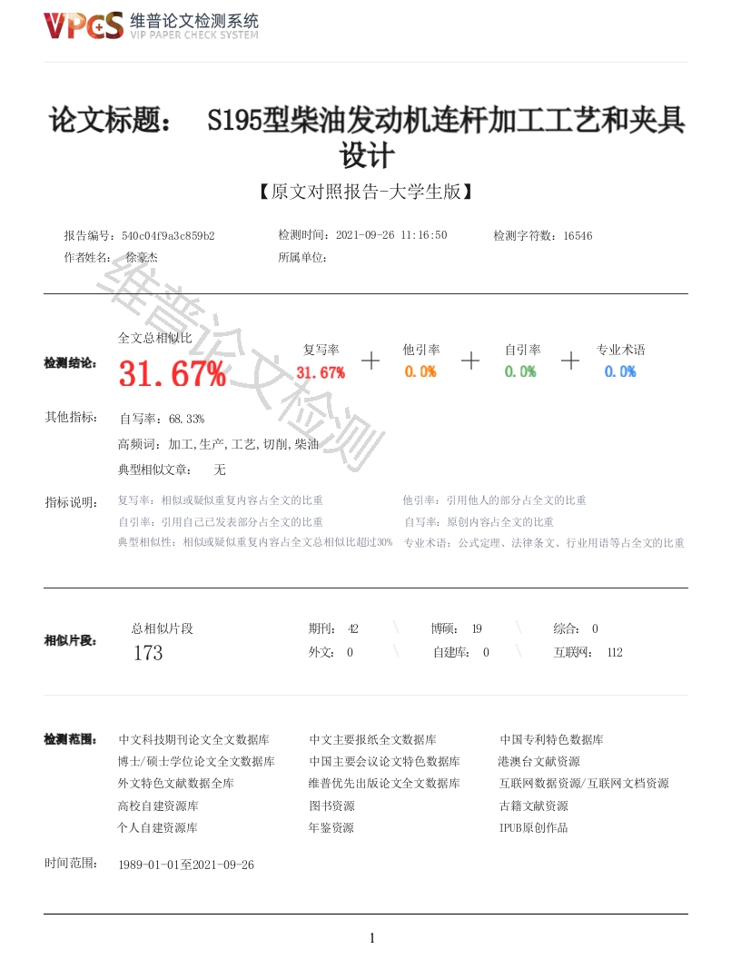 维普论文检测系统VIP PAPER CHECK SYSTEM论文标题:S195型柴油发动机连杆加工工艺和夹具设计【原文对照报告-大学生版】报告编号:540c04f9a3c859b2检测时间:2021-09-2611:16:50检测字符数:16546作者姓名:徐豪杰所属单位:全文总相似比复写率他引率自引率专业术语检测结论:31.67%31.67%0.0%0.0%0.0%其他指标:自写率:68.33%高频词:加工,生产,工艺,切削,柴油典型相似文章:无指标说明:复写率:相似或疑似重复内容占全文的比重他引率:引用他人的部分占全文的比重自引率:引用自己已发表部分占全文的比重自写率:原创内容占全文的比重典型相似性:相似或疑似重复内容占全文总相似比超过3%专业术语:公式定理、法律条文、行业用语等占全文的比重总相似片段博预:19综合:0相似片段:173外文:0互联网:112检测范围:中文科技期刊论文全文数据库中文主要报纸全文数据库中因专利特色数据库博士/硕士学位论文全文数据库中国主要会议论文特色数据库港澳台文献资源外文特色文献数据全库维普优先出版论文全文数据库互联网数据资源/互联网文档资源高校自建资源库图书资源古籍文献资源个人自建资源库年鉴资源IPUB原创作品时间范围:198901-01至2021-09-261维普论文检测系统VIP PAPER CHECK SYSTEM原文对照颜色标注说明:■自写片段■复写片段(相似或疑似重复)■引用片段(引用)■专业术语(公式定理、法律条文、行业用语等)2维普论文检测系统VIP PAPER CHECK SYSTEM