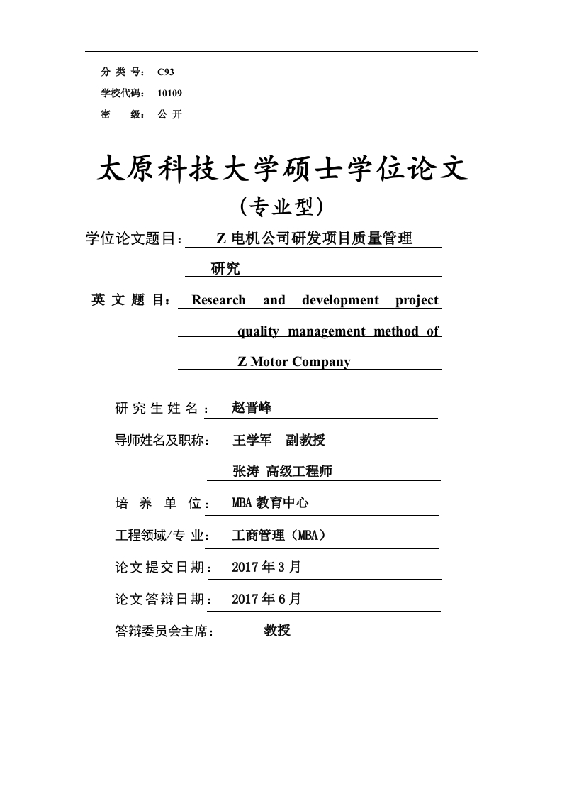 分类号:C93学校代码:10109密级:公开太原科技大学硕士学位论文(专业型)学位论文题目:Z电机公司研发项目质量管理研究英文题目:Research anddevelopment projectquality management method ofZ Motor Company研究生姓名:赵晋峰导师姓名及职称:王学军副教授张涛高级工程师培养单位:MBA教育中心工程领域/专业:工商管理(MBA)论文提交日期:2017年3月论文答辩日期:2017年6月答辩委员会主席:教授论文独创性声明本人郑重声明:所呈交的论文,是本人在导师指导下,独立进行研究所取得的成果。除文中特别加以标注和致谢的地方外,论文中不包含其他个人或集体已经发表或撰写的研究成果。对本研究所做的任何贡献的个人或集体均已在论文中作了明确的说明并表示了谢意。本声明产生的法律责任由本人承担。论文作者签名:日期:关于论文使用权的授权书本人完全了解太原科技大学有关保管、使用学位论文的规定,即:学校有权保管、并向有关部门送交学位论文的原件与复印件,可以采用影印、缩印或其他复制手段保存论文,允许论文被查询或借阅,以学术交流为目的,学校可以公布论文内容。保密论文在解密后遵守此规定。签名:导师签名:日期:中文摘要中文摘要现代企业中,研发部门往往是公司的核心部门之一,研发项目管理的科学性是企业生产、发展的强力保证。企业要根据市场的变动,消费者需求的变化,竞争对手的相应对策等方面情况,调整自己的发展计划。及时调整管理模式、研发新产品、技术改造等等使企业能够更适应市场的需要,从而获得可观利益。所以,企业要想逆势增长,在市场中不断发展的关键途径就是要科学实施研发项目管理。所以,科技企业依照本身运作状况执行以及强化分析项目质量管理,逐渐变成提升科技含量以及综合竞争力的关键部分。本文利用问卷分析、参考相关文献等方法,对Z电机公司在研发项目质量管理现状的分析,得知在产品研发部分,项目质量监管的理论以及方式在企业内并未被全面以及大量使用,主要是因为组织监管不合理、细节管控不严格,导致资源浪费或产品质量不符合要求。通过发掘其在项目质量管理过程中出现的问题,归纳总结了其中四点,即项目数据的采集方法落后、质量保证部门测量指标缺失、项目质量控制管理未形成闭环和质量管理方法优化空间狭窄。为解决这四个问题,本文针对其在质量规划、保证、控制等方面出现的漏洞,提出了对应的解决方案。建立了数据管理系统、明确质量保证部门责任及测量指标、引入六西格玛管理达到精益管理、对Z电机公司三个事业部提出不同的研发项目生产方案。本文对Z电机公司研发项目质量管理标准化、科学化有着现实指导意义,提升了Z电机公司的生产效率。该公司研发项目管理方面出现的问题在中国中小型企业中也是普遍存在的,通过对该公司研发项目质量管理的研究,对中国同类型生产企业也提供了一定借鉴。关键词:项目质量管理;闭环;六西格玛:全面质量管理;精益化管理I