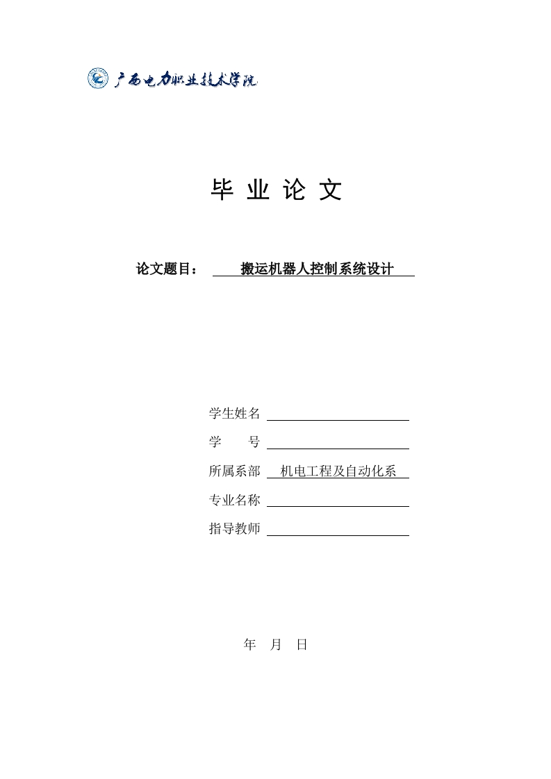毕业论文论文题目:搬运机器人控制系统设计学生姓名学号所属系部机电工程及自动化系专业名称指导教师年月日目录1.1研究背景与意义…1.2国内外发展现状…21.2.1搬运机器人发展现状1.2.2机器人控制系统发展现状2搬运机器人控制系统总体设计…2.1系统功能需求分析.62.2系统方案设计…62.2.1系统总体组成结构…2.2.2导航定位方式选择72.2.3通信方式选择.2.3搬运机器人机械结构概要设计.…2.3.1总体构造设计2.3.2驱动方式选择.2.3.3底盘传感器安装位置设计….82.3.4外壳设计2.4搬运机器人控制系统核心部件选型,92.4.1运动控制模块选型…92.4.2供电电池选型.92.4.3导航定位模块选型2.4.4红外避障模块选型…2.4.5无线通信模块选型103搬运机器人控制系统硬件设计与实现103.1引言103.2技术要求…113.3控制方案.114搬运机器人控制系统软件设计.134.1系统软件总体构架设计…134.2数据采集模块设计…134.2.1数据采集模块4.2.2二维码信息采集程序设计144.2.3灰度循迹模块数据采集与处理程序设计.144.3模块划分与系统硬件…4.3.1运动控制模块.154.3.2控制系统改善解决方案.4.4运动控制模块软件设计.…174.4.1电机转速闭环控制算法设计174.4.2电机速度控制模块设计174.4.3电机方向控制算法设计.…4.5无线通信模块软件设计175搬运机器人控制系统调试…5.1控制系统硬件调试…185.1.2运动控制模块调试195.2控制系统软件调试…195.3系统联合调试结论20致谢…