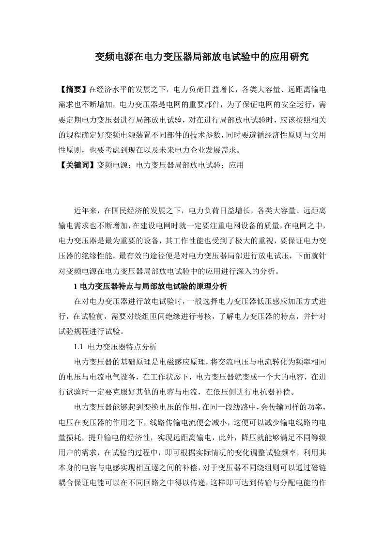 变频电源在电力变压器局部放电试验中的应用研究【摘要】在经济水平的发展之下,电力负荷日益增长,各类大容量、远距离输电需求也不断增加,电力变压器是电网的重要部件,为了保证电网的安全运行,需要定期电力变压器进行局部放电试验,对在进行局部放电试验时,应该按照相关的规程确定好变频电源装置不同部件的技术参数,同时要遵循经济性原则与实用性原则,也要考虑到现在以及未来电力企业发展需求。【关键词】变频电源:电力变压器局部放电试验:应用近年来,在国民经济的发展之下,电力负荷日益增长,各类大容量、远距离输电需求也不断增加,在建设电网时就一定要注重电网设备的质量,在电网之中,电力变压器是最为重要的设备,其工作性能也受到了极大的重视,要保证电力变压器的绝缘性能,最有效的途径便是对电力变压器局部进行放电试压,下面就针对变频电源在电力变压器局部放电试验中的应用进行深入的分析。1电力变压器特点与局部放电试验的原理分析在对电力变压器进行放电试验时,一般选择电力变压器低压感应加压方式进行,在试验前,需要对绕组匝间绝缘进行考核,了解电力变压器的特点,并针对试验规程进行试验。1.1电力变压器特点分析电力变压器的基础原理是电磁感应原理,将交流电压与电流转化为频率相同的电压与电流电气设备,在工作状态下,电力变压器就变成一个大的电容,在进行试验时一定要克服好其他的电容与电流,在低压侧进行电抗器补偿。电力变压器能够起到变换电压的作用,在同一段线路中,会传输同样的功率,电压在变压器的作用之下,线路传输电流便会减小,这便可以减少输电线路的电量损耗,提升输电的经济性,实现远距离输电,此外,降压就能够满足不同等级用户的需求,在试验的过程中,即可根据实际情况的变化调整试验频率,利用其本身的电容与电感实现相互逐之间的补偿,对于变压器不同绕组则可以通过磁链耦合保证电能可以在不同回路之中得以传递,这样即可达到传输与分配电能的作用。1.2电力变压器局部放电产生原理局部放电就被称之为游离,即在外在电压的作用之下,静电荷会在绝缘较弱位置发生静电游离,但此时并不会发生绝缘击穿的情况,这种静电荷流动的情况即称之为局部放电,而被气体包围导体周围出现局部放电就称之为电晕。在电力变压器油中有着大量的离子与极性分子,离子则包括正离子与负离子,这两者的数量是相等的,但是绝缘纸板会对油中负离子与极性分子产生一定的吸附效果,这就会导致油中电荷发生定向移动。在强油导向冷却系统之中,一旦油泵被开启,那么器身内部流动速度较快的区域其中的正离子在油的流动作用之下,便会被带走,此时,其中的正离子与负离子会发生分离的情况,这样即可出现油带正电、绝缘材料待负电的情况,其带有符号相反、电量相同的电荷。在电荷产生分离的情况之后,就可以泄露到大地中,也可能与其中的异性分子发生复合,这样就会导致电荷减少。在一定的环境之中,油中水含量减少,电荷密度就会增大,水含量增加,电荷密度就会降低,油含气量增加,其绝缘度便会降低,这样就越容易发生放电的情况,放电会导致油发生分解,其分解的生成物会影响油的质量,影响油的绝缘性能。而对于电力变压器局部放电,要保证其能够满足用户的使用需求,为此,就需要在设计的过程中分析好绝缘结构电场分布情况,选择质量可靠的绝缘材料。2电力变压器局部放电试验回路接线与试验程序2.1电力变压器局部放电试验回路接线电力变压器局部放电试验均是使用低压加压高压电磁感应原理来进行试验,在进行试验之前,需要测试其绝缘性能,待性能无误后方可进行试验。在试验时,应该将被测变压器低压侧与中间励磁变压器输出侧进行连接,并与周围物体保持一定的距离,防止接触不良引发局部放电,而被测变压器外壳、夹件、铁芯、平衡绕组必须要保持可靠接地,被试绕组中性点端子应该保持其接地性能。并正确的连接分压器与变频电源中的信号线,保证变频电源输出不会出现短路的情况,在进行加压之前,还需要保证分压器与电抗器表面无灰尘和污垢,而被试变压器与试验设备需要可靠接地。2.2电力变压器局部放电试验流程电力变压器局部放电试验需要依照GB1094.3-2003标准来执行,在试验流程之中,变压器绝缘情况的检查是其中最为重要的环节,并进行ACSD试验,在试验前需要测量局部放电情况,保证变压器的运行环境。变压器端子中施加交流电压时,应该保证其波形能够接近正弦波,在进行试验时,其频率应该大于额定频率,并测量好感应试验电压峰值,一般情况下,试验电压值应该为测量电压峰值除以√2,如果试验电压频率小于或者等于2倍额定频率时,其试验时间应该保证为60秒,若试验频率超过2倍额定频率,其试验时间计算方式为:在上式之中,f为试验频率,f0为工频频率,t大于15秒。进行相间试压时,其电压应该控制在合理范围内,考虑到电力变压器多为单相结构,相间绝缘即可满足设计要求,因此,在试验时选择中性点端子接地方式进行,具体注意事项如下:当电压小于U23,方可关闭电源:当电压升高至U3时,持续时间为5min:当电压升高至U2时,持续时间为5min:当电压再升高至U1时,持续时间为t=120×s:当电压降低至U2,局部放电时,持续时间为D,其中300kV以下变压器为30min,300kV及以上变压器为