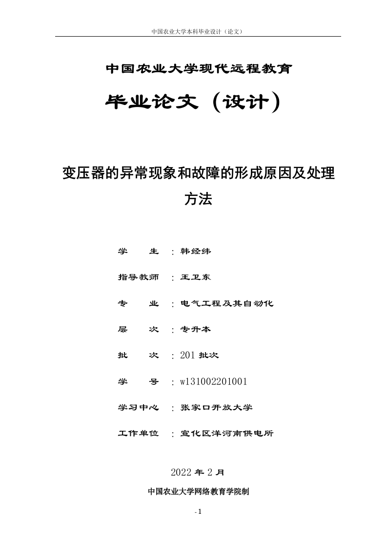 中国农业大学本科毕业设计(论文)中国农业大学现代远程教育变压器的异常现象和故障的形成原因及处理方法学生:韩经纬指导教师:王卫东专业:电气工程及其自动化层次:专升本批次:201批次学号:w131002201001学习中心:张家口开放大学工作单位:宣化区洋河南供电所2022年2月中国农业大学网络教育学院制-1中国农业大学本科毕业设计(论文)独创性声明本人声明所呈交的毕业论文(设计)是我个人进行的研究工作及取得的研究成果。尽我所知,除了文中特别加以标注和致谢的地方外,论文(设计)中不包含其他人已经发表或撰写过的研究成果,也不包含为获得中国农业大学或其它教育机构的学位或证书而使用过的材料。与我一同工作的同志对本研究所做的任何贡献均已在毕业论文(设计)中作了明确的说明并表示了谢意。时间:22年月/日关于论文(设计)使用授权的说明本人完全了解《中国农业大学树络教育学院本、专科毕业论文〔设计)工作条例(暂行规定)》对:“成绩为优秀毕业论文〔设计),网络教育学院将有权选取部分论文(设计)全文汇编成集或者在网上公开发布。如因若作权发生纠纷,由学生本人负责”完全认可,并同意中国农业大学网络教有学院可以以不同方式在不同媒体上发表、传播毕业论文(设计)的全部或部分内容。中国农业大学网络敦有学院有权保留送交论文(设计)的复印件和磁盘,允许论文(设计)被查阅和借阅,可以采用影印、缩印或扫描等复制手段保存、汇编论文(设计)。[保密的毕业论文(设计)在解密后应遵守此协议]学生签名时间:密级:(请注明密级及保密期限)中国农业大学本科毕业设计(论文)内容摘要在变压器进行工作时需要注意很多,尤其是在我们的日常生活当中,比如说,变压器在运行时可能会面临很多的问题,变压器在进行运作的时候,容易出现运行异常,或者是出现某些事故等问题,这些都是导致变压器工作产生事故的原因,所以在进行运行时,我们应该保障各个装置的安全运行,提高对应的变压器效率。因此,在以后的发展道路中,我们应该对配电电压器的故障率进行试验检测,提出一系列措施来为变压器的发展提供一系列的建议。在我们对这些故障现象进行分析时,首先应该对这些现象进行整理,从而进行检测,以便能够检测出其中所存在的故障以及问题,针对对应的问题提出运行方法和解决措施。如果发现对应的问题,一定要及时进行处理。关键词:绝缘配电变压器异常故障-3