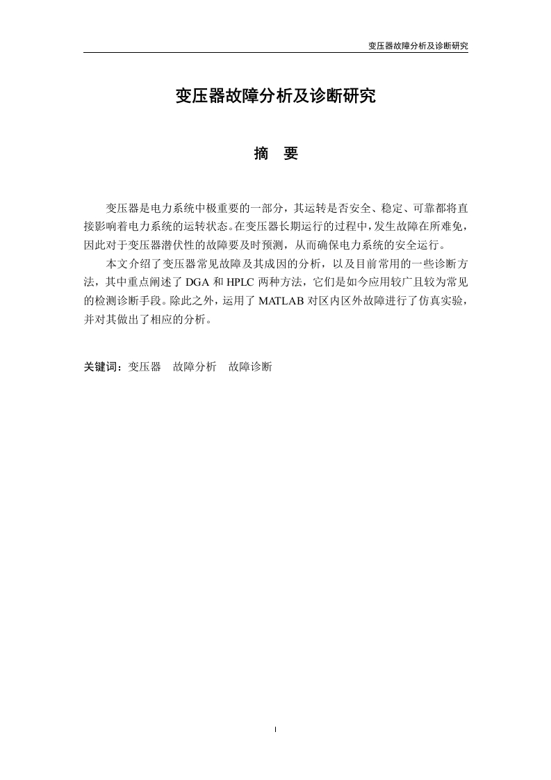 变压器故障分析及诊断研究变压器故障分析及诊断研究摘要变压器是电力系统中极重要的一部分,其运转是否安全、稳定、可靠都将直接影响着电力系统的运转状态。在变压器长期运行的过程中,发生故障在所难免,因此对于变压器潜伏性的故障要及时预测,从而确保电力系统的安全运行。本文介绍了变压器常见故障及其成因的分析,以及目前常用的一些诊断方法,其中重点阐述了DGA和HPLC两种方法,它们是如今应用较广且较为常见的检测诊断手段。除此之外,运用了MATLAB对区内区外故障进行了仿真实验,并对其做出了相应的分析。关键词:变压器故障分析故障诊断变压器故障分析及诊断研究Transformer Fault Analysis and DiagnosisAbstractThe transformer is a very important part in the power system,and its operation issafe,stable and reliable,which will directly affect the operation of the power system.Inthe process of transformer running over a long period of time,failure is inevitable,sowe need to do transformer latent fault forecast in time,so as to guarantee the safeoperation of transformer.This paper introduces the general fault of transformer and the analysis of thecauses,as well as some commonly used diagnostic methods at present,the twofocused on DGA and HPLC methods,they are widely used now and more commondiagnostic testing tools.In addition,using MATLAB to areas outside the faultsimulation experiment was carried out,and make the corresponding analysis.Key Words:transformerfailure analysis fault diagnosis变压器故障分析及诊断研究目录Abstract-目录图清单表清单1绪论11.1研究背景及意义1.2国内外研究现状及发展动态11.3本文主要内容32变压器常见故障及原因分析2.1短路故障42.2放电故障2.3绝缘故障3变压器故障的诊断方法研究83.1变压器故障油中气体色谱检测技术-83.2电力变压器绝缘老化检测技术103.3电力变压器局部放电故障检测技术113.4电力变压器有载分接开关检测技术124变压器仿真134.1仿真变压器空载合闸时励磁涌流134.2仿真变压器外部故障17236致谢24参考文献-25