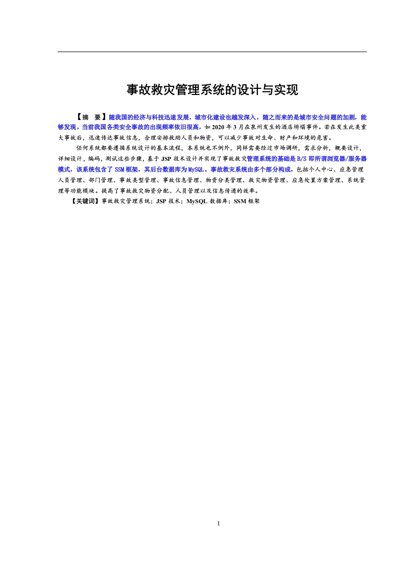 事故救灾管理系统的设计与实现【摘要】随我国的经济与科技迅速发展,城市化建设也越发深入,随之而来的是城市安全问题的加剧,能够发现,当前我国各类安全事故的出现频率依旧很高,如2020年3月在泉州发生的酒店坍塌事件。若在发生此类重大事故后,迅速传达事故信息,合理安排效助人员和物资,可以诚少事故对生命、对产和环境的危害。任何系统都要遵循系统设计的基本流程,本系统也不例外,同样需要经过市场调研,需求分析,概要设计,详细设计,编码,测试这些步骤,基于JSP技术设计并实现了事故数灾管理系统的基础是B/S即所谓浏览器/服务器模式,该系统包含了SSM框架,其后台数据库为ySQL。事故数灾系统由多个部分构成,包括个人中心、应急管理人员管理、部门管理、事故类型管理、事故信息管理、物资分类管理、数灾物资管理、应急处置方案管理、系统管理等功能模块。提高了事故效灾物资分配、人员管理以及信息传递的效率。【关键词】事故数灾管理系统:JSP技术:ySQL数据库:SSM框架1绪论1.1研究背景和意义随着互联网的发展,电脑己成为人们生活中必不可少的生活办公工具,在这样的背景下,网络技术被应用到各个方面,人类社会进入了全新的信息化的时代。事故救灾一直是人民的一大难题,人们经济条件不断的提高,于是对网络需求也越来越来高,传统的手工作业无法满足用户需求,此时寻找有效便捷的网络管理方法就是当务之急。而日趋成熟的计算机信息管理技术便成为解决这一难题的唯一之选。如今计算机信息管理技术来处理事故救灾早已游刃有余,其实信息管理技术已经渗透到各个行业的信息控制管理当中,且有着举足轻重的地位。而随着现代化社会主义不断进步,普通群众生活水平有了大幅提高,很多方面都在网络上去实现,从而网络也就成为了最直接、即方便又快捷的接入口。使用事故救灾管理系统相对传统事故救灾方式具备很多优点:首先可以大幅提高事故信息检索,只需输入事故救灾相关信息就能在数秒内反馈想要的结果:其次可存储大量的事故救灾管理信息,同时事故救灾管理信息安全性有更高的保障:相比纸质文件来管理事故救灾管理信息,事故救灾管理系统更节省空间人力资源。这些优点大大提高运营效率并节省运营成本。因此,开发事故救灾管理系统对事故信总进行有效的管理是很必要的,不仅提高了事故救灾管理系统效率,增加了应急管理人员信息安全性,方便应急管理人员及时反馈信息给管理员,增加了应急管理人员与管理员之间的互动交流,更能提高事故救灾的体验强度。本系统为了数据库结构的灵活性所以打算采用MySQL来设计数据库,而SSM框架,B/S架构则保证了较高的平台适应性。1.2课题国内外研究进展随着多种卫生公共事件的发生,比如新冠肺炎疫情等,人们越来越重视其应急问题,许多国家致力于研究应急系统的设计与研发,并将此任务当作了重要的发展战略。如果从特征来对公共突发事件进行分析,能够发现,其类别包括自然灾害、社会安全事件等。山早年间,我国的防灾减灾管理组织方式是基于单一灾种施行的,但在2003年,全球爆发非典危机,此时政府认识到了我国防灾救灾方面存在的各种问题,开始将重点放在了应急综合管理体系的建设与优化上,并为此出台了诸多关系搭配突发应急事件的预案,建立了相应的法律体系。我国想要将信息化辅助手段作用于应急指挥管理,不仅要提高其效率,还要提高其水平,防止我国灾害突发以及公共事件突发。由此可见,当前我国必须结合自身国情建设完善的大城市应急指挥系统。山现今,越来越多的人乐于选择一项合适的管理方案,但是往往受到管理经验地限制,Internet作为新型网络崛起,网络进入人们生活,事故救灾管理系统无疑是给应急管理人员提供更好平台,在这样成功的管理模式背景下,不仅方便管理员管理,也方便应急管理人员查看知识信息进行点击下载。高效便捷地管理事故救灾成为了转变管理模式,与时代兼容的当务之急。☒1.3初步设计方法与实施方案软件体系结构方案:由于本系统需要在不同设备上都能运行,而且电脑配置要求也要越低越好,为了实现这一要求,经过考虑BS结构成为最佳之选。使用BS结构的系统可以几乎在任何电脑上运行,只要浏览器可以正常工作就可以正常运行该系统,而且后期维护及二次修改较为容易,符合操作系统方案:Windows10操作系统,目前大多数市面上的电脑都使用该系统,并且该系统功能完善,兼容性好。开发工具:选用Eclipse、JSP开发技术。1.4论文结构本文主要分为七个章节,(1)绪论,主要介绍目前电脑技术发展状况、事故救灾行业发展阶段,分析当前事故救灾管理系统弊端以及使用信息技术来管理事故救灾信息的好处。(2)本系统涉及的多项技术。能够发现,该章节不但阐述了各项技术的发展情况,还总结了各项技的优点。除此之外,还阐明了选择技术的原因。(3)系统分析,具体包括软件设计中涉及的功能。(4)系统设计,具体包括系统数据库设计以及框架设计。(5)系统详细设计。(6)系统调试情况以及测试情况,测试的内容包括系统性能、可行性等。(7)总结和致谢。主要总结程序设计的完成过程及完成情况,比对完成设计过程中施以援手的同学和老师表达中心的感谢和祝愿。2系统开发环境2