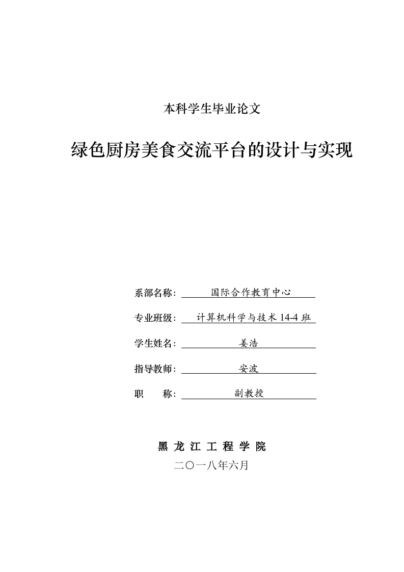 本科学生毕业论文绿色厨房美食交流平合的设计与实现系部名称:国际合作教育中心专业班级:计算机科学与技术14-4班学生姓名:姜浩指导教师:安波职称:副教授黑龙江工程学院二0一八年六月The Graduation Design for Bachelor's DegreeDesign and Implementation ofGreen-Kitchen Food CommunicationPlatformCandidate:Jiang HaoSpecialty:Computer science and technologyClass:14-4Supervisor:Associate Prof.An BoHeilongjiang Institute of Technology2018-06·Harbin黑龙江工程学院本科生毕业设计摘要在当今社会绿色生活理念深入人心,尤其是饮食的绿色、健康一直被广泛关注,也是当下热议的话题,而绿色健康饮食氛围的营造,首先就要求人们养好良好的生活习惯,以此来提高身体的新陈代谢能力,从而使得身体处于健康状态,所有要更加关注饮食的健康。因此,为满足网络上众多美食爱好者的需要。我设计了该美食交流平台-绿色厨房美食交流平台。绿色厨房美食交流平台的设计与实现,就技术层面而言,采用了Java和MySQL数据库技术等,同时根据软件系统开发原则,充分了解系统和用户需求,并结合新型信息化管理系统特点。基于上述,本文旨在建立以用户为中心,以中餐食谱为主要内容的美食交流平台。并以此确定了该系统设计与实现的四大主要功能模块,主要包含:用户注册模块、美食秘籍模块、优华山论菜模块、我的宝典模块,用户在各功能模块中用户可以通过交流来分享日常美食经验。绿色厨房美食交流平台对美食进行了收录、展示与管理,使得更多的美食菜谱和美食文化得到推广,有助于激发美食爱好者对创造力,同时也为使用者带来了颇多便利。关键字:美食交流平台;在线论坛;java系统设计;java系统建模;MVC设计模式: