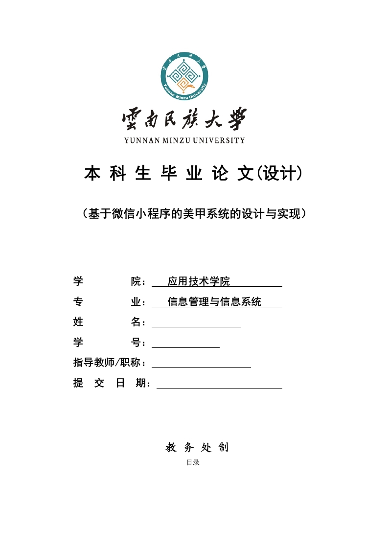 YUNNAN MINZU UNIVERSITY本科生毕业论文(设计)(基于微信小程序的美甲系统的设计与实现)学应用技术学院专业:信息管理与信息系统姓名:学指导教师/职称:提交日期:教务处制目录11.1系统开发目的11.2系统开发意义2系统开发工具介绍..22.1JSP技术.2.2JAVA语言2.3 MYECLIPSE简介2.4 MYSQL数据库2.5微信小程序..43需求分析与设计3.1可行性分析...53.1.1可行性分析..53.1.2技术可行性分析53.1.3安全可行性..53.1.4操作可行性...53.2系统功能分析53.3系统功能结构图63.4系统流程图..73.5系统功能用例图83.6系统非功能性需求分析.104数据库设计...114.1数据库逻辑结构设计114.2数据库物理结构设计134.3数据字典..155系统的详细设计与实现....195.1服务器端实现.....195.1.1后台登录页面...195.1.2管理会员信息页面....195.1.3添加美甲作品信息页面205.1.4管理订单信息页面....…20215.2.1登录模块客户端页面215.2.2美甲作品页面...22235.2.4我的订单页面....2425276.1系统的维护....276.2系统测试..27293031