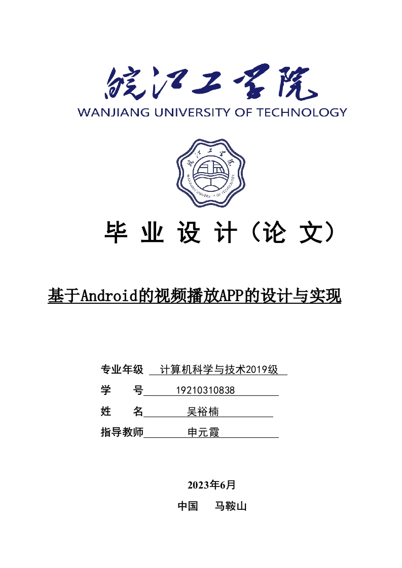 WANJIANG UNIVERSITY OF TECHNOLOGY毕业设计(论文)基于Android的视频播放APP的设计与实现专业年级计算机科学与技术2019级学号19210310838姓名吴裕楠指导教师申元霞2023年6月中国马鞍山郑重声明本人呈交的毕业设计(论文),是在指导老师的指导下,独立进行研究工作所取得的成果,所有数据、图片资料真实可靠。尽我所知,除文中已经注明引用的内容外,本设计(论文)的研究成果不包含他人享有著作权的内容。对本设计(论文)所涉及的研究工作做出贡献的其他个人和集体,均已在文中以明确的方式标明。本设计(论文)的知识产权归属于培养单位。本人签名:日期:摘要现在智能手机已经是我们生活中不可或缺的工具,提供了人们随时随地的娱乐方式。其中人们使用智能手机来观看视频已经成为重要的娱乐形式,本文设计视频播放APP可以整合网络视频资源展示在移动端设备上,可实现用户便捷的获取和观看视频。同时APP可对用户登录和观看内容进行保存,根据用户习惯进行一定程度的视频推荐。本课题开发了基于Android的视频播放APP,该APP角色包括管理员和用户。APP主要包含了视频播放、登录注册、用户设置等界面,用户可以在APP上观看视频、收藏视频、查找视频,还可以进行用户信息注册登录、个人信息设置等操作。管理员可登录浏览所有的功能,并可对所有的视频进行管理及浏览。该系文章首先介绍了应用程序所涉及到的技术,然后分析了应用程序的用户需求。之后,文章介绍了该系统的EE图表以及数据库的逻辑结构:最后对应用程序实现的系统功能模块进行说明。关键词:Android;视频播放APP:MySQL数据库I