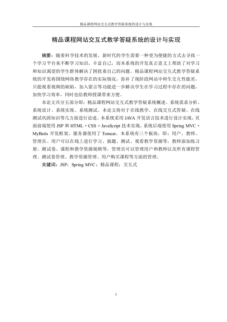精品课程网站交互式教学答疑系统的设计与实现精品课程网站交互式教学答疑系统的设计与实现摘要:随着科学技术的发展,新时代的学生需要一种更为便捷的方式去寻找一个学习平台来不断学习知识,丰富自己,而本系统的开发真正意义上帮助了对学习和知识渴望的学生群体解决了困扰着自己的问题。精品课程网站交互式教学答疑系统的开发将围绕网络教学存在的实际情况,弥补了现阶段网站中师生交互性能差,只能观看视频的缺陷,加入留言等功能进一步解决学生在学习过程中存在的问题,加快学习效率,同时也给教师授课带来方便。本论文共分五部分即:精品课程网站交互式教学答疑系统概述、系统需求分析、系统设计、系统实现、系统测试。本论文将对于在线教学、在线交互式答疑、在线测试巩固知识等几方面进行论述。本系统采用JAVA开发语言技术进行设计实现,页面前端使用JSP和HTML+CSS+JavaScript技术实现,系统后端使用Spring MVC+MyBatis开发框架,服务器使用了Tomcat。.本系统有三个板块,即:用户、教师、管理员。用户可以在线上进行学习、做题、测试、观看教学资源等,教师添加练习册、测试卷、课程和教学资源视频等,管理员可以管理用户和教师以及所有课程管理、测试卷管理、教学资源管理、用户购买课程等方面的管理。关键词:JSP;Spring MVC:精品课程;交互式精品课程网站交互式教学答疑系统的设计与实现Design and Implementation of Interactive Teaching AnswerSystem for Quality Course WebsiteAbstract:With the development of science and technology,students in the new eraneed a more convenient way to find a learning platform to constantly learn knowledge andenrich themselves.The development of this system really helps students who are eager forlearning and knowledge to solve the problems that plague them.The development ofinteractive teaching and answering system of excellent course website will revolve aroundthe actual situation of network teaching,make up for the poor interaction between teachersand students in the current website,only watch the video,add messages and otherfunctions to further solve the students'problems in the learning process,speed up learningefficiency,and bring convenience to teachers'Teaching at the same time.This paper is divided into five parts:the overview of interactive teaching andanswering system of excellent course website,system requirement analysis,system design,system implementation and system testing.This paper will discuss online teaching,onlineinteractive question answering,online testing to consolidate knowledge and so on.Thesystem is designed and implemented with JAVA development language technology.Thefront-end of the page is implemented with JSP and HTML+CSS +JavaScript technology.The back-end of the system uses Spring MVC MyBatis development framework,andthe server uses Tomcat.There are three parts in this system:users,teachers andadministrators.Users can learn,do questions,test and watch teaching resources online.Teachers can add workbooks,test papers,courses and teaching resources videos.Administrators can manage users and teachers,as well as all courses management,testpaper management,teaching resources management,user purchase courses and otheraspects of management.Key Words:JSP;Spring MVC;excellent course;interactive精品课程网站交互式教学答疑系统的设计与实现目录1项目概述…1.1系统设计的意义1.2系统主要内容1.3项目目标2需求分析.…22.1业务需求22.2功能性需求2.3非功能性需求…62.4运行环境.63系统设计3.1软件体系结构设计73.1.1功能结构73.1.2系统架构3.2数据库设计…83.2.1概念结构设计3.2.2表的详细设计.…3.3用例实现…113.3.1用户用例实现113.3.2课程用例实现113.3.3教学资源用例实现124系统实现134.1核心功能实现134.1.1用户登录功能实现134.1.2课程实现页面144.2关键技术难点与解决方案155系统测试155.1功能测试…155.2非功能测试175.3测试总结1717