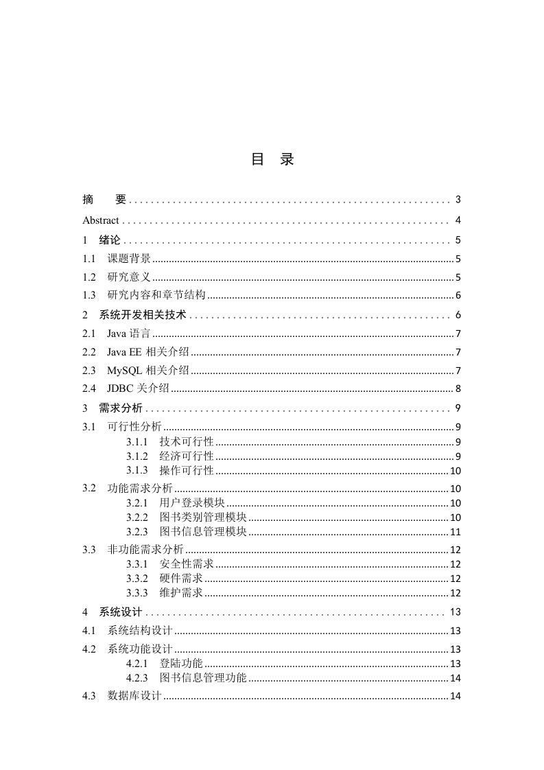 目录摘要Abstract.......................41绪论51.2研究意义…1.3研究内容和章节结构62系统开发相关技术。b2.1Java语言.72.2 Java EE相关介绍2.3 MySQL相关介绍…72.4JDBC关介绍.…3需求分析3.1可行性分析…93.1.1技术可行性93.1.2经济可行性93.1.3操作可行性103.2功能需求分析.103.2.1用户登录模块.103.2.2图书类别管理模块103.2.3图书信息管理模块.113.3非功能需求分析…3.3.1安全性需求3.3.2硬件需求123.3.3维护需求4134.1系统结构设计…134.2系统功能设计.…134.2.1登陆功能….134.2.3图书信息管理功能144.3数据库设计….145系统实现155.1用户登录界面.5.2图书类别管理界面5.3图书信息管理界面195.4功能界面实现原理5.5数据库实现…22246.1用户登录测试6.2图书类别管理测试6.3图书信息管理测试7总结与展望.267.1总结参考文献27致28摘要现代大多数学校图书藏量种类繁多,各种类别的图书没有一个统一的管理平台,不同类别的图书区分上容易混淆,同种类别的图书入馆出馆记录困难。因此,开发此款软件成功解决了上述问题。图书管理系统更注重轻量化,管理人员只需进行简单操作,即可完成图书类别的增删改查操作和同种类别下图书的增删改查操作。这是一款以C/S为架构方式、采用Eclipse为开发环境、利用Sqlyog作为数据库服务器、并基于Java语言开发的图书管理系统。本系统具有运行速度快、安全性高、移植性强等特点。关键词:图书管理;Java;数据库;