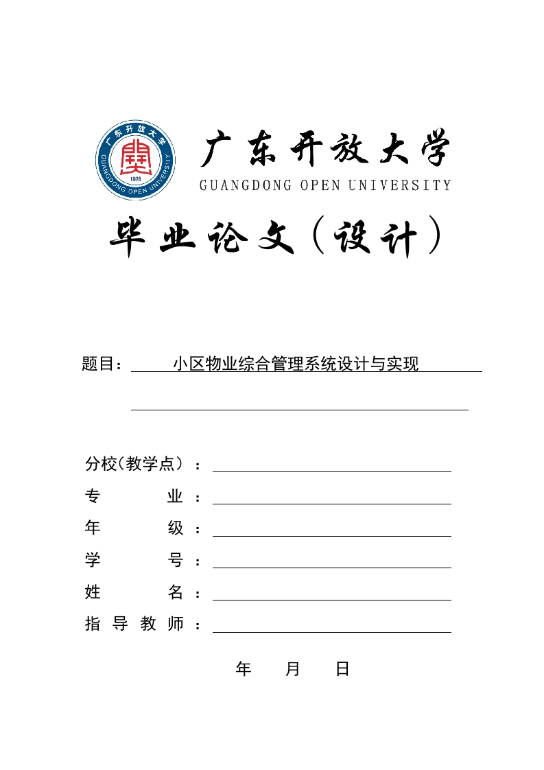 广东开放大学GUANGDONG OPEN UNIVERSITY题目:小区物业综合管理系统设计与实现分校(教学点)专业年级学号姓名指导教师:年月日毕业论文(设计)诚信声明本人所呈交的毕业论文(设计),是在指导教师指导下进行研究工作所取得的成果,所有数据、图片资料均真实可靠。除文中己经注明引用的内容外,本毕业论文(设计)的研究成果不包含任何他人已公开发表或者没有公开发表的作品或成果。对本论文(设计)所涉及的研究工作做出贡献的其他个人和集体,均已在文中以明确方式标明。本人完全意识到本声明的法律责任由本人承担。作者签名:日期:年月日毕业论文(设计)版权使用授权声明本人完全了解广东开放大学关于收集、保存、使用毕业论文(设计)的规定,同意如下各项内容:按照学校要求提交论文(设计)的印刷本和电子版本:学校有权保存论文(设计)的印刷本和电子版,并采用影印、缩印、扫描、数字化或其它手段保存论文:学校有权提供目录检索以及提供本毕业论文(设计)全文或者部分的阅览服务,以及出版毕业论文(设计);学校有权按有关规定向国家有关部门或者机构送交论文的复印件和电子版:在不以赢利为目的的前提下,学校可以适当复制论文的部分或全部内容用于学术活动。作者签名:日期:年月日摘要目前物业公司的数量急剧增加,竞争也在不断加强,然而很多的物业公司仍然采用传统的人工管理,这样的管理常常导致问题的产生,而且效率也极低。如何更高效的进行物业管理是现阶段物业公司所面临的问题。本文介绍的物业管理系统,可以很好的管理小区内物业人员和业主人员信息,而且业主同时可以通过系统实现物业费管理和在线报修等功能,十分的方便。本文系统是基于Java技术下开发的,选择Tomcat作为Web服务器,采用MySql数据库。系统能够完成登录模块,管理员功能模块、系统基础功能、报修模块、投诉模块、在线留言模块、物业费用模块等模块的功能。关键词:物业管理:信息化;MySQL;B/S模式;Java