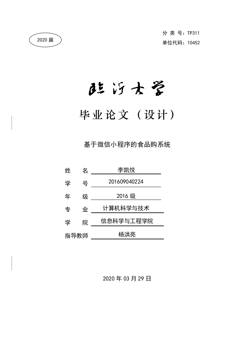 分类号:TP3112020届单位代码:10452毕业论文(设计)基于微信小程序的食品购系统姓名李凯悦学号201609040224年级2016级专业计算机科学与技术学院信息科学与工程学院指导教师杨洪亮2020年03月29日摘要随着互联网的迅猛发展,关于购物的各种网站、手机应用软件也变得越来越多姿多彩。有些大型的购物网站和应用程序的功能太过复杂,界面过多,对于购物而言不够便利。而随着微信的逐渐发展,使得微信小程序购物更加方便的一种途径。该系统使用微信开发者工具开发用户使用的小程序端页面,采用了jaa开发技术和ySQL数据库技术对系统的后台数据进行管理,实现了网上进行浏览商品,选择自己喜欢的商品,实现网络形式的购物。管理员通过注册登录后可以对商品、用户、订单等信息进行维护和管理,包括实现对商品等信息的增删改查等操作,从而促进了食品购系统的后台维护和成功运行。该系统为实现人们更便捷、更高效的购物行为创造了可能性。关键词:微信小程序;网上购物:java:mysqlI