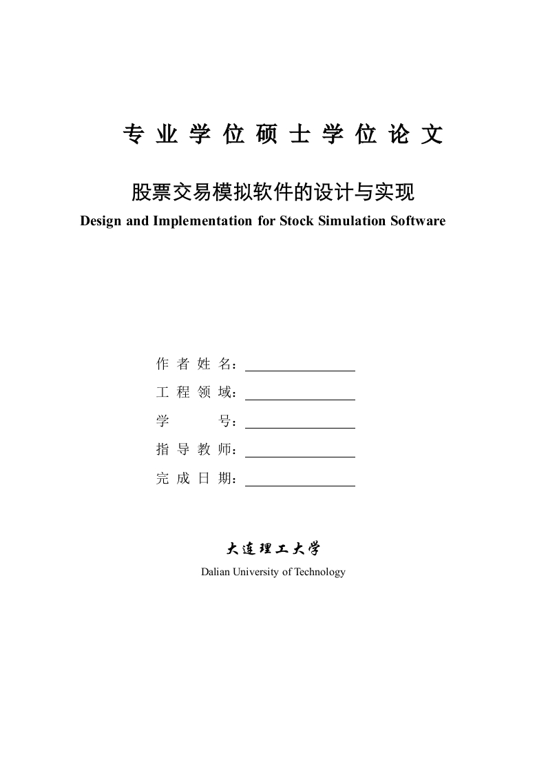 专业学位硕士学位论文股票交易模拟软件的设计与实现Design and Implementation for Stock Simulation Software作者姓名:工程领域:学号:指导教师:完成日期:大连理工大学Dalian University of Technology大连理工大学学位论文独创性声明作者郑重声明:所呈交的学位论文,是本人在导师的指导下进行研究工作所取得的成果。尽我所知,除文中已经注明引用内容和致谢的地方外,本论文不包含其他个人或集体已经发表的研究成果,也不包含其他已申请学位或其他用途使用过的成果。与我一同工作的同志对本研究所做的贡献均已在论文中做了明确的说明并表示了谢意。若有不实之处,本人愿意承担相关法律责任。学位论文题目:作者签名:日期:年月日大连理工大学专业学位硕士学位论文摘要国内股票行业发展时间很长,在几十年的发展中,从没有到出现,从少数人炒股的最初发展时期到现在全民高潮时期,从只有少部分上市企业到现在国内创建了超过两千家上市企业。国内股票行业得到非常显著的进步,且逐渐向更加完善的行业进发。股票行业的进步对国内经济的长久稳定发展有十分关键的影响。在一定层面上促进了国内经济的持续进步,为国有公司变革以及国家经济的长久稳定发展准备了相应的基础。在目前的环境中,炒股就逐渐变成民众比较关键的理财模式。所以设计比较符合民众需要的股票研究软件是非常关键的,对于国内股票领域的长久进步有关键的影响。本文根据炒股早期学习人员的特点,研发了比较浅显明白,容易执行的股票研究软件。具体的操作界面直接简单,便于使用者快速掌握消息,对于早期炒股的股民来讲早期学习是非常关键的,此软件可添加模拟炒股等职能。其重点作用可以被划分成下面几个部分:设定部分,视图部分以及功能部分,上述部分中的设定部分主要负责对股票参数的设定,视图部分主要负责股票资料的视图展示,可以让使用者全面的研究资料。上述软件业涵盖了炒股所需要的全部需求,比如主要参数设定,个股均线图、K线图展示,历史记载图片储存以及仿照炒股等作用,对于部分使用者炒股需要研究的主要参数都进行了清楚的展示:此外为了更好的提高使用者的体验效果,本软件研发了注册界面、使用者登陆界面、登出以及具体管理界面。其可以很好的协助炒股早期学习的人员掌握具体的程序,全面了解主要的技巧。本文最先阐述了股票有关常识,之后利用需求探究以及系统探究对软件的后续设计开展了全面的叙述,在需求探究方面对软件需要最终完成的作用进行叙述,在系统研发方面对软件的功能部分开展了详细的分类,且根据每方面职能的实施提出了研发观点以及阻碍,应用C+完成了软件具体的功能部分,且使用MFC完成股票探究软件界面,最终对其开展详细的功能检测。在完成的时候使用了比较多的计算机科技,其中就包含了服务器编写,数据库访问管控,安全方案设定以及确保等。另外,也根据目前模拟软件出现的工作效率不高,消息传播不快以及不精准等众多问题,对其进行改良,然后进一步达到准确、快速、高效的最终目标。另外,为确保消息传送的精准性,本软件还增加了一定的安全保障,确保了最后的操作以及资料安全。关键词:模拟炒股软件;股票分析:信息安全;设计与实现
