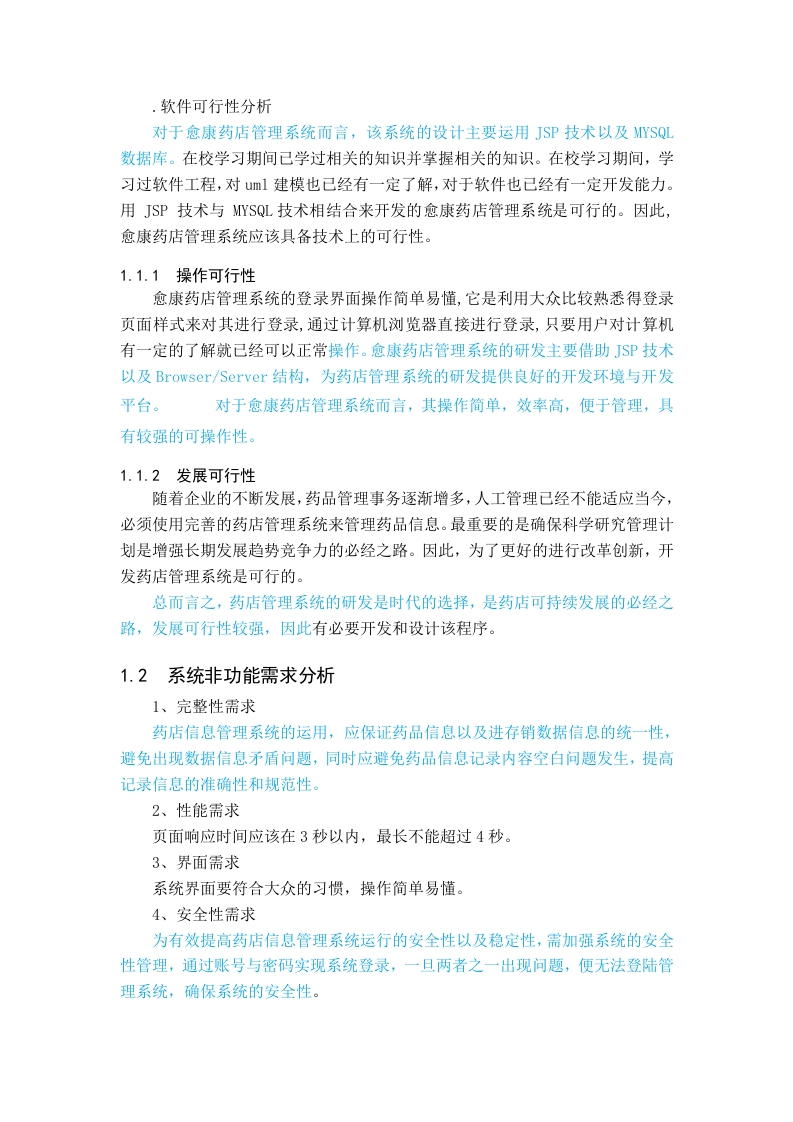 ,软件可行性分析对于愈康药店管理系统而言,该系统的设计主要运用JSP技术以及MYSQL数据库。在校学习期间已学过相关的知识并掌握相关的知识。在校学习期间,学习过软件工程,对um1建模也已经有一定了解,对于软件也已经有一定开发能力。用JSP技术与MYSQL技术相结合来开发的愈康药店管理系统是可行的。因此,愈康药店管理系统应该具备技术上的可行性。1.1.1操作可行性愈康药店管理系统的登录界面操作简单易懂,它是利用大众比较熟悉得登录页面样式来对其进行登录,通过计算机浏览器直接进行登录,只要用户对计算机有一定的了解就已经可以正常操作。愈康药店管理系统的研发主要借助JSP技术以及Browser,/Server结构,为药店管理系统的研发提供良好的开发环境与开发平台。对于愈康药店管理系统而言,其操作简单,效率高,便于管理,具有较强的可操作性。1.1.2发展可行性随着企业的不断发展,药品管理事务逐渐增多,人工管理已经不能适应当今,必须使用完善的药店管理系统来管理药品信息。最重要的是确保科学研究管理计划是增强长期发展趋势竞争力的必经之路。因此,为了更好的进行改革创新,开发药店管理系统是可行的。总而言之,药店管理系统的研发是时代的选择,是药店可持续发展的必经之路,发展可行性较强,因此有必要开发和设计该程序。1.2系统非功能需求分析1、完整性需求药店信息管理系统的运用,应保证药品信息以及进存销数据信息的统一性,避免出现数据信息矛盾问题,同时应避免药品信息记录内容空白问题发生,提高记录信息的准确性和规范性。2、性能需求页面响应时间应该在3秒以内,最长不能超过4秒。3、界面需求系统界面要符合大众的习惯,操作简单易懂。4、安全性需求为有效提高药店信息管理系统运行的安全性以及稳定性,需加强系统的安全性管理,通过账号与密码实现系统登录,一旦两者之一出现问题,便无法登陆管理系统,确保系统的安全性。1.3系统功能需求分析该系统是jsp+mysql实现的愈康药店管理系统,该系统可以对三种类型的用户使用实现:1.对于游客,游客可以在网站进行浏览和查询药品资料,但不具有药品购买等权限,只有通过信息注册,拥有账号和密码登录系统后,才具有相应权限。2.系统的普通用户,通过系统完成信息注册,具有账号和密码,在登录系统后,能够实现物品的搜索,浏览以及购买。同时在个人中心栏中,可以对购买订单进行查看,以及修改个人信息等。3.系统管理员,具有较高权限,能够对系统药品信息进行分类,密码管理修改,删除,添加等。对已支付的订单进行发货处理。1.3.1系统角色需求分析用户的需求主要是以下四个方面:1、系统的注册登录需求:系统用户可以通过,在系统首页进行信息注册,拥有账号密码,实现系统登录。2、药品浏览需求:普通用户能够对所需药品进行搜索,查看药品详细信息以及注意事项等。3、购买药品需求:当用户确定购买药品后,可通过点击药品添加至购物车实现药品购买。4、订单管理的需求:当药品购买完成后,用户可在个人中心中查看订单详情。后台管理员的需求主要是以下4个方面:1、管理药品需求:系统的后台管理权限拥有药品添加,修改以及删除等权限。2、药品分类需求:系统后台管理员能够根据药品特性进行分类,便于查找管理等。3、管理用户需求:系统后台管理员能够对用户进行添加,删除等管理工作。4、管理订单需求:系统后台管理员能够通过查看订单信息,进行药品统计,库存与销售统计等工作。1.3.2系统用例图和功能分析对于系统用例图而言,能够有效的形容用户,需求以及功能三者之间的联系,本质上作为系统功能模型图显示,便于观察。对于系统用户端而言,功能丰富,主要包括系统登录注册,药品的搜索,查阅以及购买等功能。具体如下图所示。1、系统的注册登录功能在系统用户端中,用户通过信息注册,拥有账号密码,实现系统登录,并可以在个人中心中,对个人信息进行编辑等。2、药品的选择与查看用户在系统登录后,可以通过对药品进行搜索,查看,了解药品药效以及注意事项等,进而选择自己需要的药品。点击药品可以查看药品的详细信息。3、商品购买功能用户可以把自己需要的药品加入购物车,可在购物车选择需要的数量,并进行支付。4、订单管理功能用户可以通过订单管理页面查看自己购买的药品的发货状态。注册登录搜索商品用户查看商品管理购物车查看订单图3-1用户端用例图管理员端用例图和功能对于系统后台管理员而言,权限广,包括对药品的分类管理,添加,删除,用户管理等功能。具体如下图所示。1、登录功能系统后台管理员在进行系统登录时,只能通过账号密码进行登录,普通用户未有权限登录,显示登陆账号未注册,登录失败。2、用户管理功能