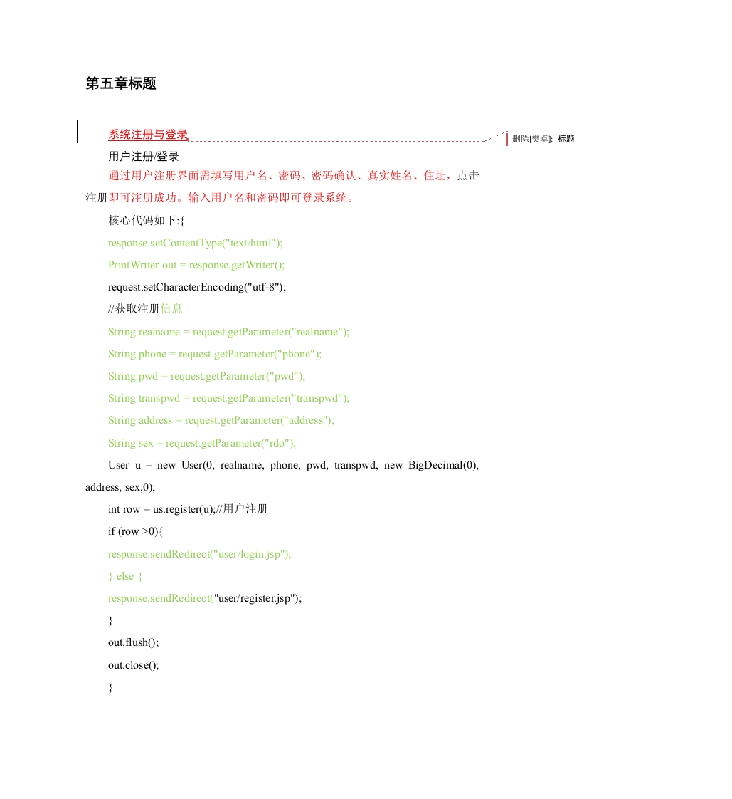 第五章标题系统注册与登录删除[樊卓:标题用户注册/登录通过用户注册界面需填写用户名、密码、密码确认、真实姓名、住址,点击注册即可注册成功。输入用户名和密码即可登录系统。核心代码如下:{response.setContentType("text/html");Print Writer out response.get Writer(;request.setCharacter Encoding("utf-8");∥获取注册信息String realname request.getParameter("realname");String phone request.getParameter("phone");String pwd request.getParameter("pwd");String transpwd =request.getParameter("transpwd");String address=request.getParameter("address");String sex request.getParameter("rdo");User u new User(0,realname,phone,pwd,transpwd,new BigDecimal(0),address,sex,0);int row=us.register(u;W用户注册if (row >0){response.sendRedirect("user/login.jsp");elseresponse.sendRedirect("user/register.jsp");out.flush();系统界面首页依据wb系统的设计原理,页面的设计要求应该是简洁明确,注重使用者的体验,本网站的首页用户:div+css方式进行网站布局,层次结构鲜明,整个公司网站的内部页面色彩设计也是色彩简洁,导航条采用蓝色养眼设计,商品商品的分类及购物车使用橘色凸显。在网站的首页,用户可以按照自己的喜好进行选择登录、检索商品等操作。运行结果如图5-1所示。小米5X立减100元13990图51网站首页图商品展示商品显示界面就是系统使用者可以浏览各个种类的商品资料等信息的一个主要接口。根据不同的归属划分类(如手机、电脑、电视)进行浏览,也可以在首页“搜索”框中输入关键字进行搜索,不同的分类其商品信息也不相同,但是功能风格相同,在这里只给出“小米X5”这个男装商品的展示界面。每种商品都小图片和简介的形式来展示,用户单击“查看详情”按钮,您就已经能够快速查看并找到所有在售商品的相关详细资料和经过放大后的所有商品详细图像,并以直观方式为您示例。购物车用户可以将需要购买的商品加入到购物车中,在购物车的操作界面中,用户T可以在您的购物车中对所有商品中的数量个别进行自动管理,您可以随时修改您的人在购物车中可能发现的所有商品个别右键点击结算,进入下一订单页面,购物车的界面如图5-2所示。图52购物车界面图核心代码如下:{response.setContentType("text/html");request.setCharacterEncoding("utf-8");Print Writer out response.get Writer();String type request.getParameter("type");if (type.equals("addCart")){addMyCart(out,request);//else if(type.equals("delCartBygid")){delMyCartBygid(out,request);/else if(type.equals("delCartByuid")){delMyCartByuid(out,request);//else if(type.equals("updateCart")){updateMyCart(out,request);//}out.flush();}提交订单用户通过点击图5-3中购物车界面的“提交订单”按钮,或者通过点击图5-2中“立即购买”按钮即可进入订单界面。在订单界面中,会让用户填写一个订单,订单填写页面上会出现一些用户自己默认的数据都是在后台上传下来的,还可能是用户需要在网站上填写商品的数量、客户收货时间和地址、邮编、以及联系电话等信息。用户完成填写后就可以提交订单。点击提交订单后,后台会为该用户添加一条订单记录到订单表中。提交订单界面如图5-3所示。