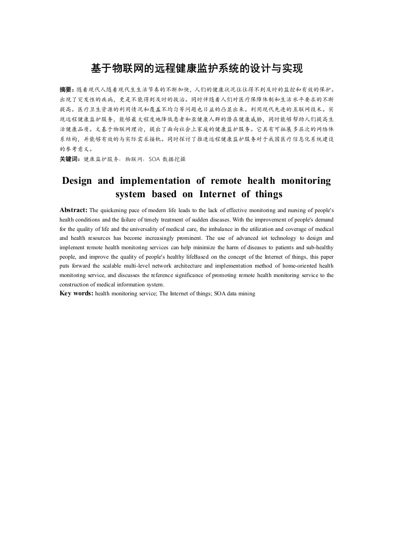 基于物联网的远程健康监护系统的设计与实现摘要:随着现代人随着现代生生活节奏的不断加快,人们的健康状况往往得不到及时的监控和有效的保护。出现了突发性的疾病,更是不能得到及时的微治。同时伴随着人们对医疗保脖体制和生活水平要求的不断提高。医疗卫生资源的利用情况和覆盖不均匀等问题也日蓝的凸显出来。利用现代先进的互联网技术。实现远程健康监护服务,能够最大程度地降低患者和亚健康人群的潜在健康威胁,同时能够帮助人们提高生活健康品质。文基于物联网理论,提出了面向社会上家庭的健康监护服务。它具有可拓展多层次的网络体系结构,并能够有效的与实际需求接轨。同时探讨了推进远程健康监护服务对于我国医疗信息化系统建设的参考意义。Design and implementation of remote health monitoringsystem based on Internet of thingsAbstract:The quickening pace of modern life leads to the lack of effective monitoring and nursing of people'shealth conditions and the failure of timely treatment of sudden diseases.With the improvement of people's demandfor the quality of life and the universality of medical care,the imbalance in the utilization and coverage of medicaland health resources has become increasingly prominent.The use of advanced iot technology to design andimplement remote health monitoring services can help minimize the harm of diseases to patients and sub-healthypeople,and improve the quality of people's healthy lifeBased on the concept of the Internet of things,this paperputs forward the scalable multi-level network architecture and implementation method of home-oriented healthmonitoring service,and discusses the reference significance of promoting remote health monitoring service to theconstruction of medical information system.Key words:health monitoring service;The Internet of things;SOA data mining目录第一章、绪论.1.1.1市场需求与研究必要性1.1.2国内外应用和研究现状....21.2论文的内容与意义.....3第二章、研发与分析思路...32.1系统框架特征...452.2.1.系统目标概述....52.2.2功能分析与性能要求...72.3物联网技术的概念与引入..8第三章、系统全面设计与功能实现.·93.1功能子系统设计与实现...103.1.1咨询就诊导引服务系统..113.1.2信息汇集分析服务系统..3.1.3资源搜寻异构物联系统.·12133.2系统互联关键技术解决方案14143.2.2终端系统互联的结构设计..163.2.3系统异构的互联应用流程.…17参考文献.17致谢…17第一章、绪论1.1研究背景随着现代社会生活水平的提高和生存竞争压力的增加,健康问题越来越受到人们的关注,人们的医疗意识也越来越强。然而,传统的医疗模式和医疗理念正在从以医院为中心向以病人为中心、以家庭为中心、从治疗为中心向预防为中心、健康为中心转变。世界各国正在积极探索一种新的医疗服务模式,以提供更高质量、更可靠、更可接受和更低成本的远程医疗卫生服务。1.1.1市场需求与研究必要性到目前为止,全球医疗卫生安全水平的发展还没有达到人们的预期。全民健康服务的发展取决于成本、渠道、覆盖率等问题。医疗卫生行业面临三大挑战:医疗体系效率低下、医疗服务质量不高、看病难、看病贵。我国的一个基本国情是医疗资源总量严重不足,分布极不平衡。世界上极为有限的1-3%左右的医疗卫生资源被用来解决世界22%人口的健康问题。据统计,大部分的医疗卫生费用主要用于治疗少数患者的疾病,而健康的人口只占用了不到10%的医疗费用,要改变这种局面,将重点的整个过程生命健康监测、疾病控制、设置同时服务于健康和不健康的人的远程医疗、健康监测和维护管理系统。一方面,解决长期慢性疾病和亚健康人群的监护,另一方面,解决突发疾病和家庭护理,并积极探索新的医疗服务模式,需要做出重大改变现有的医疗系统,医疗和保健服务通过整合资源,提出并探索远程医疗服务,提供更高质量、更可靠和低成本的医疗卫生服务。因此,远程医疗服务整合医疗资源,扩大医疗机构的覆盖面。本质上可以理解为面向社区、家庭、康复机构的远程医疗健康数字化系统,服务对象几乎覆盖所有人群。在灾难中受伤,孕产妇、新生儿,老年人,残疾人,慢性病患者,急诊病人和人口处于一种亚健康的状态等潜在的服务对象,其应用领域覆盖最基本的人体生理研究、紧急医疗的发展,提高健康水平和家庭在农村地区的家庭医疗保健,将会打破现有的医疗服务模式,改善医患关系,扩大服务覆盖度,扩大医疗资源利用率,强化优质资源普及性,从整体上降低医疗卫生服务成本,及时提供医疗卫生服务。