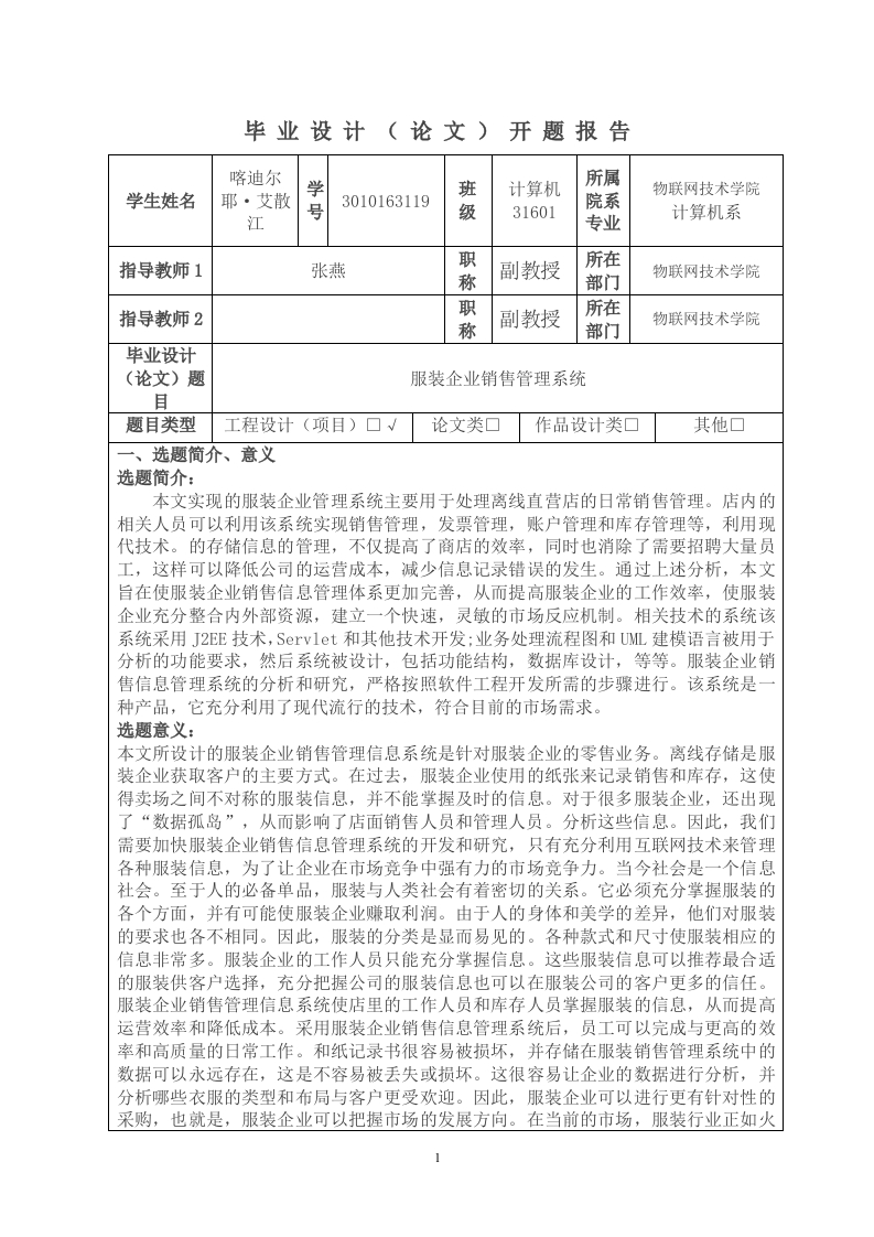 毕业设计(论文)开题报告喀迪尔所属物联网技术学院学生姓名耶·艾散学3010163119班计算机31601院系江级专业计算机系指导教师1张燕职称副教授所在部门物联网技术学院指导教师2职所在物联网技术学院称副教授部门毕业设计(论文)题服装企业销售管理系统题目类型工程设计(项目)口√论文类口作品设计类口一、选题简介、意义选题简介:本文实现的服装企业管理系统主要用于处理离线直营店的日常销售管理。店内的相关人员可以利用该系统实现销售管理,发票管理,账户管理和库存管理等,利用现代技术。的存储信息的管理,不仅提高了商店的效率,同时也消除了需要招聘大量员工,这样可以降低公司的运营成本,减少信息记录错误的发生。通过上述分析,本文旨在使服装企业销售信息管理体系更加完善,从而提高服装企业的工作效率,使服装企业充分整合内外部资源,建立一个快速,灵敏的市场反应机制。相关技术的系统该系统采用J2EE技术,Servlet和其他技术开发:业务处理流程图和UML建模语言被用于分析的功能要求,然后系统被设计,包括功能结构,数据库设计,等等。服装企业销售信息管理系统的分析和研究,严格按照软件工程开发所需的步骤进行。该系统是一种产品,它充分利用了现代流行的技术,符合目前的市场需求。选题意义:本文所设计的服装企业销售管理信息系统是针对服装企业的零售业务。离线存储是服装企业获取客户的主要方式。在过去,服装企业使用的纸张来记录销售和库存,这使得卖场之间不对称的服装信息,并不能掌握及时的信息。对于很多服装企业,还出现了“数据孤岛”,从而影响了店面销售人员和管理人员。分析这些信息。因此,我们需要加快服装企业销售信息管理系统的开发和研究,只有充分利用互联网技术来管理各种服装信息,为了让企业在市场竞争中强有力的市场竞争力。当今社会是一个信息社会。至于人的必备单品,服装与人类社会有着密切的关系。它必须充分掌握服装的各个方面,并有可能使服装企业赚取利润。由于人的身体和美学的差异,他们对服装的要求也各不相同。因此,服装的分类是显而易见的。各种款式和尺寸使服装相应的信息非常多。服装企业的工作人员只能充分掌握信息。这些服装信息可以推荐最合适的服装供客户选择,充分把握公司的服装信息也可以在服装公司的客户更多的信任。服装企业销售管理信息系统使店里的工作人员和库存人员掌握服装的信息,从而提高运营效率和降低成本。采用服装企业销售信息管理系统后,员工可以完成与更高的效率和高质量的日常工作。和纸记录书很容易被损坏,并存储在服装销售管理系统中的数据可以永远存在,这是不容易被丢失或损坏。这很容易让企业的数据进行分析,并分析哪些衣服的类型和布局与客户更受欢迎。因此,服装企业可以进行更有针对性的采购,也就是,服装企业可以把握市场的发展方向。在当前的市场,服装行业正如火服装企业销售管理系统如茶。因此,服装企业销售信息管理系统的研究和分析,本文在未来有很大的价值,它更适合服装企业使用的信息化管理。服装企业销售管理系统二、课题综述(课究,主要研究的内容,要解决的问题,预期目标,研究步骤、方法及措施等)课题研究:研究内容本文研究的系统是按照软件工程导论要求的步骤来进行设计实现的,主要是使用L建模、MYSQL数据库、面向对象设计等方法来完成系统的设计与实现,具体分析了该销售管理信息系统的服装基本信息管理、服装价格管理等功能模块得业务流程等,也分析其架构、数据库设计和一些非功能性需求等。研究步骤第一步本文主要是采用了面向对象分析方法和UML建模方法,开发技术使用了SQL数据库、J2EE等:第二步是系统需求分析部分,主要是采用了业务流程图对系统的业务进行了描述,使用L用例图对功能需求进行描述,并且说明了非功能性需求:第三步是系统设计与实现部分,主要按照功能模块对系统功能进行详细设计和编码实现,并且使用了流程图描绘各个功能的内外部实现过程:最后一步是总结和展望部分,对总结论文相关工作,并给出未来的展望计划研究方法,1UML建模语言UL是一种面向对象的建模语言。可视化和标准化的接口设置可以方便用户的使用。UL建模语言提供了多种建模的图,其中,用例图是用于获得用户的功能要求,静态描述边界和系统的主要功能的有用的工具。对于L建模语言,图形是它的核心。ML建模语言的图形主要分为以下三类:静态图,动态图和物理图。UL建模语言的三个图可以完整地描述一个系统内部。各种数据的关系。本文分析设计过程中,我们主要是使用了L建模语言中的用例图和活动图。2.MySQL数据库技术大多数系统有大量的数据需要存储和MySQL一直是流行的数据管理工具。这是一个关系型数据库管理工具,特别是当它涉及到Wb开发。。MySQL的处理在不同的数据表不同的数据,并且有这些数据表之间的一定的相关性,这使得数据表之间的处理更加灵活,可以提高开发效率。与此同时,MySQL是一个轻量级的数据库,开源,使得整体使用成本比较.3.SSH框架SSH框架是当前Web开发过程中比较流行的一种开源框架,对于SSH框架的运用,可以使得开发人员在短期内快速搭建好一个可复用性比较高、结构清晰,便于后期维护的系统。通常对于SSH框架的使用,会结合MVC分层结