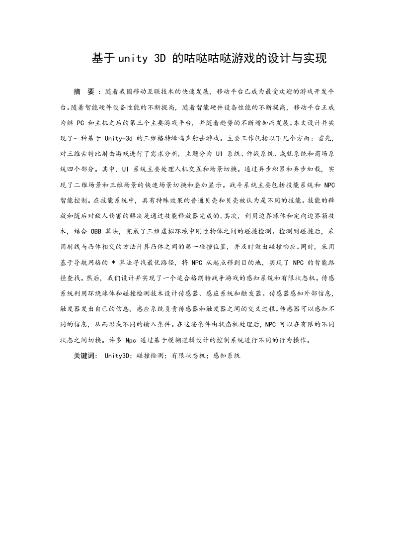 基于unity3D的咕哒咕哒游戏的设计与实现摘要:随肴我国移动互联技术的快速发展,移动平台已成为最受欢迎的游戏开发平台。随希智能硬件设备性能的不断提高,随希智能硬件设备性能的不断提高,移动平台正成为继P℃和主机之后的第三个主要游戏平台,并随肴趋势的不断增加而发展。本文设计并实现了一种基于Uity-3d的三维格特蜂鸣声射击游戏。主要工作包括以下几个方面:首先,对三维古特比射击游戏进行了需求分析,主题分为U川系统、作战系统、成就系统和商场系统四个部分。其中,U川系统主要处理人机交互和场景切换。通过异步积累和异步加载,实现了二维场景和三维场景的快速场景切换和叠加显示。战斗系统主要包括技能系统和NPC智能控制。在技能系统中,具有特殊效果的普通贝壳和贝壳被认为是不同的技能。技能的释放和随后对敌人伤害的解决是通过技能释放器完成的。其次,利用边界球体和定向边界箱技术,结合0BB算法,完成了三维虚拟环境中刚性物体之间的碰撞检测。检测到碰撞后,采用射线与凸体相交的方法计算凸体之间的第一碰撞位置,并及时做出碰撞响应。同时,采用基于导航网格的*算法寻找最优路径,将NPC从起,点移到目的地,实现了NPC的智能路径查找。然后,我们设计并实现了一个适合格朗特战争游戏的感知系统和有限状态机。传感系统利用环绕球体和碰撞检测技术设计传感器、感应系统和触发器。传感器感知外部信息,触发器发出自己的信息,感应系统负责传感器和触发器之间的交义过程。传感器可以感知不同的信息,从而形成不同的输入条件。在这些条件由状态机处理后,PC可以在有限的不同状态之间切换。许多Nc通过基于模糊逻辑设计的控制系统进行不同的行为操作。关键词:Unity:3D:碰撞检测:有限状态机:感知系统目录第一章绪论…21.1论文的研究背景和意义1.2国内外研究现状及发展趋势1.2.1国外研究现状.31.2.2国内研究现状.…1.3研究内容及结构安排41.3.1研究内容第二章游戏引擎及相关技术概述…2.1主流手机游戏开发引擎52.1.1 Unity:3D游戏引擎.2.1.2 Unreal Engine4游戏引擎.2.l.3 Cry Engine3游戏引擎.72.2相关技术概述第三章咕哒咕哒战争游戏的设计与实现3.1咕哒咕哒战争游戏开发计划及功能设计.…3.1.1游戏开发计划…3.1.2功能设计…3.2咕哒咕哒战争游戏场景的设计与实现3.2.12D场景的设计与实现103.2.23D场景的设计与实现113.3核心系统的设计与实现…3.4咕哒咕哒战争游戏数据库的设计与实现..14致谢.16.16第一章绪论1.1论文的研究背景和意义从1998年吃蛇的人到现在国王的辉煌,手机游戏已经发展了近20年。蛇吃是诺基亚手机上发布的首款手机游戏。虽然它只包含黑白2d游戏像素图形,但它拥有超过3.5亿玩家。手机游戏从此开始发展,但由于当时手机性能不佳,手机游戏都是2D游戏。例如,俄罗斯方块在2000年,点击革命在2007年和愤怒的小鸟在2009年。随着2010年iPhone4的发布,手机已经从第九宫键盘移动到触摸屏模式。手机的操作方式发生了变化。这不仅仅是关于顶部和底部的问题。就像2011年的坦普尔跑,它已经是一个3d手机游戏2-]。此后,手机游戏进入了快速发展的黄金时期。虽然手机游戏发展了很短的时间,但发展非常快。到目前为止,他们已经形成了一个以角色扮演、体育、战略、动作、拼图、国际象棋和纸牌为主体的强大产业。丰富的手机游戏吸引了成千上万的玩家。各大游戏厂商都瞄准市场,大力发展手机游戏。手机游戏的发展到今天基本上已经有了与p℃竞争的阶段。首先,目前的应用程序有一个统一的平台,为开发人员提供了统一可靠的基础。此外,开发人员还可以获得开发社区的支持,并有专门的支付渠道和展示空间来发布他们的伟大想法。最后但并非最不重要的是,今天的智能手机提供了一个全面的API接口,高性能处理器为手机游戏扫清了最后的障碍。1.2国内外研究现状及发展趋势虽然游戏产业在国外首先被开发了,国内游戏产业也迅速地发展。与影视娱乐行业相比,游戏产业的年产值一直走在前列。截至2016年12月,中国移动互联网用户规模达到5.23亿,市场规模达到783.2亿元。增长率继续放缓。在现代快节奏、高压的社会里,手机已经成为人们不可或缺的东西。手机游戏以其有趣的广域无线网络在线互动,在现实生活中遇到了一些希望和精神享受和释放。因为游戏行业的发展红利太大,所以有很多游戏公司都在开发各种类型的游戏。