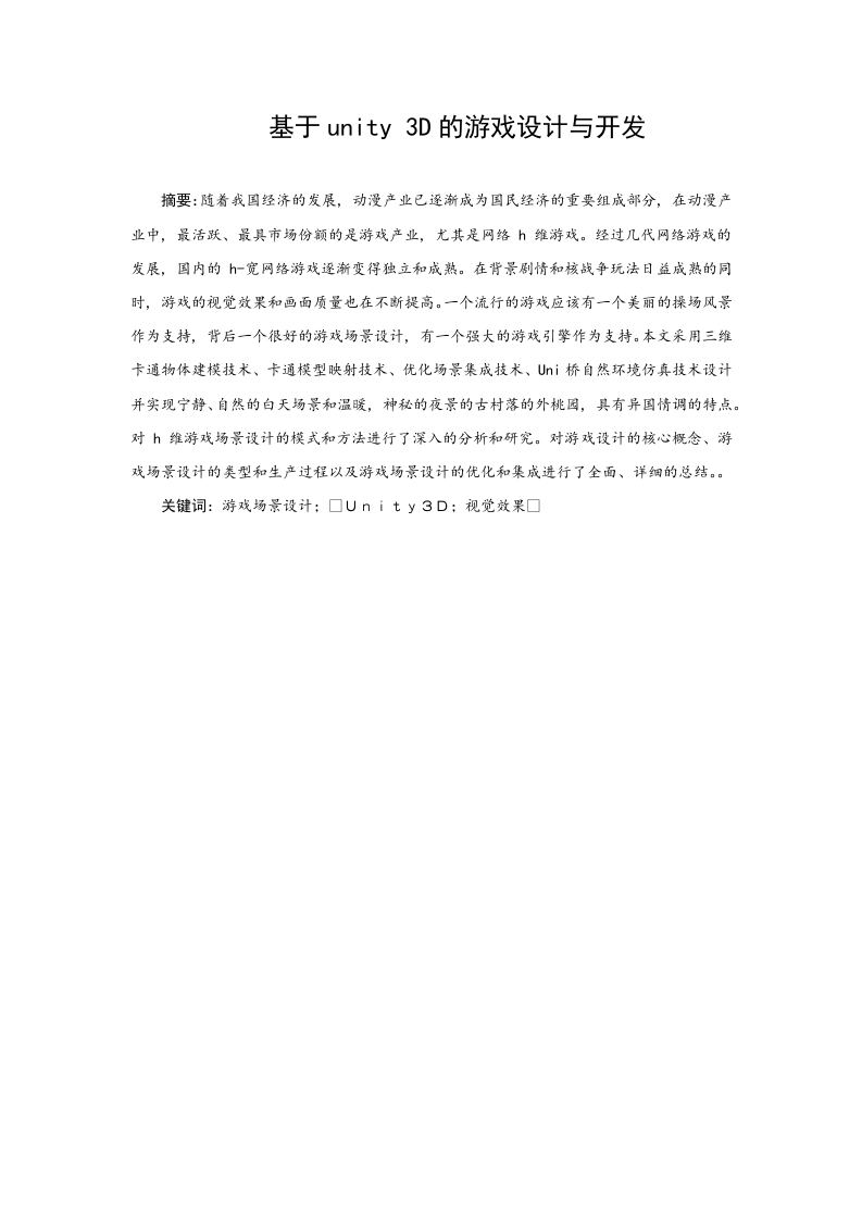 基于unity3D的游戏设计与开发摘要:随肴我国经济的发展,动漫产业已逐渐成为国民经济的重要组成部分,在动漫产业中,最活跃、最具市场份颜的是游戏产业,尤其是网络维游戏。经过几代网络游戏的发展,国内的宽网络游戏逐渐变得独立和成熟。在背景刷情和核战争玩法日益成熟的同时,游戏的视觉效果和画面质量也在不断提高。一个流行的游戏应该有一个美丽的操场风景作为支持,背后一个很好的游戏场景设计,有一个强大的游戏引擎作为支持。本文采用三维卡通物体建模技术、卡通模型映射技术、优化场景集成技术、Uⅰ桥自然环境伤真技术设计并实现宁静、自然的白天场景和温暖,神秘的夜景的古村落的外桃园,具有异国情调的特点。对h维游戏场景设计的模式和方法进行了深入的分析和研究。对游戏设计的核心概念、游戏场景设计的类型和生产过程以及游戏场景设计的优化和集成进行了全面、详细的总结。。关键词:游戏场景设计:☐Un i t y3D:视觉效果☐目录第一章绪论21.1研究背景21.2研究的目的和意义31.2.1研究目的41.2.2研究意义51.3研究的内容与方法51.3.1研究的内容61.3.2研究的方法6第二章三维游巧场景与Un1ty3D的概念和综述72.1三维游戏的起源和发展72.2游戏场景设计2.2.1游戏场景设计的概念92.2.2国内的游戏场巧设计的发展现状112.3 Un i ty3D引擎…2.3.1 Un i ty3D引擎的简介122.3.2 Un i ty3D与其他游戏引擎的对比132.4 Un i ty3D在三维游戏场景设计中的应用第三章三维游戏场景的具体实现EEEEEEEEEEEEEEEEEE3.1三维游戏场景设计3.1.1三维游戏场景设计的功能3.1.2三维游戏场景的类型和风格3.1.3三维游戏场景的设计方法173.2三维游戏场景设计的过程解析193.2.1三维游戏场景设计的前期准备193.2.2三维游戏场景设计的模型制作203.2.3三维游戏场景设计的贴图制作第四章总结…23致谢24参考文献ロロロ游戏引擎一直被描述为游戏的引擎。一个好的游戏不仅有很好的核心,而且有更好的画面效果和更逼真的动画效果。本文主要研究了今天流行的游戏引擎-uity3D的游戏引擎,并讨论了游戏场景的设计思想和实现方法。在本章中,我主要简要概述了游戏场景设计的开发背景;简要介绍了本研究的目的和意义:并阐述了本文的论文工作和组织框架。口口1.1研究背景随着数字信息技术和网络技术的发展,传统的电子游戏也受到了颠覆性的影响。从独立游戏到网络独立游戏,再到现在的大型网络游戏,网络游戏作为动漫游戏行业的主要支柱,迎来了其最好的时代。此前,据权威数据研究所荷兰市场研究公司纽动物园Newzoo)称,《2015年全球游戏市场报告》(图1.1)。