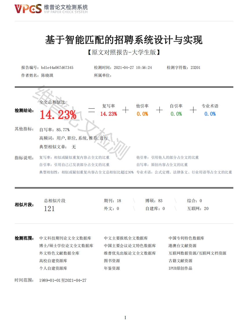 维普论文检测系统VIP PAPER CHECK SYSTEM基于智能匹配的招聘系统设计与实现【原文对照报告-大学生版】报告编号:bd1e44a067d67345检测时间:2021-04-2710:56:24检测字符数:23201作者姓名:陈晓琪所属单位:全文总相似比复写率他引率自引率专业术语检测结论:14.23%14.23%0.0%0.0%0.0%其他指标:自写率:85.77%高频词:用户,职位,系统,推荐,进行典型相似文章:无指标说明:复写率:相似或疑似重复内容占全文的比重他引率:引用他人的部分占全文的比重自引率:引用自己已发表部分占全文的比重自写率:原创内容占全文的比重典型相似性:相似或疑似重复内容占全文总相似比超过30%专业术语:公式定理、法律条文、行业用语等占全文的比重总相似片段期刊:18博硕:83综合:0相似片段:121外文:0自建库:0互联网:20检测范围:中文科技期刊论文全文数据库中文主要报纸全文数据库中国专利特色数据库博士/硕士学位论文全文数据库中国主要会议论文特色数据库港澳台文献资源外文特色文献数据全库维普优先出版论文全文数据库互联网数据资源/互联网文档资源高校自建资源库图书资源古籍文献资源个人自建资源库年鉴资源IPUB原创作品时间范围:1989-01-01至2021-04-27维普论文检测系统VIP PAPER CHECK SYSTEM原文对照颜色标注说明:■自写片段■复写片段(相似或疑似重复)口引用片段(引用)■专业术语(公式定理、法律条文、行业用语等)db本科毕业设计(论文)基于智能匹配的招聘系统设计与实现学院信息工程学院专业信息工程专业年级班别2017级信息工程(3)班学号3217002513学生姓名陈晓琪指导教师何家峰2021年4月基于智能匹配的招聘系统设计与实现陈晓琪信息工程学院摘要随着高水平素质教育的普及,越来越多的高校毕业生涌入招聘市场,又由于文化产业的蓬勃发展和艺术类院校相比其他类型院校的文化课要求门槛低,让艺术类院校成为了高考报名热门高校,但艺术类毕业生的就业形势却十分严峻。通过对招聘系统市场调研,发现目前招聘市场上的招聘网站没有给艺术类的毕业生和艺术工作者提供一个更具有针对性的求职平台。由于信息技术和网络的飞速发展,我们生活在一个信息爆炸的时代。为了缓解信息爆炸让用户难以快速的获取到自己想要的信息的现象,机智的开发者给招聘系统加入了分类目录和搜索引擎,但该方法存在局限性。最有效的是推出一种符合用户期望的推荐招聘职位系统,其中涉及到基于不同方式的推荐算法。本文将通过分析招聘系统相关文献并进行相关调研,学习并掌握系统所使用到的相关技术,并结合使用场景分析不同的推荐算法原理和优缺点,最终实现基于内容时间因子算法的招聘系统的设计,并测试系统的稳定性和安全性。2维普论文检测系统VIP PAPER CHECK SYSTEM关键词:招聘系统,推荐算法,文艺工作者注:本设计(论文)选题来源于教师的企业科研项目(17HK0124)AbstractWith the popularization of high-level quality education,more and more college graduates arepouring into the recruitment market.Due to the vigorous development of cultural industry and thelow threshold of cultural courses in art colleges compared with other types of colleges,artcolleges have become popular colleges to apply for college entrance examination,but the employmentsituation of Art graduates is very severe.Through the market research of the recruitment system,it is found that the recruitment websitein the current recruitment market does not provide a more targeted job platform for art graduatesand art workers.Due to the rapid development of information technology and network,we live in anera of information explosion.In order to alleviate the phenomenon that information explosion makesit difficult for users to quickly obtain the information they want,smart developers add classifieddirectory and search engine to the recruitment system,but this method has limitations.The mosteffective way is to introduce a job recommendation system that meets the user's expectations,whichinvolves recommendation algorithms based on different ways.In this paper,through the analysis of the recruitment system related literature and relatedresearch,learning and mastering the relevant technology used in the system,and combining with theuse of scenarios to analyze the principles and advantages and disadvantages of differentrecommendation algorithms,finally realize the design of recruitment system based on content timefactor algorithm,and test the stability and security of the system.Key words:Recruitment System,Recommendation Algorithm,Artists1绪论11.1研究背景与意义11.2国内外现状31.2.1招聘网站现状31.2.2推荐算法现状41.3论文的主要内容框架52相关知识与技术72.1网站架构相关技术72.1.1MVM模式72.1.2B/S结构72.1.3MySQL82.2基于内容的推荐技术82.3时间因子92.4本章小结93招聘系统的需求分析103.1功能性需求分析103.1.1面向艺术工作者的求职网站需求分析113.1.2面向人力资源部门HR的招聘系统需求分析133.2非功能性需求分析143.3本章小结154招聘系统的设计164.1系统架构设计164.2功能结构设计174.3数据库设计204.3.1数据库概念模型设计20