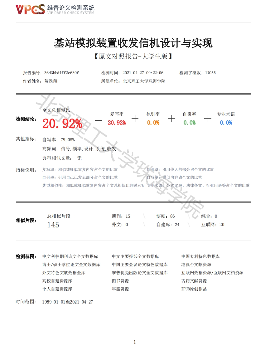 维普论文检测系统VIP PAPER CHECK SYSTEM基站模拟装置收发信机设计与实现【原文对照报告-大学生版】报告编号:36d3bbd4ff2c630f检测时间:2021-04-2709:22:06检测字符数:17055作者姓名:贺逸朗所属单位:北京理工大学珠海学院全文总相似比复写率他引率自引率专业术语检测结论:20.92%20.92%0.0%0.0%0.0%其他指标:自写率:79.08%高频词:信号,频率,设计,系统,收发典型相似文章:无指标说明:复写率:相似或疑似重复内容占全文的比重他引率:用他人的部分占全文的比重自引率:引用自己已发表部分占全文的比重自写率:原创内容占全文的比重典型相似性:相似或疑似重复内容占全文总相似比超过30%专业术语:公式定理、法律条文、行业用语等占全文的比重总相似片段期刊:15博硕:86综合:0相似片段:145外文:0自建库:24互联网:20检测范围:中文科技期刊论文全文数据库中文主要报纸全文数据库中国专利特色数据库博士/硕士学位论文全文数据库中国主要会议论文特色数据库港澳台文献资源外文特色文献数据全库维普优先出版论文全文数据库互联网数据资源/互联网文档资源高校自建资源库图书资源古籍文献资源个人自建资源库年鉴资源IPUB原创作品时间范围:1989-01-01至2021-04-27维普论文检测系统VIP PAPER CHECK SYSTEM原文对照颜色标注说明:■自写片段■复写片段(相似或疑似重复)口引用片段(引用)■专业术语(公式定理、法律条文、行业用语等)基站模拟装置收发信机设计与实现信息学院学院:专业:通信工程姓名:指导老师:贺逸朗张连波学珠海70108102213学号:职称:中国·珠海二O二一年五月诚信承诺书本人郑重承诺:我所呈交的毕业论文《基站模拟装置收发信机设计与实现》是在指导教师的指导下,独立开展研究取得的成果,文中引用他人的观点和材料,均在文后按顺序列出其参考文献,论文使用的数据真实可靠。本人签名:日期:年月日基站模拟装置收发信机设计与实现摘要现代移动通信20世纪20年代发展至今,给我国社会经济和人民的生活带来了翻天覆地的变化,发展之初,人们对移动终端完全没有概念,且不敢想象,90年代初,移动电话“大哥大”成为了贵族的象征,2G系统GSM的到来,解决了人们无线通话的需求,随后,简单的日常通话功能已经无法满足人们的需求,3G运用CDMA技术则给人们带来更高的网络速率和用户上网体验,4G伴随0FDM技术的到来,大大提升了网络的带宽,人们可以随时随地使用网络,包括玩网游,视频通话,刷短视频,看在线直播等,丰富了人与人之间社交生活,随着时代的推进,科技的发展,5G的到来,高速率和低时延的特性即将给我们带来了更加广泛的应用领域,这不仅会给社会再次带来一次革命性的蜕变,也能在掌握新技术与其他国家的竞争中,体现出我国的科技软实力和在世界上的地位和影响力。实现以上的这些,离不开信号的传输,信号的传输离不开基站的建设,本文结合本人大学四年所学通信知识,通过对基站模拟装置收发信机的设计与实现,了解基站的工作原理,TH7122芯片的ASK调制过程,无线收发信机如何工作,如何更好的提升无线通信质量,从实践中提升自我通信知识,理论的实践能力,自我编程能力,工作意识以及形成秉持科学研究客观性与严谨性的态度,提高个人的科学素养。关键词:TH71221芯片ASK调制无线收发信机2维普论文检测系统VIP PAPER CHECK SYSTEMDesign and Implementation of Transceiver for Base Station Simulation DeviceAbstractThe development of modern mobile communications from the 1920s to the present has brought earth-shaking changes to our country's social economy and people's lives.At the beginning of itsdevelopment,people had no concept of mobile terminals and they did not dare to imagine.In theearly 1990s,mobile phones were "big brother"."Big"has become a symbol of the wealthy people.Thearrival of the 2G system GSM has solved people's needs for wireless calls.After that,simple dailycall functions can no longer meet people's needs,and the use of CDMA technology in 3G will bringpeople higher network speeds.In addition to the user's online experience,4G with the advent ofOFDM technology has greatly increased the bandwidth of the network.People can use the networkanytime and anywhere,including playing online games,video calls,short videos,watching onlinelive broadcasts,etc.,enriching social interaction among people Life,with the advancing of thetimes,the development of technology,and the arrival of 5G,the characteristics of high speed andlow latency will soon bring us a wider range of applications,which will not only bring anotherrevolutionary transformation to society,It can also reflect our country's technological soft powerand its position and influence in the world in mastering new technologies and competing with othercountries.The realization of the above is inseparable from the transmission of signals,and thetransmission of signals cannot be separated from the construction of base stations.This articlecombines my four years of university communication knowledge,through the design and implementationof the base station analog device transceiver,to understand the work of the base station,theprinciple,the ASK modulation process of the TH71221 chip,how the wireless transceiver works,howto work better,so as to improve my communication knowledge,theoretical practice ability,self-programming ability,work awareness,and formation of scientific research objectivity and rigorAttitude to improve personal scientific literacy.目录1前言11.1研究目标、研究内容和拟解决的关键问题11.2研究基本思路及方法11.3本设计应解决的主要问题22模拟基站收发信机设计22
