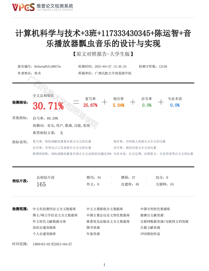 维普论文检测系统VIP PAPER CHECK SYSTEM计算机科学与技术+3班+117333430345+陈运智+音乐播放器瓢虫音乐的设计与实现【原文对照报告-大学生版】报告编号:8e0a4a2631d8873e检测时间:2021-04-2713:45:43检测字符数:12158作者姓名:佚名所属单位:广西民族大学相思湖学院全文总相似此复写率他引率自引率专业术语检测结论:30.71%相思湖25.67%5.04%0.0%0.0%其他指标:自写率:69.29%典型相似文章:无指标说明:复写率:相似或疑似重复内容占全文的比重他引率:引用他人的部分占全文的比重自引率:引用自己已发表部分占全文的比重自写率:原创内容占全文的比重典型相似性:相似或疑似重复内容占全文总相似比超过30%专业术语:公式定理、法律条文、行业用语等占全文的比重总相似片段期刊:34博硕:37综合:0相似片段:165外文:0自建库:49互联网:45检测范围:中文科技期刊论文全文数据库中文主要报纸全文数据库中国专利特色数据库博士/硕士学位论文全文数据库中国主要会议论文特色数据库港澳台文献资源外文特色文献数据全库维普优先出版论文全文数据库互联网数据资源/互联网文档资源高校自建资源库图书资源古籍文献资源个人自建资源库年鉴资源IPUB原创作品时间范围:1989-01-01至2021-04-27维普论文检测系统VIP PAPER CHECK SYSTEM原文对照颜色标注说明:■自写片段■复写片段(相似或疑似重复)口引用片段(引用)■专业术语(公式定理、法律条文、行业用语等)广西民族大学相思湖学院本科毕业论文(设计)族大学相思论文题目:系部:理工学院专业:计算机科学与技术年级班级:2017级3班学号:117333430345学生姓名:陈运智指导老师:黄文钧职称:副教授目录摘要IABSTRACTII1引言12相关技术介绍22.1Java技术22.2 Eclipse开发平台22.3 MySQL数据库22.4SSM框架32.5B/S结构43系统分析53.1可行性分析53.2系统流程分析63.3系统结构分析93.4系统功能分析103.5结构化分析134系统设计154.1系统结构设计154.2系统功能模块设计154.3数据库设计165系统实现262维普论文检测系统VIP PAPER CHECK SYSTEM5.1功能模块的实现266系统测试336.1服务器部署336.2瓢虫音乐网测试33结论38参考文献39致谢40摘要本课题设计一款B/S(Browser/Server)结构跨平台瓢虫音乐播放器,平台的主要目的是为音乐爱好者提供免费音乐服务。采用Java技术、SSM框架、JSP(JavaServer Pages)和YSQL数据库进行开发设计。系统中有三种角色:游客、用户、管理人员。采用较新的BAC模型,具有高安全,容易管理,拓展性强等特点。网站设计中加入了交互动作,保留一些传统经典的操作方式,让网站更简洁,操作上更加简单。经过测试,瓢虫音乐具有界面简洁、操作简单和运行稳定的特点。在论文中,将详细介绍瓢虫音乐平台的设计背景,需求分析、详细设计和实现。关键字:Java;瓢虫音乐;功能:B/SABSTRACTThis subject designs a cross-platform ladybug music player with a B/S (Browser/Server)structure.The main purpose of the platform is to provide music lovers with free music services.Use Java technology,SSM framework,JSP (JavaServer Pages)and MYSQL database for developmentand design.There are three roles in the system:tourists,users,and managers.The newer RBAC modelis adopted,which has the characteristics of high security,easy management,and strongexpandability.Interactive actions have been added to the website design,and some traditional andclassic operation methods have been retained to make the website more concise and easier to operate.After testing,Ladybug Music has the characteristics of simple interface,simple operation andstable operation.In the paper,the design background,demand analysis,detailed design and implementation of theladybug music platform will be introduced in detail.Keywords:Java;ladybug music;function:B/S音乐播放器瓢虫音乐的设计与实现1引言随着文明的发展,音乐成为人们日常娱乐的重要方式之一,拥有大量的用户群体,在我们现代生活中占据重要位置。音乐能陶治个人性情,恰当的音乐能引起我们的不同的情感。因此听音乐也能缓解生活压力,缓解紧张情绪及缓解疼痛等功效。21世纪以来,随着微型个人计算机普及,每个人都能通过个人计算机在互联网娱乐。为此开发了一个网页端的音乐平台,为广大音乐爱好者提供音乐交流的机会。目前国内外,已经有许多功能完善的音乐播放器软件,如国内的QQ音乐,网易云音乐,酷狗音乐等产品。与这些产品先比我定不如他。他们有着很多优点,庞大的用户群,功能强大的评论功能,成熟的社交功能,好看的I界面的特点。因此我只能凭兴趣去模仿他们的功能和效果,不同是用户可以任意上传合法的个人歌曲。免费提供给用户去听。其主要目的是让更多音乐爱好者发表自己的声音。进行音乐的文化交流。2相关技术介绍2.1Java技术Jva是一门面向对象编程语言,不仅吸收了C+语言的各种优点,还摒弃了C++里难以理解的多继承、指针等概念,因此Java语言具有功能强大和简单易用两个特征。Java语言作为静态面向对象编程语言的代表,极好地实现了面向对象理论,允许程序员以优雅的思维方式进行复杂的编程[1]。Jva具有简单性、面向对象、分布式、健壮性、安全性、平台独立与可移植性、多线程、动态性等特点[2]。Jva可以编写桌面应用程序、Wb应用程序、分布式系统和嵌入式系统应用程序等[3]。且热度高,使用人多,拥有3