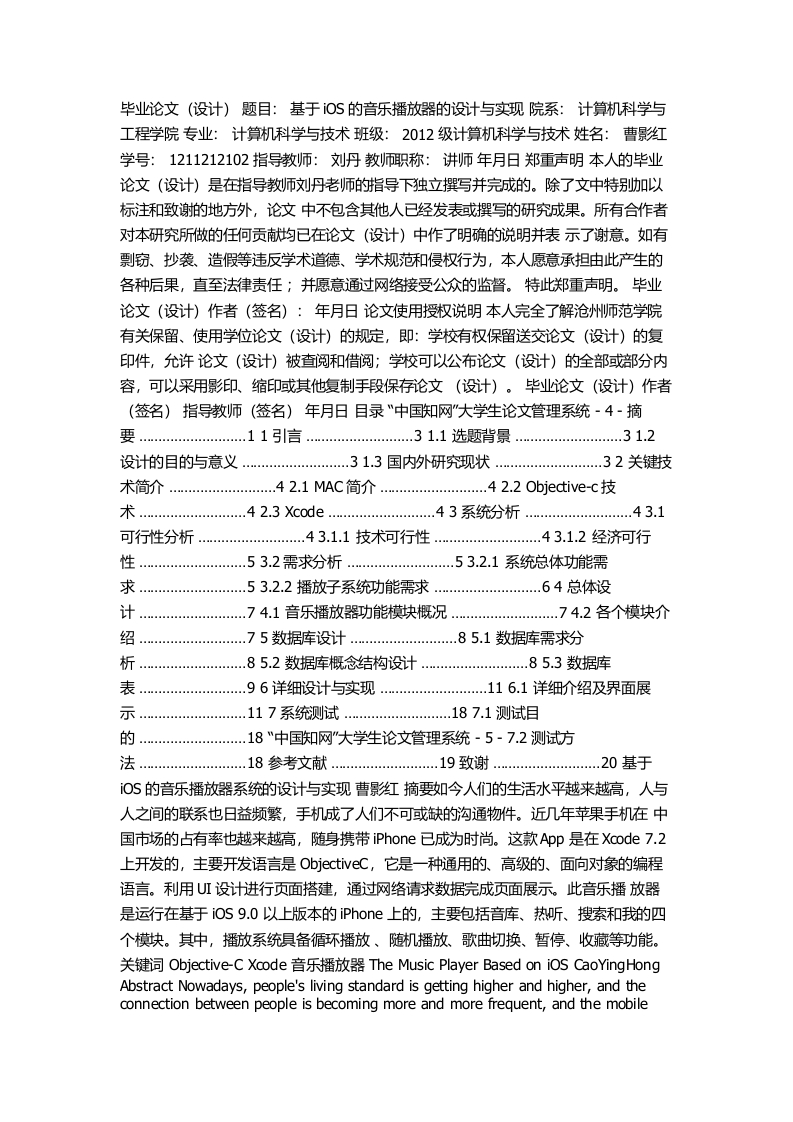 毕业论文(设计)题目:基于OS的音乐播放器的设计与实现院系:计算机科学与工程学院专业:计算机科学与技术班级:2012级计算机科学与技术姓名:曹影红学号:1211212102指导教师:刘丹教师职称:讲师年月日郑重声明本人的毕业论文(设计)是在指导教师刘丹老师的指导下独立撰写并完成的。除了文中特别功加以标注和致谢的地方外,论文中不包含其他人已经发表或撰写的研究成果。所有合作者对本研究所做的任何贡均已在论文(设计)中作了明确的说明并表示了谢意。如有剽窃、抄袭、造假等违反学术道德、学术规范和侵权行为,本人愿意承担由此产生的各种后果,直至法律责任;并愿意通过网络接受公众的监督。特此郑重声明。毕业论文(设计)作者(签名):年月日论文使用授权说明本人完全了解沧州师范学院有关保留、使用学位论文(设计)的规定,即:学校有权保留送交论文(设计)的复印件,允许论文(设计)被查阅和借阅;学校可以公布论文(设计)的全部或部分内容,可以采用影印、缩印或其他复制手段保存论文(设计)。毕业论文(设计)作者(签名)指导教师(签名)年月日目录"中国知网”"大学生论文管理系统-4-摘要11写引言31.1选题背景31.2设计的目的与意义.31.3国内外研究现状…32关键技术简介42.1MAC简介.42.2 Objective-C技术.42.3XC0de43系统分析43.1可行性分析..43.1.1技术可行性.43.1.2经济可行性53.2需求分析.53.2.1系统总体功能需求.53.2.2播放子系统功能需求.64总体设计.74.1音乐播放器功能模块概况…74.2各个模块介绍…75数据库设计.85.1数据库需求分析85.2数据库概念结构设计.85.3数据库表96详细设计与实现116.1详细阶绍及界面展示.117系统额测试187.1测试目的.18"中国知网”大学生论文管理系统-5-7.2测试方法…18参考文献19致谢20基于iOS的音乐播放器系统的设计与实现曹影红摘要如今人们的生活水平越来越高,人与人之间的联系也日益频繁,手机成了人们不可或缺的沟通物件。近几年苹果手机在中国市场的占有率也越来越高,随身携带iPhone已成为时尚。这款App是在Xcode7.2上开发的,主要开发语言是ObjectiveC,它是一种通用的、高级的、面向对象的编程语言。利用UI设计进行页面搭建,通过网络请求数据完成页面展示。此音乐播放器是运行在基于iOS9.0以上版本的iPhone上的,主要包括音库、热听、搜索和我的四个模块。其中,播放系统具备循环播放、随机播放、歌曲切换、暂停、收藏等功能。关键词Objective-C Xcode音乐播放器The Music Player Based on iOS CaoYingHongAbstract Nowadays,people's living standard is getting higher and higher,and theconnection between people is becoming more and more frequent,and the mobilephone becomes an indispensable communication object.In recent years,the shareof Apple's mobile phone in the Chinese market is also getting higher and higher,carry iPhone has become a fashion.The App is developed on Xcode 7.2.The maindevelopment language is Objective-C,which is a general,high-level,object-orientedprogramming language.The use of UI design to build a leaf,through the network tocomplete the page request data show.This music player is running on the iOsversion of the iPhone based on more than 9,mainly including audio library,hotlistening,search and my four modules.Among them,the player system has thefundtion of crculation,random play,song switch,pause,collection and so on.Keywords Objective-C Xcode Music player1引言1.1选题背景如今苹果手机在中国市场占有相当一部分的比重,因此iOS技术也比较流行。Objective-C语言是苹果开发应用的主流语言,OC语言与其他的开发语言相比更灵活,运用更方便,开发更简单。因此系统采用这种技术来开发手机应用。1.2设计的目的与意义听音乐已是人们日常生活中不能缺少的一向娱乐活动,现在市场上的音乐播放器也是多种多样。因为之前学习了一段时间的iOS开发,用这种开发简单快捷,见效快。对于音乐也是特别喜爱想利用所学知识开发一款简单易操作的音乐播放器供自己和朋友们娱乐,所以设计基于iOS系统的相关产品。同时也是希望通过做这次设计来验证iOS开发技术,巩固知识提高开发水平。1.3国内外研究现状在国内,信息科技的发展带动着社会信息化全面的进步,表现尤为突出的行业就是移动互联应用端。在过去的数年当中,我国的移动产业得到了飞速的发展,三大运营商的崛起,就是一个非常明显的社会实力。国内在3G产业的推广中收获了大量的"中国知网”大学生论文管理系统-6-用户支持,而随即而来的,是APP市场的迅速崛起。苹果公司的产品开始进入我们的电子消费圈,在这个领域中,电子音乐播放器是最热门的应用之一。我们常用的音乐播放器应用有QQ音乐、酷狗音乐、百度音乐等主流软件,这些产品包含了绝大多数用户所需求的功能1]。比如,我们可以根据个人的喜好选择歌曲和歌手,可以掌握自己关注歌手的各种专辑信息,能够分享自己喜爱的音乐,甚至还能在共同的音乐圈找到朋友。在国外,音乐媒体的发展趋向于更加的专业化和社会化,苹果公司的APPStore更是抓住了这一点,他们有自己独立的音乐商店Tunes,其中iOS技术开发便是主流,苹果公司的开发语言-Objective-C语言,更是软件开发的主力军。应用这门语言,苹果公司占据了软件开发的多数市场,可以说是取得了巨大的成功。作为音乐主题的开发,国外开发者也是做到了应有尽有,围绕着用户的需求来做,不仅仅只做简单的播放,充分挖掘每个APP应用技术亮点。如今用户的需求已然成