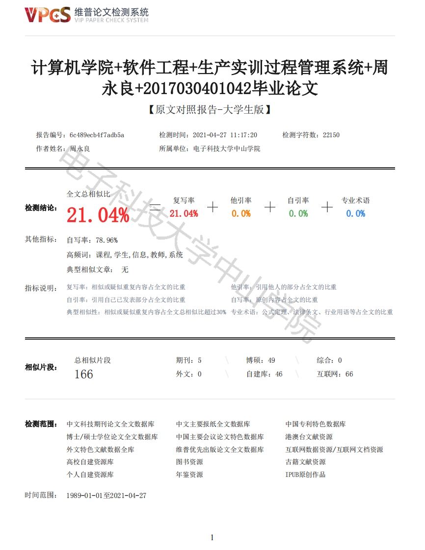 维普论文检测系统VIP PAPER CHECK SYSTEM计算机学院+软件工程+生产实训过程管理系统+周永良+2017030401042毕业论文【原文对照报告-大学生版】报告编号:6c489ecb4f7adb5a检测时间:2021-04-2711:17:20检测字符数:22150作者姓名:周永良所属单位:电子科技大学中山学院全文总相似比复写率他引率自引率专业术语检测结论:21.04%人21.04%0.0%0.0%0.0%其他指标:自写率:78.96%高频词:课程,学生,信息,教师,系统典型相似文章:无学中指标说明:复写率:相似或疑似重复内容占全文的比重引率:引用他人的部分占全文的比重自引率:引用自己已发表部分占全文的比重自写率:原创内容占全文的比重典型相似性:相似或疑似重复内容占全文总相似比超过30%专业术语:公式定理、法律涤文、行业用语等占全文的比重总相似片段期刊:5博硕:49综合:0相似片段:166外文:0自建库:46互联网:66检测范围:中文科技期刊论文全文数据库中文主要报纸全文数据库中国专利特色数据库博士/硕士学位论文全文数据库中国主要会议论文特色数据库港澳台文献资源外文特色文献数据全库维普优先出版论文全文数据库互联网数据资源/互联网文档资源高校自建资源库图书资源古籍文献资源个人自建资源库年鉴资源IPUB原创作品时间范围:1989-01-01至2021-04-27维普论文检测系统VIP PAPER CHECK SYSTEM原文对照颜色标注说明:■自写片段■复写片段(相似或疑似重复)口引用片段(引用)■专业术语(公式定理、法律条文、行业用语等)毕业设计(论文)生产实训过程管理系统教学单位:计算机学院专业名称:软件工程专业学号:2017030401042学生姓名:周永良中山学院指导教师:何怀文(副教授)指导单位:计算机学院完成时间:2021年5月16日电子科技大学中山学院教务处制发生产实训过程管理系统摘要随着时代的变迁,生产实训是现大学教学工作的一个重要的组成部分且较为体现学生的操作能力。目前大数的大学的生产实训管理方面,还是停留在利用OD操作文件来实现管理,没有能够很好的定期进行对学生的生产实训相关情况的了解。而对于学生在实训时的动态信息无法实现及时跟踪调查,例如指导教师与学生的讨论和关于项目的沟通等。另外,学生在生产实训的管理方面无时间与评分等手段对学生进行评价和审核,一旦出现问题双方的责任不明确,无据可查,造成一系列不方便的学习。本项目基于Vue和Spring Boot技术,采用前后端分离,开发了一套生产实训过程管理系统。本项目使用了Spring security来管理项目的身份和权限,在数据存储方面,选择了MySQL数据库作为数据存储载体,Navicat作为管理工具。本系统中的管理员身份可查看所有关于教师信息,学生信息,课程信息。学生身份可根据教师已添加的课程进行加入,学习,讨论,管理个人信息等。教师可通过加入的学生就行管理,发布任务,评分,查看成绩,导出,管理个人关系等功能。本系统整合了教师信息,学生信息,和对学生的实训管理,任务评分,任务审核。根据本系统所涉及到的身份进行了详细的功能模块分析,系统中各个功能模块满足大学生和教师更好的交流需求。关键词:生产实训;Spring Boot:用户;学生;教师:2维普论文检测系统VIP PAPER CHECK SYSTEMProduction Training Process Management SystemAbstractWith the change of the times,production training is an important part of the teaching work inuniversities and reflects the students'operational ability.At present,the production trainingmanagement of large number of universities still stays in the use of word operating documents toachieve management,and it is not able to get a good understanding of the production trainingrelated situation of students regularly.However,the dynamic information of students in practicecan not be tracked and investigated in time,such as the discussion between teachers and studentsand communication about projects.In addition,students have no time and scoring methods to evaluateand review the management of production training.Once problems arise,the responsibilities of bothparties are unclear and there is no evidence to be checked,which leads to a series of inconvenientlearning.Based on Vue and spring boot technology,this project develops a set of production and trainingprocess management system by separating the front end from the back end.This project uses springsecurity to manage the identity and permissions of the project,and MySQL and Navicat to manage thedatabase.The administrator in this system can view all the information about teachers,students andcourses.Students can join,study,discuss and manage personal information according to the coursesadded by teachers.Teachers can manage,publish tasks,score,view grades,export and managepersonal relationships through the added students.This system can make teachers and studentscommunicate better.The system integrates the teacher information,student information,and trainingmanagement of students,task score,task audit.According to the identity of the system involved ina detailed functional module analysis,each functional module in the system to meet the needs ofcollege students and teachers better communication.Key Words:Production training;Spring Boot;Users;Students;Teacher目录第1章绪论11.1课题背景11.2目的意义11.3论文主要工作1第2章技术背景3学院2.2Vue32.3MySQL4第3章系统分析53.1功能需求分析53.1.1管理员模块53.1.2教师模块63.1.3学生模块63.2总体设计73.2.1总体系统结构73.2.2API前端接口设计83.3概要设计93.4数据库设计133.4.1系统的总表133.4.2系统的ER图143.4.3系统各数据库表结构14第4章系统实现193
