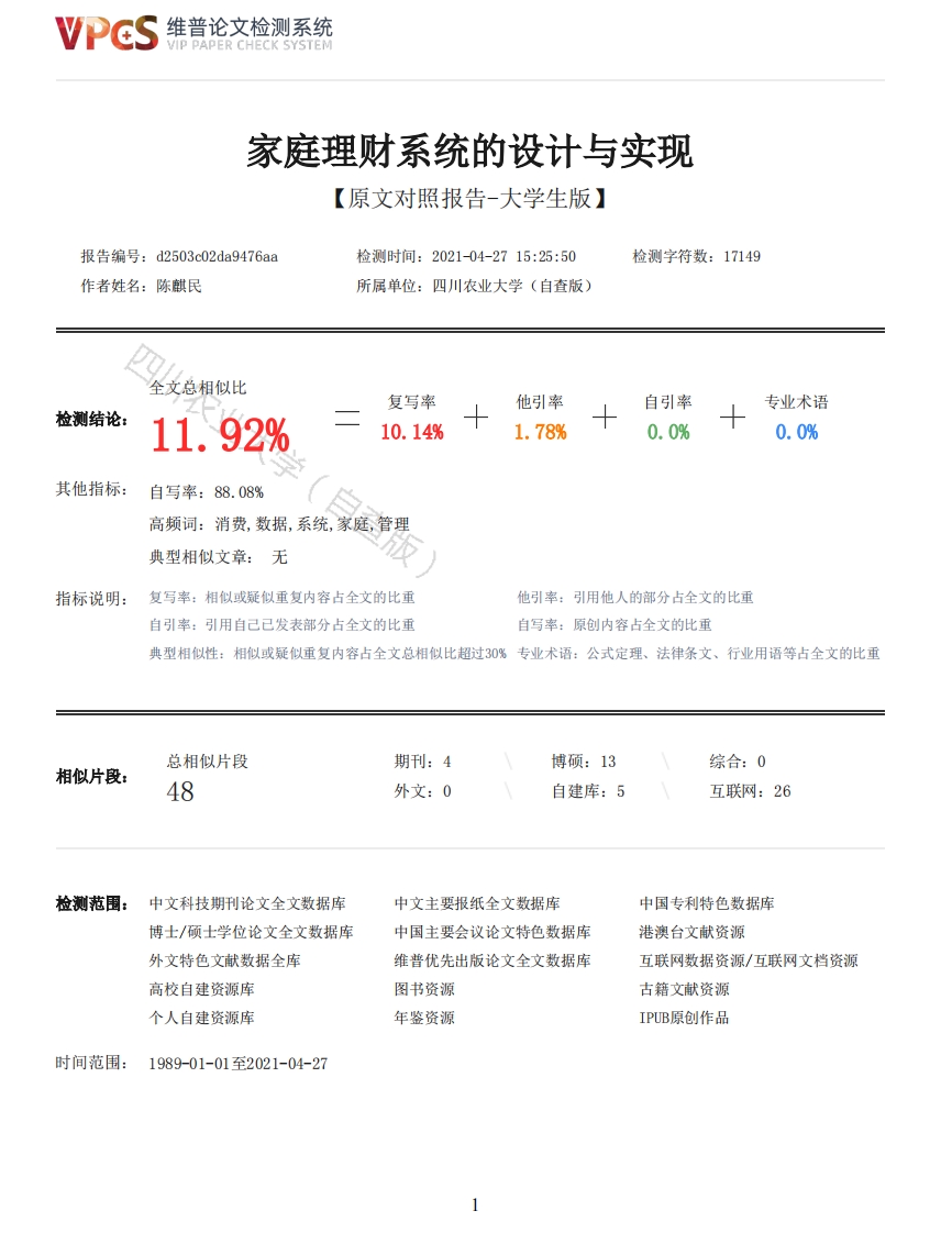 维普论文检测系统/IP PAPER CHECK SYSTEM家庭理财系统的设计与实现【原文对照报告-大学生版】报告编号:d2503c02da9476aa检测时间:2021-04-2715:25:50检测字符数:17149作者姓名:陈麒民所属单位:四川农业大学(自查版)全文总相似比复写率他引率自引率专业术语检测结论:11.92%10.14%1.78%0.0%0.0%其他指标:自写率:88.08%高频词:消费,数据,系统,家庭,管理典型相似文章:无指标说明:复写率:相似或疑似重复内容占全文的比重他引率:引用他人的部分占全文的比重自引率:引用自己已发表部分占全文的比重自写率:原创内容占全文的比重典型相似性:相似或疑似重复内容占全文总相似比超过30%专业术语:公式定理、法律条文、行业用语等占全文的比重总相似片段期刊:4博硕:13综合:0相似片段:48外文:0自建库:5互联网:26检测范围:中文科技期刊论文全文数据库中文主要报纸全文数据库中国专利特色数据库博士/硕士学位论文全文数据库中国主要会议论文特色数据库港澳台文献资源外文特色文献数据全库维普优先出版论文全文数据库互联网数据资源/互联网文档资源高校自建资源库图书资源古籍文献资源个人自建资源库年鉴资源IPUB原创作品时间范围:1989-01-01至2021-04-27维普论文检测系统VIP PAPER CHECK SYSTEM原文对照颜色标注说明:■自写片段■复写片段(相似或疑似重复)口引用片段(引用)■专业术语(公式定理、法律条文、行业用语等)四川农业大学农业大学本科毕业论文(设计)(2021届)家庭理财系统的设计与实现题目:学院:信息工程学院专业:计算机科学与技术(教育)学生姓名:陈麒民学号:201703771导师:潘勇浩职称:副教授完成日期:2021年04月23日目录1绪论21.1开发背景21.2设计目的21.3技术栈21.3.1后端技术31.3.2前端技术31.4开发工具简介42系统设计42.1技术架构图42.2开发规范52.3系统总体设计52.4系统操作流程62.5数据库设计72.5.1E-R模型72.5.2数据字典72.6系统功能图93系统功能的设计与实现93.1系统登录93.1.1界面设计92维普论文检测系统VIP PAPER CHECK SYSTEM3.1.2界面逻辑113.1.3图片验证码123.1.4登录数据获取133.1.5登录数据校验143.1.6登录主界面143.2家庭收入管理153.2.1收入列表163.2.2添加收入163.2.3编辑收入173.2.4删除收入183.3消费上限设置183.3.1消费限额数据展示193.3.2添加消费限额193.3.3编辑消费限额203.3.4删除消费限额213.4家庭消费管理223.4.1成员消费展示223.4.2添加成员消费223.4.3编辑成员消费233.4.4删除成员消费243.5消费汇总统计25业大学(自查版)3.5.1SQL高级检索技术263.5.2消费报表统计图263.6管理员管理283.6.1管理员列表数据展示283.6.2禁用管理员294结论30参考文献30致谢32家庭理财系统的设计与实现计算机科学与技术(教育)陈麒民导师:潘勇浩摘要:当今社会对经济效益的重视度不断提升,理财观念深入人心。特别是在家庭理财方面,越来越多的人开始关注家庭总收入和总支出的详细情况,但传统线下家庭记账模式不仅缺少快速简便的汇总统计功能,还有不易长久保存、记录繁琐等诸多弊端,因此搭建家庭理财系统具有一定意义。系统以Java Web为核心技术,为用户提供个人资料管理、家庭成员管理、家庭收入管理、家庭消费管理、消费统计管理和家庭财务分析功能。以直观的数据、图表为用户的消费决策提供必要的参考数据。关键词:家庭财务管理;Java Web;MySQL;AjaxDesign and implementation of family financial management systemComputer Science and Technology(education)CHEN Qi-minSupervisor:PAN Yong-haoAbstract:Today's society attaches more and more importance to economic efficiency,and theconcept of financial management is deeply rooted in people's hearts.Especially in family finance,more and more people are concerned about the details of total family income and expenses,but thetraditional offline family bookkeeping mode not only lacks quick and easy summary statistics,butalso has many drawbacks such as not easy to keep for a long time and cumbersome records,so it ismeaningful to build a family finance system.This system uses Java Web as the core technology to3