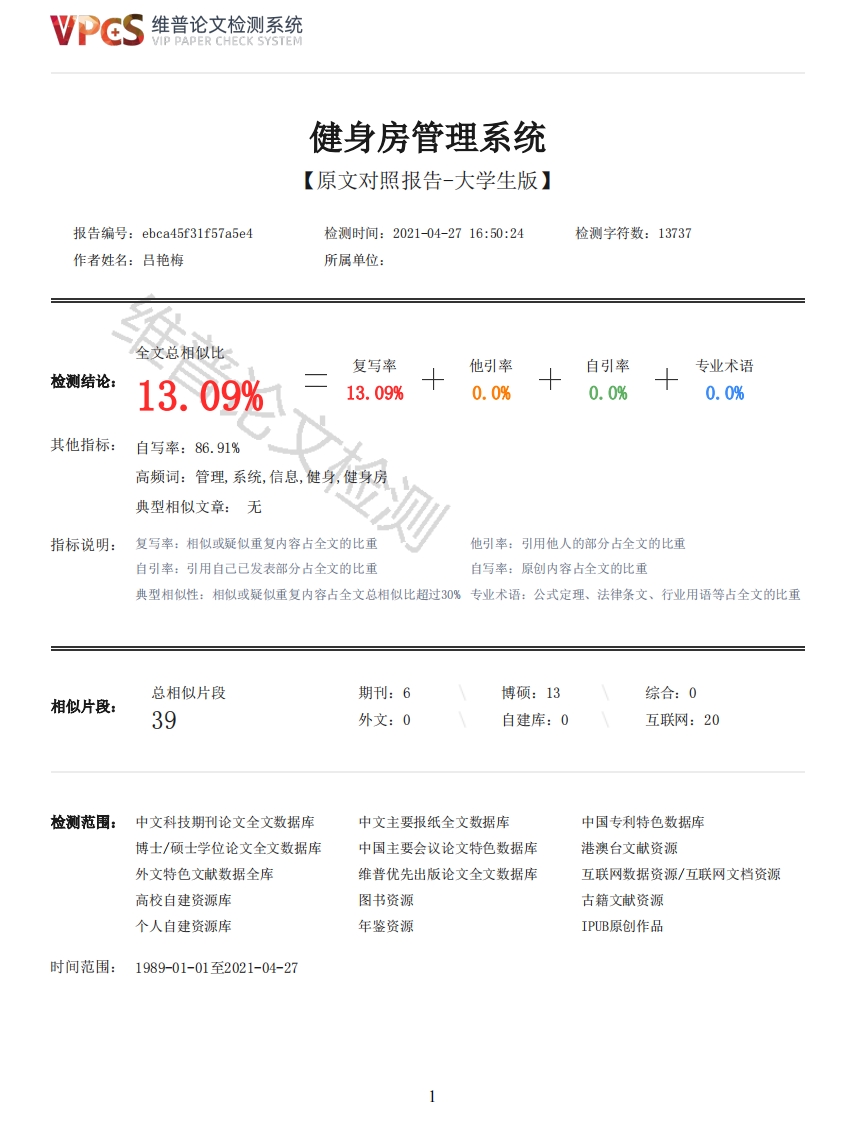 维普论文检测系统VIP PAPER CHECK SYSTEM健身房管理系统【原文对照报告-大学生版】报告编号:ebca45f31f57a5e4检测时间:2021-04-2716:50:24检测字符数:13737作者姓名:吕艳梅所属单位:全文总相似比复写率他引率自引率专业术语检测结论:13.09%13.09%0.0%0.0%0.0%其他指标:自写率:86.91%高频词:管理,系统,信息,健身,健身房典型相似文章:无指标说明:复写率:相似或疑似重复内容占全文的比重他引率:引用他人的部分占全文的比重自引率:引用自己已发表部分占全文的比重自写率:原创内容占全文的比重典型相似性:相似或疑似重复内容占全文总相似比超过30%专业术语:公式定理、法律条文、行业用语等占全文的比重总相似片段期刊:6博硕:13综合:0相似片段:39外文:0自建库:0互联网:20检测范围:中文科技期刊论文全文数据库中文主要报纸全文数据库中国专利特色数据库博士/硕士学位论文全文数据库中国主要会议论文特色数据库港澳台文献资源外文特色文献数据全库维普优先出版论文全文数据库互联网数据资源/互联网文档资源高校自建资源库图书资源古籍文献资源个人自建资源库年鉴资源IPUB原创作品时间范围:1989-01-01至2021-04-27维普论文检测系统VIP PAPER CHECK SYSTEM原文对照颜色标注说明:■自写片段■复写片段(相似或疑似重复)引用片段(引用)■专业术语(公式定理、法律条文、行业用语等)江西科技师范大学理工学院毕业设计(论文)题目(中文):健身房管理系统(外文):Gym Management System学科部:理工学科部专业:计算机科学与技术学生姓名:吕艳梅检测学号:20170594指导教师:罗丽2021年月日目录1.绪论21.1引言21.2开发背景22.开发工具简介32.1JAVA简介32.2JDK8简介32.3 Eclipse简介32.4 Tomcat7简介32.5 MySQL数据库简介33.系统分析43.1可行性分析43.1.1技术可行性43.1.2经济可行性43.1.3运行可行性43.2需求分析53.2.1功能需求53.2.2性能需求54.系统设计64.1系统设计思想64.2系统结构框架64.3系统模块设计62维普论文检测系统VIP PAPER CHECK SYSTEM4.4数据库设计104.4.1数据库概念结构设计104.4.2数据库逻辑结构设计154.4.3数据库物理结构设计155.系统实现195.1登录界面195.2其他操作页面215.2.2员工管理页面235.2.3商品库存管理页面235.2.4系统管理页面246.系统测试256.1概述256.1.1测试方法256.2环境测试256.3页面测试256.4功能测试277.总结与展望28参考文献29健身房管理系统的应用摘要:随着全民健康意识的提升,健身越来越受大家的欢迎,随之健身房这一词汇也广泛流行起来,大家对健身房有着强烈的热爱,是人们生活中的重要一部分。在当今社会经济形势下,健身房的管理必须和计算机的飞速发展相匹配,要充分结合现代科学和技术进行发展。无论是商家还是用户,建立健身房管理系统都会为他们带来很多好处。对于商家来说,通过信息化可以让管理变得更加方便快捷,还可以准确的掌握诸多用户的信息,实现盈利化。从用户的角度来说,不仅保障了自身信息的安全性,还为健身的体验大大提高了效率。这次的管理系统我使用了Eclipse作为开发工具,服务器配置Tomcat,采用MySQL数据库,Java语言作为后台开发语言,它方便管理人员对用户员工等进行查询、添加、别除等操作,还可以及时发现问题并作出整改,真正的实现了低成本、高效率。我国健身事业正在不断推进,我相信,在此基础上本项目不仅仅是对单个健身房产业的意义,这可能促进健身房事业的发展。关键词:健身房:管理:系统:安全性:Eclipse:Tomcat:My SQL数据库:Java语言1.绪论1.1引言随着我国信息技术的发展,计算机技术的应用范畴也越来越多。计算机技术为我们提供生活中的便利,同时,还可以推动我国经济发展。计算机技术的不断发展,不仅推动了我国整个社会的信息化发展进程,同时还使人们的日常生活、工作方式,甚至是学习方式都有改善。在计算机技术飞速发展的大背景下,信息化会推动人类社会的发展。随着现在社会经济稳步提升,人们运动健身的意识也随着生活水平的质量得到提升,体有健身房随之应运而生。但是健身房经营水平也因为我国健身房发展时间短而参差不齐,以至于管理系统也并不是很完善。所以为健身房设计一个界面友好、操作简单、信息处理能力优秀的管理系统让他们能有更好的处理管理方式成为了我的选择方向。1.2开发背景现在国外有很多国家经济非常发达,已经步入发展社会,生活质量的提高,让越来越多的人开始关注自身的健康问题。与此同时,对各种健身活动也产生了兴趣。这也是国外体育发展比较早的原因。因此,健身房管理系统的开发比较早,技术相对来说也比较成熟。然而在国内,虽然经过改革发展,人民生活水平得到了比较大的提高,但是我国与国外发达国家仍存在一些差距。体育产业在过去20年左右才开始腾飞。还有就是计算机的普及相对较晚,因此健身房管理系统的开发相对较晚。它虽然没有像国外那样成熟的技术。但我国体育产业的发展还比较迅速。随着经济的发展,健身房管理系统的开发技术也在逐步发展。从目前的情形下,我发现开发一个有效的管理系统,一方面可以方便管理员对注册用户的管理,还可以对员工3