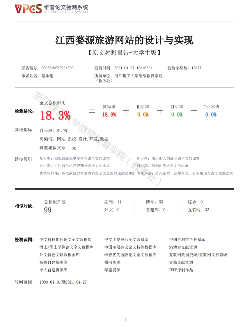 维普论文检测系统VIP PAPER CHECK SYSTEM江西婺源旅游网站的设计与实现【原文对照报告-大学生版】报告编号:58936460b295e503检测时间:2021-04-2716:46:54检测字符数:12537作者姓名:蔡永港所属单位:浙江理工大学继续教育学院(教务处)全文总相似比复写率他引率自引率专业术语检测结论:18.3%18.3%0.0%0.0%0.0%其他指标:自写率:81.7%高频词:网站,系统,设计,开发,数据典型相似文章:无指标说明:复写率:相似或疑似重复内容占全文的比学院他引率:引用他人的部分占全文的比重自引率:引用自己已发表部分占全文的比重自写率:原创内容占全文的比重典型相似性:相似或疑似重复内容占全文总相似比超过30%专业术语:公式定理、法律条文、行业用语等占全文的比重总相似片段期刊:11博硕:55综合:0相似片段:99外文:0自建库:0互联网:33检测范围:中文科技期刊论文全文数据库中文主要报纸全文数据库中国专利特色数据库博士/硕士学位论文全文数据库中国主要会议论文特色数据库港澳台文献资源外文特色文献数据全库维普优先出版论文全文数据库互联网数据资源/互联网文档资源高校自建资源库图书资源古籍文献资源个人自建资源库年鉴资源IPUB原创作品时间范围:1989-01-01至2021-04-27维普论文检测系统VIP PAPER CHECK SYSTEM原文对照颜色标注说明:■自写片段■复写片段(相似或疑似重复)口引用片段(引用)■专业术语(公式定理、法律条文、行业用语等)浙江理工大学成人高等教育毕业设计(论文)人(毕业论文封面、封底由继续教育学院统一制作)论文题目江西婺源旅游网站的设计与实专业学院信息电子学院专业班级19函授计算机专升本(2)班姓名蔡永港指导老师苏志军2020年12月21日成人高等教育毕业设计(论文)诚信承诺书教育学院(教务妙学生姓名蔡永港学号1941914281学习形式函授专业计算机科学与技术指导老师苏志军题目江西婺源旅游网站的设计与实现诚信承诺本人慎重承诺和声明:1、本人在毕业设计(论文)撰写过程中严格遵守有关规定,恪守学术规范,所呈交的毕业设计(论文)是在指导教师的指导下独立完成:2、毕业设计(论文)所使用的相关资料、数据、观点等均真实可靠,文中所有引用的他人观点、材料、数据、图表均已注释说明来源:3、毕业设计(论文)中无抄袭、剽窃或不正当引用他人学术观点、思想和学术成果,伪造、篡改数据的情4、本人已被告知并清楚:学校对毕业设计(论文)中的抄袭、剽窃、弄虚作假等违反学术规范的行为将严肃处理,并可能导致毕业设计(论文)成绩不合格,无法正常毕业、取消学士学位资格或注销并追回已发放的毕业证书、学士学位证书等严重后果:5、若在学校组织的毕业设计(论文)检查、评比中,被发现有抄袭、剽窃、弄虚作假等违反学术规范的行为,本人愿意接受学院按有关规定给予的处理,并承担相应责任。学生(签名):蔡永港2020年12月21日2维普论文检测系统VIP PAPER CHECK SYSTEM摘要本设计是为江西婺源当地的旅游开发的一个综合性网站。网站的页面采用Bootstrap框架,搭配Html5CSS3+JavaScript技术来完成开发。网站前后瑞分离,并使用ThinkPHP5.0框架和PHP语言以及My SQL数据库来完成数据的交互,主要完成对旅游网站的管理和网站的展示与应用。前端网站主要功能模块有:网站首页模块、网站关于模块、网站美食模块、网站美景模块、四大景区模块、交友聊天模块。后台管理系统主要功能有:管理员管理、用户管理、留言管理、图片管理。本系统能够面向游客宣传当地的旅游信息,帮助外地游客能够深入的了解当地的旅游特色,相比普通的旅游网站设计,本系统具有较强的针对性,便于对江西婺源地区旅游的需求进行展示。关键词:动态网站:HTM5;MySQL数据库:ThinkPHP5.0AbstractThis design is a comprehensive website for local tourism development in Wuyuan,Jiangxi.Thepage of the website uses Bootstrap framework,collocation Html5CSS3JavaScript technology to completethe development.The front and back of the website are separated,and the ThinkPHP5.0 framework,PHPlanguage and MySQL database are used to complete the data interaction,mainly to complete themanagement of the tourism website and the display and application of the website.The main functionmodules of the front-end website are:the home page module of the website,the website about themodule,the website food module,the website beauty module,the four major scenic spots module,thefriend chat module.The main functions of the background management system are:administratormanagement,user management,message management,picture management.The tourism website can show local tourism information,so that people can easily and quicklyunderstand the local characteristics of this area and this area,compared with the general tourismwebsite,the site is more targeted,More can meet the needs of tourism in Wuyuan,Jiangxi Province.Keywords:dynamic website:HTML5:MySQL database:ThinkPHP5.0目录摘要务处Abstract一、绪论1(一)旅游业信息化的发展1(二)旅游类型网站的现状1(三)旅游网站的构建1二、开发环境综述2(一)XAMPP简介2l、Apache22、标题3(二)ThinkPHP简介4(三)Navicat for MySQL简介5三、网站需求分析与整体设计6(一)可行性研究6(二)系统需求分析61、系统功能需求62、数据库需求6(三)网站系统的总目标7(四)网站数据库设计7四、网站详细设计与实现10(一)网站整体界面设计与实现10(二)网站首页模块设计103