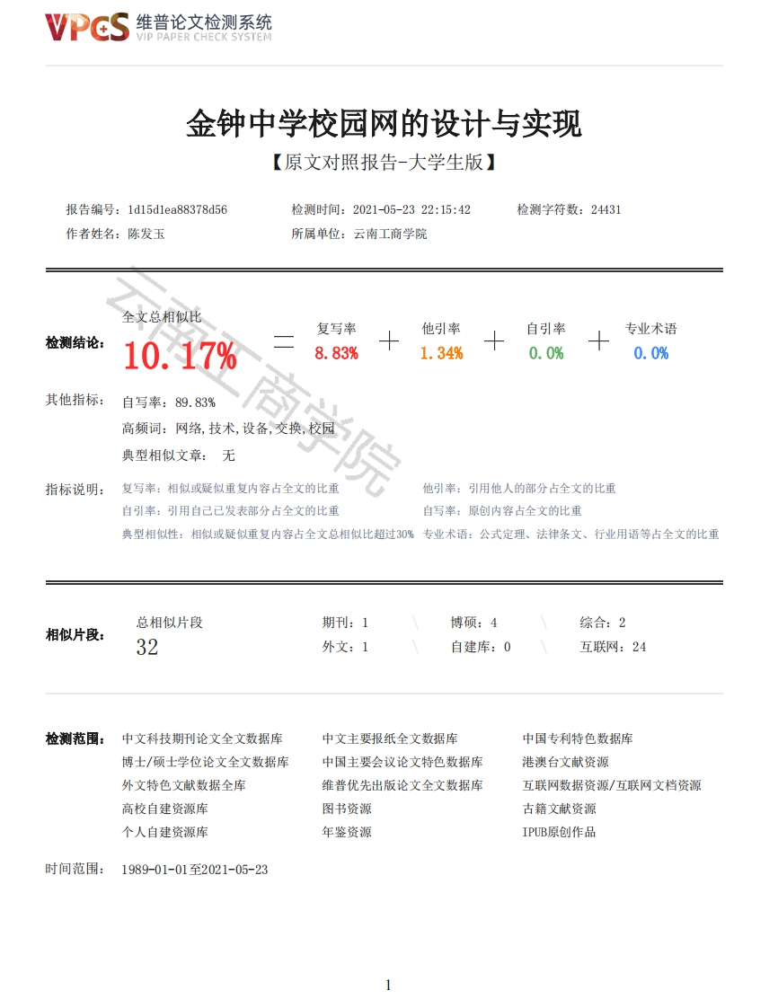 维普论文检测系统VIP PAPER CHECK SYSTEM金钟中学校园网的设计与实现【原文对照报告-大学生版】报告编号:1d15d1ea88378d56检测时间:2021-05-2322:15:42检测字符数:24431作者姓名:陈发玉所属单位:云南工商学院全文总相似比复写率他引率自引率专业术语检测结论:10.17%8.83%1.34%0.0%0.0%其他指标:自写率:89.83%高频词:网络,技术,设备,交换,校园典型相似文章:无指标说明:复写率:相似或疑似重复内容占全文的比重他引率:引用他人的部分占全文的比重自引率:引用自己已发表部分占全文的比重自写率:原创内容占全文的比重典型相似性:相似或疑似重复内容占全文总相似比超过30%专业术语:公式定理、法律条文、行业用语等占全文的比重总相似片段期刊:1博硕:4综合:2相似片段:32外文:1自建库:0互联网:24检测范围:中文科技期刊论文全文数据库中文主要报纸全文数据库中国专利特色数据库博士/硕士学位论文全文数据库中国主要会议论文特色数据库港澳台文献资源外文特色文献数据全库维普优先出版论文全文数据库互联网数据资源/互联网文档资源高校自建资源库图书资源古籍文献资源个人自建资源库年鉴资源IPUB原创作品时间范围:1989-01-01至2021-05-23维普论文检测系统VIP PAPER CHECK SYSTEM原文对照颜色标注说明:■自写片段■复写片段(相似或疑似重复)口引用片段(引用)■专业术语(公式定理、法律条文、行业用语等)毕业设计金钟中学校园网的设计与实现DESIGN AND IMPLEMENTATION OF CAMPUS NETWORK IN JINZHONG MIDDLE SCHOOL摘要随着时代潮流的发展全球进入信息化时代,校园网作为当代教育的一项基础设施,是提高教学,管理水平不可或缺的因素,也是对学校的教学质量、管理水平进行评判的一个重要标志。在金钟中学校园网的设计与实现中,以满足学校网络需求为目标,为学校搭建一套完整的网络。在设计学校网络方案的时候,以主流的网络技术为基础,在保证方案可行的情况下同时保障网络的前瞻性:网络出口使用以太网技术的同时增加一台防火墙,用来把内外网隔离,保护纵向的安全:校园网采用三层网络架构的方式(接入层、汇聚层与核心层)。同时整个网络把无线网络和有线网络融合。在满足日常办公的情况下,还能满足先进的教育方式。关键词:网络需求;网络设计;网络技术ABSTRACTWith the development of the trend of the times,the world has entered the information age.As aninfrastructure of contemporary education,campus network is an indispensable factor to improve theteaching and management level,and also an important symbol to evaluate the teaching quality andmanagement level of the school.In the design and implementation of campus network of Jinzhong middle school,the goal is tomeet the needs of the school network and build a complete network for the school.In the design ofthe school network scheme,the mainstream network technology is taken as the basis to ensure thefeasibility of the scheme and the foresight of the network;When Ethernet technology is used in thenetwork exit,a firewall is added to isolate the internal and external network and protect thevertical security:Campus network adopts three-layer network architecture (access layer,convergencelayer and core layer).At the same time,the whole network integrates wireless network and wirednetwork.In the case of meeting the daily office,but also to meet the advanced way of education.Key words:network demand network design:network technique目录1绪论12需求分析22.1金钟中学简介22.2网络安全需求32.3软硬件需求32.4访问需求32维普论文检测系统VIP PAPER CHECK SYSTEM2.5联通性需求33相关技术53.1vlan技术53.2静态路由63.3DHCP技术63.4ACL技术63.5SSID技术63.6NAT技术74总体网络设计方案84.1设计原则84.2网络拓扑设计94.3设备选型94.3.1路由器94.3.2核心交换机104.3.3汇聚交换机104.3.4接入交换机104.3.5防火墙105网络规划与实现125.1网络地址规划125.2设备端口类型规划125.3网络设计实现155.3.1LAN创建和VLANID名称设置15商学院5.3.2DHCP技术和trunk口配置155.3.3静态路由155.3.4ACL165.3.5AC与SSID165.3.6AT165.3.7安全策略配置166测试配置186.1VLAN创建和VLANID名称设置测试结果186.2DHCP服务仿真结果196.3ACL访问控制测试结果216.4SSID测试结果236.6NTA仿直结果256.5外网连接测试25总结28参考文献29致谢30附录311绪论随着国家信息化工作的深化对于提高教育系统信息化水平的要求也越来越高,使之成为当前工作的中心,校园网络的建立是信息化的关键,特别是在校园网络的发展方面,信息技术的发展主要反映在以下领域:1、老师和学生们的信息技术水平可以通过校园网得到提升:学校要为师生提供一个与校园网结合的环境来应对信息技术的更新换代。2、校园网可以为老师授课提供更多的教学资源和工具,在未来校园网必将成为提高学生综合素质不可或缺的工具,让教育改革成为必然。3、校园网建设是未来学校建设的基础,现代化校园必须要建立完善的信息化模块。3