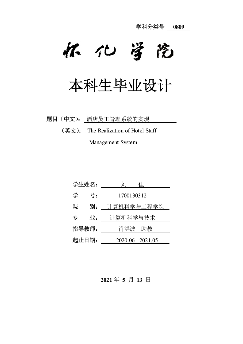 学科分类号0809本科生毕业设计题目(中文):酒店员工管理系统的实现(英文):The Realization of Hotel StaffManagement System学生姓名:刘佳学号:1700130312院计算机科学与工程学院专业:计算机科学与技术指导教师:肖洪波助教起止日期:2020.06-2021.052021年5月13日怀化学院本科毕业设计诚信声明作者郑重声明:所呈交的本科毕业设计,是在指导老师的指导下,独立进行研究所取得的成果,成果不存在知识产权争议。除文中已经注明引用的内容外,设计不含任何其他个人或集体已经发表或撰写过的成果。对设计的研究做出重要贡献的个人和集体均已在文中以明确的方式标明。本声明的法律结果由作者承担。本科毕业设计作者签名:年月日目录摘关键词…........Abstract.Key words.......1.1课题背景及意义1.2国内外研究现状1.3本课题主要工作..22系统开发环境2.1SSM简介2.3 MYSQL数据库2.4HTML简介2.5B/S结构.3系统分析3.1可行性分析…3.1.1技术可行性.3.1.2操作可行性3.1.3经济可行性.63.1.4法律可行性.…3.2系统流程分析3.2.1系统开发流程….73.2.2用户登录流程3.2.3系统操作流程.3.2.4添加信息流程.93.2.5修改信息流程.103.2.6删除信息流程113.3系统用例分析…3.3.1管理员用例图113.3.2普通管理员用例图12