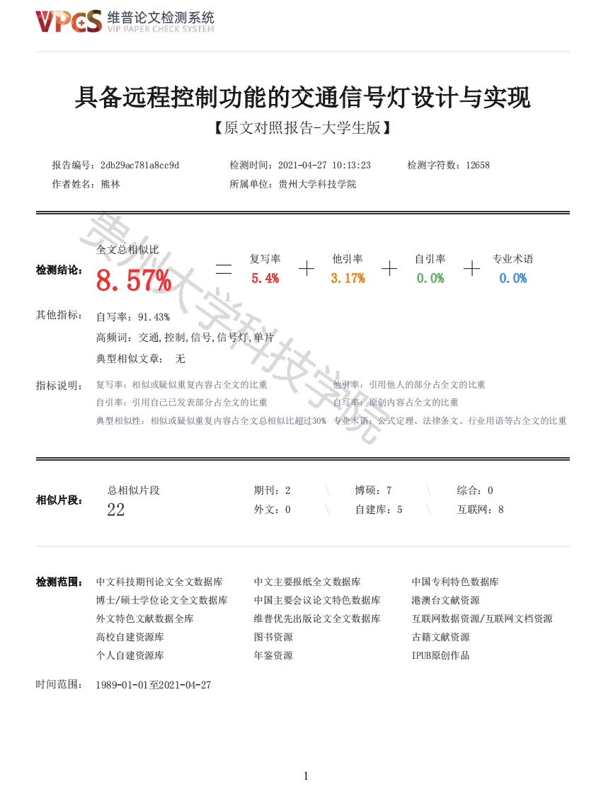 维普论文检测系统VIP PAPER CHECK SYSTEM具备远程控制功能的交通信号灯设计与实现【原文对照报告-大学生版】报告编号:2dl29ac781a8cc9d检测时间:2021-04-2710:13:23检测字符数:12658作者姓名:熊林所属单位:贵州大学科技学院全文总相似比复写率他引率自引率专业术语检测结论:8.57%5.4%3.17%0.0%0.0%其他指标:自写率:91.43%高频词:交通,控制,信号,信号灯,单片典型相似文章:无指标说明:复写率:相似或疑似重复内容占全文的比重引用他人的部分占全文的比重自引率:引用自己已发表部分占全文的比重自写率:原创内容占全文的比重典型相似性:相似或疑似重复内容占全文总相似比超过30%专业术语:公式定理、法律条文、行业用语等占全文的比重总相似片段期刊:2博硕:7综合:0相似片段:22外文:0自建库:5互联网:8检测范围:中文科技期刊论文全文数据库中文主要报纸全文数据库中国专利特色数据库博士/硕士学位论文全文数据库中国主要会议论文特色数据库港澳台文献资源外文特色文献数据全库维普优先出版论文全文数据库互联网数据资源/互联网文档资源高校自建资源库图书资源古籍文献资源个人自建资源库年鉴资源IPUB原创作品时间范围:1989-01-01至2021-04-27维普论文检测系统VIP PAPER CHECK SYSTEM原文对照颜色标注说明:■自写片段■复写片段(相似或疑似重复)引用片段(引用)■专业术语(公式定理、法律条文、行业用语等)2021届本科毕业论文具备远程控制功能的交通信号灯设计与实现专业:电子信息科学与技术指导教师:余军技学院学生姓名:熊林学生学号:1720041628中国,贵州2021年5月目录摘要IAbstractII第1章绪论11.1背景及意义11.1.1背景11.1.2意义11.2现状21.2.1国外现状21.2.2国内现状2第2章硬件设计42.1总体结构42.2单片机最小系统42.3信号灯模块52.4按键与显示62.5通信模块6第3章软件设计73.1主程序72维普论文检测系统VIP PAPER CHECK SYSTEM3.1.1初始化83.1.2定时中断程序83.2串口程序93.2.1波特率设置103.2.2串口初始化103.3.3串行中断程序11第4章仿真调试144.1Kei1简介144.3仿真电路元件154.4仿真实际参数控制164.5仿真调试及结果17第5章总结20致谢21参考文献22附录一仿真电路原理图23具备远程控制功能的交通信号灯设计与实现摘要中国是汽车生产和消费大国,作为交通工具,汽车给人们的出行带来极大便利,但也带来一些问题,如交通拥堵和环境污染。中国各大中城市一直都非常重视治理和疏导交通拥堵,在疏导和管控交通的各种工具中,信号灯无疑是较为有效的一种。传统交通信号灯一般由预先设定的时间参数进行控制,特殊情况下需要切换为人工操作,存在一定的不便。基于此,文章主要介绍利用单片机、通信等技术手段设计实现一个具有远程控制功能的交通信号灯系统模型的过程。相对于普通交通信号灯,该系统不仅能手动设置控制参数,还能借助通信手段远程设置,具有较高的应用价值。文章较为系统完整地给出了仿真硬件电路及主要程序的设计与实现,并对关键软硬件调试做了介绍。最终仿真实验结果表明设计具有一定的可行性和实用价值,对类似间题的解决具有一定的借鉴和参考价值。【关键词】单片机:Proteus;远程通讯:交通信号灯Design and Implementation of Traffic Signal Lamp with Remote Control FunctionAbstractChina is a big country of automobile production and consumption.As a means of transportation,automobile brings great convenience to people's travel,but it also brings some problems,such astraffic congestion and environmental pollution.China's large and medium-sized cities have alwaysattached great importance to the management and management of traffic congestion.Among the variousmeans of traffic management and control,signal light is undoubtedly a more effective one.Traditional traffic lights are usually controlled by preset time parameters.In special cases,theyneed to be switched to manual operation,which is inconvenient.Based on this,this paper mainlyintroduces the process of using SCM,communication and other technical means to design and realize atraffic signal system model with remote control function.Compared with the ordinary traffic lights,the system can not only set the control parameters manually,but also set them remotely by means ofcommunication,which has higher application value.In this paper,the design and implementation ofsimulation hardware circuit and main program are given systematically and completely,and thedebugging of key software and hardware is introduced.The final simulation results show that thedesign has a certain feasibility and practical value,and has a certain reference value for solvingsimilar problems.[Key words SCM,Proteus,Telecommunication,Traffic Lights第1章绪论1.1背景及意义1.1.1背景3