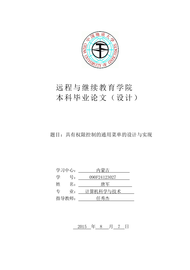 CHINA远程与继续教育学院本科毕业论文(设计)题目:具有权限控制的通用菜单的设计与实现学习中心:内蒙古学号:090F24123027姓名:唐军专业:计算机科学与技术指导教师:任秀杰2015年8_月7日中国地质大学(武汉)远程与继续教育学院毕业设计(论文)中国地质大学(武汉)远程与继续教育学院本科毕业论文(设计)指导教师指导意见表学生姓名:唐军学号:090F24123027专业计算机科学与技术毕业设计(论文)题目:具有权限控制的通用菜单的设计与实现指导教师意见:(请对论文的学术水平做出简要评述。包括选题意义;文献资料的掌握:所用资料、实验结果和计算数据的可靠性:写作规范和逻辑性;文献引用的规范性等。还须明确指出论文中存在的问题和不足之处。)本文选题符合计算机专业要求,充分体现出社会现实的需要。全文结构安排合理,层次清楚,思路清晰,观点正确,能很好的将计算机专业知识与现实生活中的问题有机地结合起来。该文在写作的过程中查阅的资料不仅充分而且与主题结合较为紧密。总体上符合计算机科学与技术专业本科毕业论文要求。指导教师结论:(合格、不合格)指导教师任秀杰所在单位指导时间姓名中国地质大学(武汉)远程与继续教育学院毕业设计(论文)中国地质大学(武汉)远程与继续教育学院本科毕业设计(论文)评阅教师评阅意见表学生姓名:唐军学号:090F24123027专业:计算机科学与技术毕业设计(论文)题目:具有权限控制的通用菜单的设计与实现评阅意见:(请对论文的学术水平做出简要评述。包括选题意义:文献资料的掌握:所用资料、实验结果和计算数据的可靠性:写作规范和逻辑性:文献引用的规范性等。还须明确指出论文中存在的问题和不足之处。)修改意见:(针对上面提出的问题和不足之处提出具体修改意见。评阅成绩合格,并可不用修改直接参加答辩的不必填此意见。)毕业设计(论文)评阅成绩(百分制):评阅结论:(同意答辩、不同意答辩、修改后答辩)评阅人姓名所在单位评阅时间2