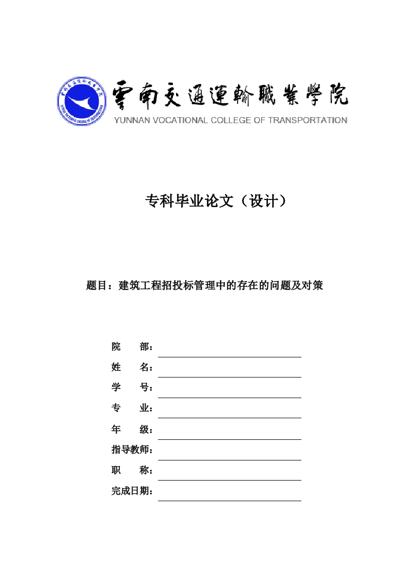 YUNNAN VOCATIONAL COLLEGE OF TRANSPORTATION专科毕业论文(设计)题目:建筑工程招投标管理中的存在的问题及对策院部:姓学号:专业年指导教师:职称:完成日期:建筑工程招投标管理中的存在的问题及对策摘要招投标作为建筑工程承包的主要形式,在我国的工程项目建设中得到了广泛的实施,它是市场经济的重要调节手段,不仅实现了良性竞争,还进一步规范了建筑市场的秩序,实现了资源配置的优化整合,形成了优胜劣汰的市场机制。在招标投标的实施过程之中,由于招投标流程比较繁琐、涉及的相关人员也较多、行业潜规则盛行、市场配套服务不够完善、监管不到位等原因,在操作过程中时常发生相关环节的错位和缺失等现象,给部分投机者钻了空子,出现了许多不正当竞争,影响了招投标的公平公正,招投标工作制度和管理机制不完善、法律制度不健全、存在漏洞和薄弱环节等也随之暴露出来,急需采取一些切实可行的措施来解决问题,确保实现招投标管理的规范化和招投标市场的健康、稳步发展。关键词:工程项目:招投标:招投标规范化目录摘要目绪论1第1章工程项目招投标的相关理论21.1工程项目招投标的概念及原则…21.1.1工程项目招投标的概念21.1.2工程项目招投标的原则.…21.2工程项目招投标的应用范围.21.3工程项目招投标流程.…3第2章工程项目招投标过程中存在的问题及原因分析.…42.1工程项目招投标存在的问题…42.1.1招标代理机构业务水平不足,操作不规范…2.1.2投标人行为不规范.52.1.3低价中标存在欺诈风险.52.2工程项目招投标问题的原因分析52.2.1投标行业潜规则盛行,规范化不够..52.2.2投标市场的服务尚不完善.62.2.3工程投标中政府监管力度不够第3章解决工程项目招投标过程中存在问题的对策3.1合理规范招标文件编制…73.2整治投标人不规范行为.3.3规范评标过程管理结论9参考文献…致谢….11