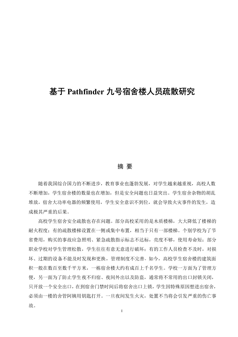 基于Pathfinder九号宿舍楼人员疏散研究摘要随着我国综合国力的不断进步,教育事业也蓬勃发展,对学生越来越重视,高校人数不断增加,学生宿舍楼的数量也在增加,但是安全问题也日益突出。学生宿舍杂物的胡乱堆放,宿舍大功率电器的频繁使用,学生安全意识不到位,就会导致火灾事件的发生,造成极其严重的后果。高校学生宿舍安全疏散也存在问题。部分高校采用的是木质楼梯,大大降低了楼梯的耐火程度:有的疏散楼梯设置在一侧或集中布置,相当于只有一部楼梯。个别学校为了节省费用,购买的事故应急照明、紧急疏散指示标志不达标,亮度不够,使用寿命短:部分职业学校对学生管理松散,学生往往有意无意进行破坏:有的工作人员检查不及时,对损坏、过期的设备不能及时发现和更换,管理制度不完善。如今,高校学生宿舍楼的建筑面积一般在数百至数千平方米,一栋宿舍楼大约有成百上千名学生。学校一方面为了管理方便,另一面为了防止学生夜不归宿、夜间外出以及防盗,通常将不常用的出口封锁关闭,只开放一个安全出口,在到宿舍门禁时间后将宿舍出口上锁,学生因特殊原因想进出宿舍,必须由一楼的舍管阿姨用钥匙打开。一旦夜间发生火灾,处置不当将会引发严重的伤亡事故。由于人员的疏散是一个复杂的系统,应急疏散演练活动受时间、心理、身体、外部环境因素的影响,往往与实际疏散结果存在一定的差异,并不能达到预期的疏散效果,同时还会花费巨大的人力、物力和财力。所以,采用先进的计算机仿真技术对人员疏散进行研究,是当前该领域的一个重大课题。首先本课题通过对国内外现状进行了一系列分析,总结相关的理论知识和研究趋势。在理论研究的基础上,针对宿舍楼的结构特点,分析出影响学生疏散的因素,并利用Pathfinder软件对九号宿舍楼进行建模和仿真实验,设置不同因素对学生宿舍楼火灾疏散时间的影响,通过数据分析发现疏散中存在的问题,针对模型中的问题,进行优化设计,从而大大降低学生在宿舍火灾疏散中所用的时间,同时对学生疏散进行了评价并提出相关建议和措施,以确保学生宿舍发生意外事故时,学生可以安全迅速撤离。关键词:学生宿舍:模拟仿真;应急疏散AbstractWith the continuous progress of China's comprehensive national strength,education is alsobooming,more and more attention is paid to students,the number of colleges and universities isincreasing,the number of students'dormitory buildings is also increasing,but the safety problemis increasingly prominent.Students'dormitories are piled up randomly,high-power electricalappliances are frequently used in dormitories,and students'safety awareness is not in place,which will lead to the occurrence of fire events,resulting in extremely serious consequences.There are also problems in the safe evacuation of College Students'dormitories.Somecolleges and universities use wooden stairs,which greatly reduces the fire resistance of stairs;some evacuation stairs are set on one side or centralized layout,equivalent to only one stair.Inorder to save costs,some schools purchased emergency lighting and emergency evacuationinstruction signs that did not meet the standards,were not bright enough,and had short servicelife,which brought great inconvenience to fire evacuation work;some vocational schools hadloose management of students,and students often intentionally or unintentionally damaged;some staff did not check in time,and could not find and replace the damaged and expiredequipment in time The management system is not perfect.Nowadays,the building area ofCollege Students'dormitory building is generally hundreds to thousands of square meters,andthere are about hundreds of students in a dormitory building.On the one hand,in order tofacilitate management,on the other hand,in order to prevent students from staying home at night,going out at night and guarding against theft,the exits that are not commonly used are usuallyblocked and closed,and only one exit is opened.After the access time to the dormitory,the exitof the dormitory is locked.If students want to enter or leave the dormitory for special reasons,they must be opened by the dormitory management aunt on the first floor with a key.In case offire at night,improper handling will cause serious casualties.Because the evacuation of personnel is a complex system,the emergency evacuation drillactivity is affected by time,psychology,body and external environment factors,and often hassome differences with the actual evacuation results,which can not achieve the expectedevacuation effect,but also costs huge human,material and financial resources.Therefore,usingadvanced computer simulation technology to study personnel evacuation is an important topic in