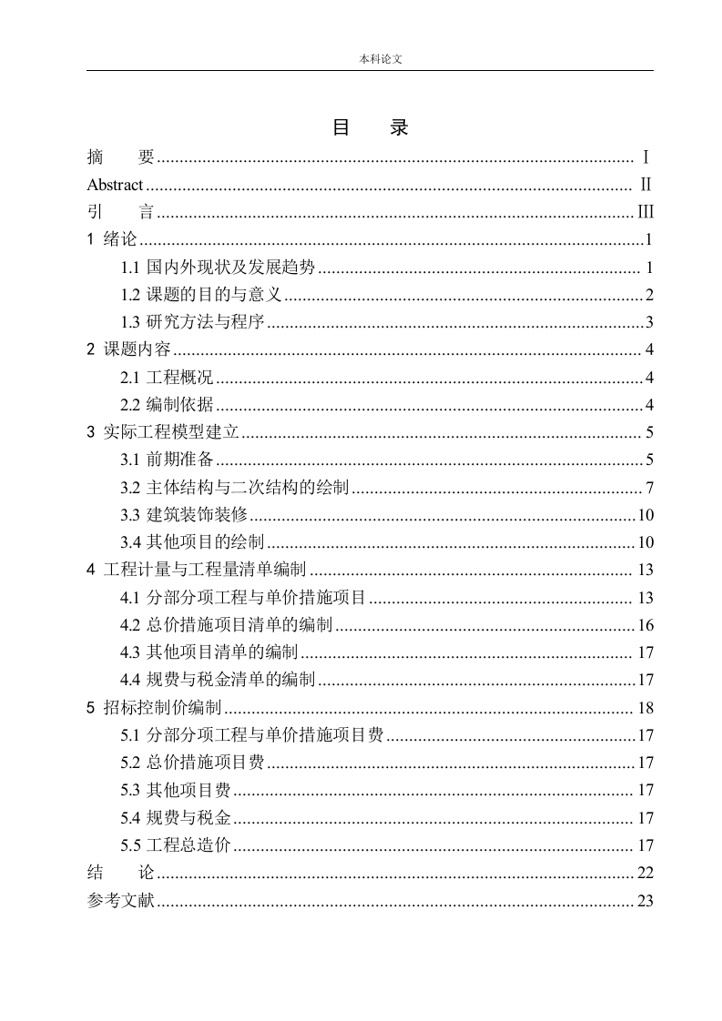 本科论文目录摘要Abstract...........引言1绪论1.1国内外现状及发展趋势1.2课题的目的与意义.…1.3研究方法与程序32课题内容.2.1工程概况2.2编制依据3实际工程模型建立3.1前期准备3.2主体结构与二次结构的绘制3.3建筑装饰装修3.4其他项目的绘制104工程计量与工程量清单编制…134.1分部分项工程与单价措施项目134.2总价措施项目清单的编制164.3其他项目清单的编制.…174.4规费与税金清单的编制.…5招标控制价编制185.1分部分项工程与单价措施项目费175.2总价措施项目费175.3其他项目费175.4规费与税金175.5工程总造价17结论22参考文献23本科论文附录125附录2.…26附录338附录4.3940致41本科论文摘要一个工程建设管理项目投资管理的重要内容组成不能缺少一个工程项目投资造价的合理确定与预算控制,它必须能够在一个工程建设投资项目的整个建设过程中有效率地采取措施,并且将整个项目的整体建设过程中发生的投资费用限额控制在国家规定的预算限额中,达到合理充分使用现有人力、物力、财力以利于获得最大化的投资经济效益的管理目的。本次毕业设计以“沈阳职业技术学院3#宿舍楼项目招标控制价的编制”为题目。本论文主要用于论述一个建设项目在工程招标前期工程造价阶段的全过程以及在此过程中的拓展与延伸。设计工作之初,需要查阅和汇总《招投标与合同管理》中的相关内容,以及建设工程招投标文件的实际编制方法等,确定招标文件编制的具体框架。毕业设计的过程中,首先运用广联达BM土建计量平台GTJ2018按顺序托别绘制主体结构、二次结构,后绘制建筑装饰装修和其他项目,采用手动方式计算无法电算的工程量,先对分部分项工程量清单进行一定的调整,再对单价措施项目清单进行修整,根据相关规定和市场价对总价措施项目清单的整合与编制,通过各基数王成规费与税金项目清单的汇总编制,将分部分项工程和单价措施项目费的汇总,然后将其他项目费与总价措施项目费进行调整,根据基数和相应的费率完成规费与税金的编制,最终得到工程总造价。最终得到招标建筑装饰造价为22361424.81元,这包括安全措施费455355.49元,规费889831.66元。关键词:招标控制价:工程计量:工程量清单编制