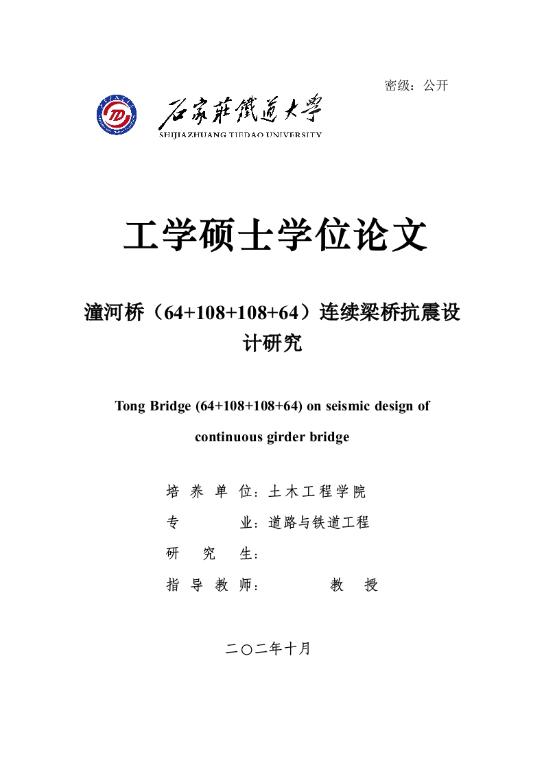 密级:公开工学硕士学位论文潼河桥(64+108+108+64)连续梁桥抗震设计研究Tong Bridge (64+108+108+64)on seismic design ofcontinuous girder bridge培养单位:土木工程学院专业:道路与铁道工程研究生:指导教师:教授摘要摘要地壳岩石在地球内力的作用下,发生错位或断裂,从而导致的震动,这种效果就叫做地震。地震在发生破坏时,兼具能量大、范围广和难以预测等特点,在地震几十秒的持续作用时间内,能够造成巨大的生命及财产损失,与其他自然灾害相比,其突发性和破坏性的特点尤为突出。汶川地震中部分连续桥梁受损破坏,使桥梁工程的抗震设计获得了重视。提托潼河桥,基于模态分析、瞬态动力法研究了依托工程-潼桥在三种不同的地震波作用下的动力响应。获得结论如下:(1)针对矮墩高度以及是否考虑桩土效应,建立了4种不同工况,对潼河桥三维模型进行了模态分析。结果表明:1)矮墩高度减小后,结构整体刚度增加,桥梁自振频率随之变大,并且桥的振型也随之改变。即:矮墩高度变化后,桥梁的动力特性随之改变:2)是否考虑桩土效应对结构自振频率有影响,若不考虑,结构的各阶自振频率略有升高。(2)基于瞬态动力法研究了依托工程-潼桥在三种不同的地震波作用下的动力响应。结果表明:1)E波与T波作用下主梁的位移及内力较为接近,但明显大于人工波:最大竖向位移出现于主梁跨中截面以及靠近矮墩边跨梁跨中截面处。最小竖向位移出现于边跨根部,只占跨中位移的6%左右:2)同一种地震波作用下,结构各截面纵向位移十分接近,且最大值均出现在高墩边跨梁根部截面处:3)最大剪力值均出现在主梁跨中截面,弯矩最大位置均在墩边跨根部:4)不同地震波作用下,墩顶和墩中的纵向位移、剪力和弯矩均有不同,E波、T波作用下结构响应较大,人工波作用下响应较小。关键词:预应力混凝土梁桥:地震:模态:一致激励AbstractAbstractEarthquakes are vibrations caused by dislocation or rupture of the earth's crustunder the influence of the earth's internal forces.The earthquake destructive energyand damage characteristics of a wide range and it is difficult to predict,theearthquake often lasts only tens of seconds,but may cause huge loss of life andproperty,the sudden and devastating natural disasters can not be compared to other.In the Wenchuan earthquake,some continuous bridges were damaged and damaged,which made the seismic design of bridge engineering pay more attention to.Tito Tong Bridge,modal analysis,transient dynamic method based on theproject-Tong Bridge in three kinds of seismic waves under different responses basedon the.Conclusions are as follows:(1)for the short pier height and considering the effect of pile and soil,established 4 different conditions,the three-dimensional model of the Tong Bridgemodal analysis is carried out.The results show that:1)after the height of the pierdecreases,the overall stiffness of the structure increases,the natural frequency of thebridge becomes larger,and the vibration mode of the bridge changes accordingly.That is to say,when the height of the short pier is changed,the dynamiccharacteristics of the bridge will change;2)whether the pile-soil effect should beconsidered in response to the natural frequencies of the structure;if not considered,the natural frequencies of the structures are slightly increased.(2)transient dynamic method based on the study of the power in the three kindsof seismic waves under different response based on the project -Tong bridge.Theresults show that:1)the displacement and internal force of the main beam under theaction of E wave and T wave are close,but obviously larger than the artificial wave;the maximum vertical displacement occurs at the midspan section of the main girderand near the cross section of the cross section of the short pier side.The minimumvertical displacement in side span root,only about 6%of the midspan displacement;2)effects of the same kinds of seismic waves,the longitudinal displacement of structure