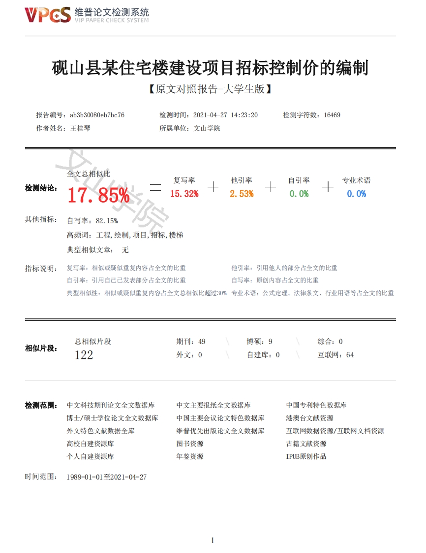 维普论文检测系统/IP PAPER CHECK SYSTEM砚山县某住宅楼建设项目招标控制价的编制【原文对照报告-大学生版】报告编号:ab3b30080eb7bc76检测时间:2021-04-2714:23:20检测字符数:16469作者姓名:王桂琴所属单位:文山学院全文总相似比复写率他引率自引率专业术语检测结论:17.85%15.32%2.53%0.0%0.0%其他指标:自写率:82.15%高频词:工程,绘制,项目,招标,楼梯典型相似文章:无指标说明:复写率:相似或疑似重复内容占全文的比重他引率:引用他人的部分占全文的比重自引率:引用自己已发表部分占全文的比重自写率:原创内容占全文的比重典型相似性:相似或疑似重复内容占全文总相似比超过30%专业术语:公式定理、法律条文、行业用语等占全文的比重总相似片段期刊:49博硕:9综合:0相似片段:122外文:0自建库:0互联网:64检测范围:中文科技期刊论文全文数据库中文主要报纸全文数据库中国专利特色数据库博士/硕士学位论文全文数据库中国主要会议论文特色数据库港澳台文献资源外文特色文献数据全库维普优先出版论文全文数据库互联网数据资源/互联网文档资源高校自建资源库图书资源古籍文献资源个人自建资源库年鉴资源IPUB原创作品时间范围:1989-01-01至2021-04-27维普论文检测系统VIP PAPER CHECK SYSTEM原文对照颜色标注说明:■自写片段■复写片段(相似或疑似重复)口引用片段(引用)■专业术语(公式定理、法律条文、行业用语等)山文山学院WENSHAN UNIVERSITY砚山县某住宅楼建设项目招标控制价的编制学院:人工智能学院专业:工程管理年级:2017级姓名:王桂琴学号:2019120103ZB104导师及职称:徐崇峰助教2020年4月毕业论文(设计)原创性声明本人所呈交的毕业论文(设计)是我在导师的指导下进行的研究工作及取得的研究成果。据我所知,除文中已经注明引用的内容外,本论文(设计)不包含其他个人已经撰写或发表过的研究成果。对本论文(设计)的研究做出重要贡献的个人和集体,均已在文中作了明确说明并表示谢意。作者签名:王桂琴日期:2021年4月30日毕业论文(设计)授权使用说明本论文(设计)作者完全了解文山学院有关保留、使用学生毕业论文(设计)的规定,学校有权保留论文(设计)并向相关部门送交论文(设计)的电子版和纸质版。有权将论文(设计)用于非赢利目的的少量复制并允许论文(设计)进入学校图书馆被查阅。学校可以公布论文(设计)的全部或部分内容。保密的论文(设计)在解密后适用本规定。作者签名:王桂琴指导教师签名:日期:2021年4月30日日期:2021年4月30日王桂琴毕业论文(设计)答辩小组成员名单2VPCS维普论文检测系统VIP PAPER CHECK SYSTEM姓名职称单位备注徐崇峰助教文山学院组长邹敏教授文山学院周平副教授文山学院答辩秘书摘要招标控制价是招标人根据国家或省级、行业建设主管部门颁发的有关计价依据和办法,以及拟定的招标文件和招标工程量清单,结合工程具体情况编制的招标工程的最高投标限价.本毕业设计主要说明砚山县某住宅楼建设项目的招标控制价编制的整个过程,重点说明工程计量和计价两方面内容.设计采用了广联达软件来辅助算量和计价,毕业设计的主要步骤为:将图纸信息输入到软件中,运用软件建立3D模型汇总计算工程量后,将算量成果文件导入计价软件中,编制工程量清单,综合计费取税后求建安工程造价,最终生成招标控制价报表.算量计价过程主要分为两个方面:一是运用广联达GTJ2018土建算量软件计算钢筋工程量与土建工程量,二是运用广联达计价软件GCCP6.0计算建安工程费关键词:工程造价:招标控制价:广联达软件目录1引言12工程概况13招标控制价概述23.1招标控制价的定义2学院3.2招标控制价的作用24招标控制价编制说明24.1编制内容34.2编制范围34.3编制依据44.4编制要点45图纸识图45.1结构施工图45.1.1结构设计说明45.1.2基础平面图45.1.3柱配筋图55.1.4梁板配筋图55.2建筑施工图65.2.1平面图65.2.2立面图75.2.3剖面图75.2.4楼梯详图86建立模型及工程量计算96.1钢筋工程96.1.1工程设计106.1.2基础层绘制126.1.3柱绘制146.1.4梁绘制156.1.5板绘制166.1.6砌体墙绘制176.1.7单构件输入186.1.8汇总计算196.2土建工程203