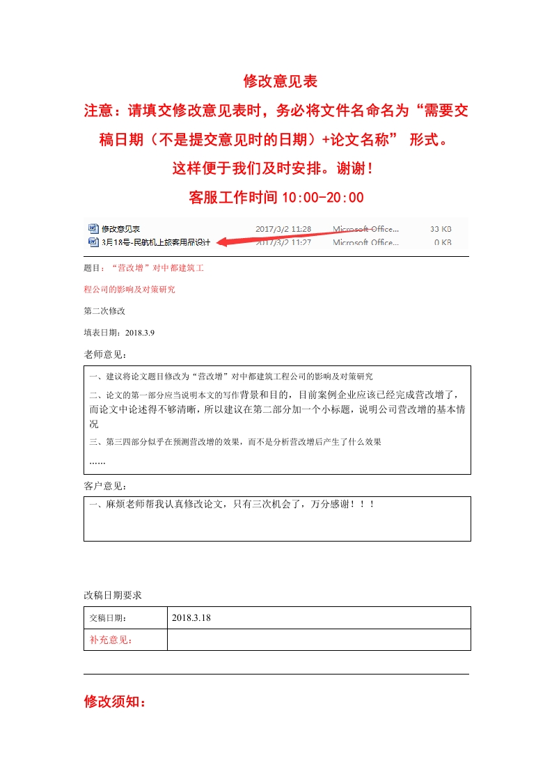 修改意见表注意:请填交修改意见表时,务必将文件名命名为“需要交稿日期(不是提交意见时的日期)+论文名称”形式。这样便于我们及时安排。谢谢!客服工作时间10:00-20:00则3月18号-民航机上旅客用品设计趣目:“营改增”对中都建筑工程公司的影响及对策研究第二次修改填表日期:2018.3.9老师意见:一、建议将论文趣目修改为“营改增”对中都建筑工程公司的影响及对策研究二、论文的第一部分应当说明本文的写作背景和目的,目前案例企业应该己经完成营改增了,而论文中论述得不够清晰,所以建议在第二部分加一个小标题,说明公司营改增的基本情况三、第三四部分似乎在预测营改增的效果,而不是分析营改增后产生了什么效果客户意见:、麻烦老师帮我认真修改论文,只有三次机会了,万分感谢!!!改稿日期要求交稿日期:2018.3.18补充意见:修改须知:1.因修改需要根据意见查阅相关资料,修改论文内容一般三天左右,格式小问题可以加快,硕士博士毕业论文内容五天到一周左右,如需要加急修改,请和客服详谈。2笼统的意见,恕不修改。您要说出详细修改的意见哦,否则我们也不清楚您的想法。2.请不要将意见一点一点的提出来,请全部整理好以后,一次性发给我们,单独的意见不予受理。3.在与初衷无明显出入、不改变题目、文章整体思路和大框架的前提下,免费修改。换题目、大修改视为重写,不予免费。4.凡在成文后换题、追加、细化写作要求,属买家本身的责任,恕不免费修改,敬请谅解。